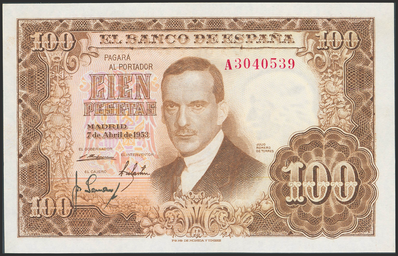 100 Pesetas. 7 de Abril de 1953. Serie A. (Edifil 2023: 464a). Apresto original. SC.