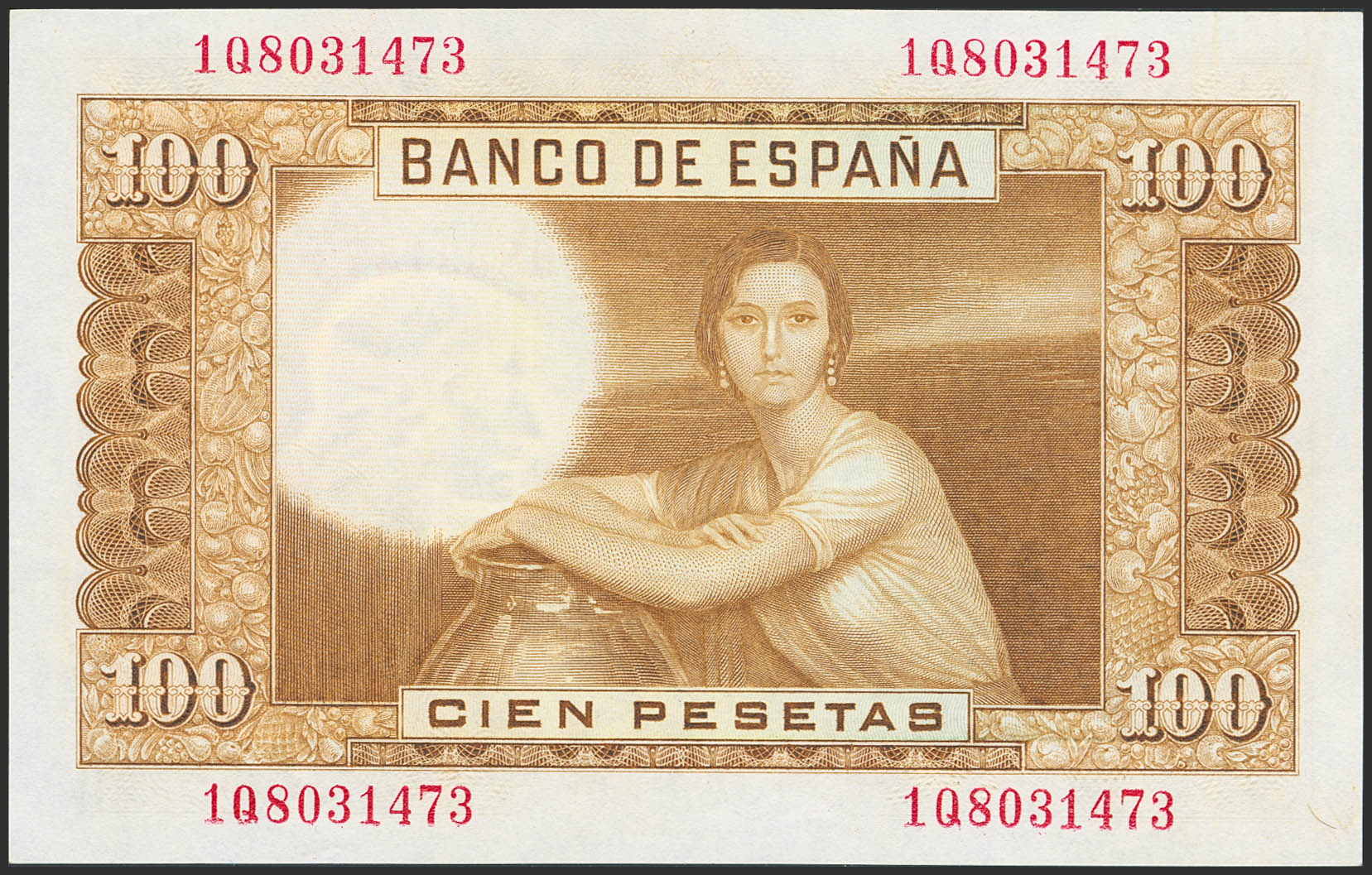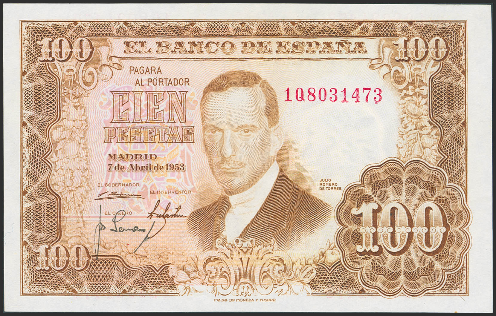 100 Pesetas. 7 de Abril de 1953. Serie 1Q. (Edifil 2023: 464c). Apresto original. SC.