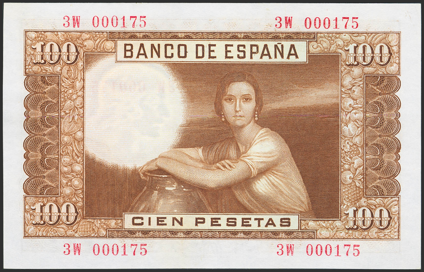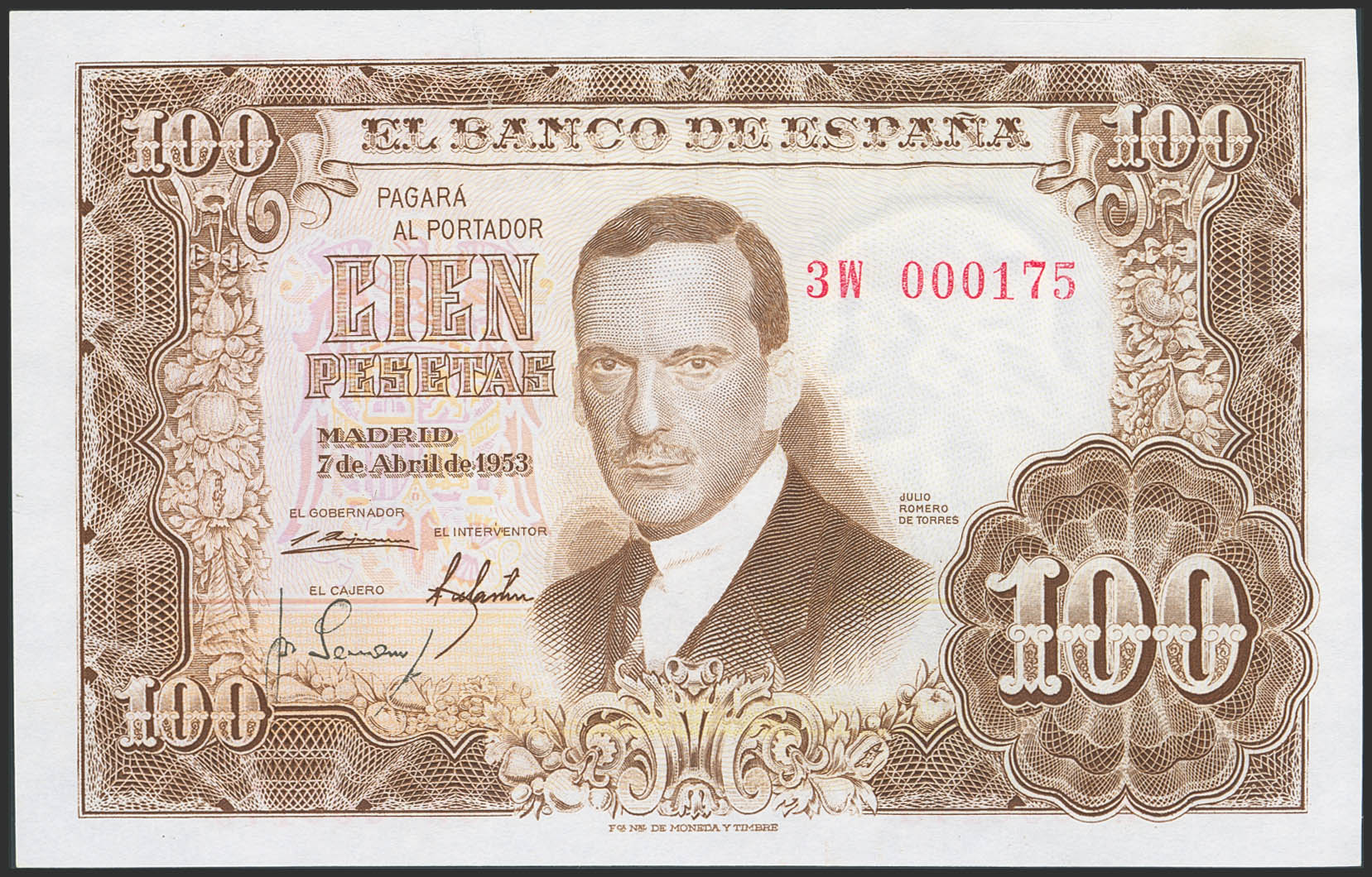 100 Pesetas. 7 de Abril de 1953. Serie 3W y numeración bajísima (Nº000175). (Edifil 2023: 464c). Conserva todo su apresto original. EBC+++.