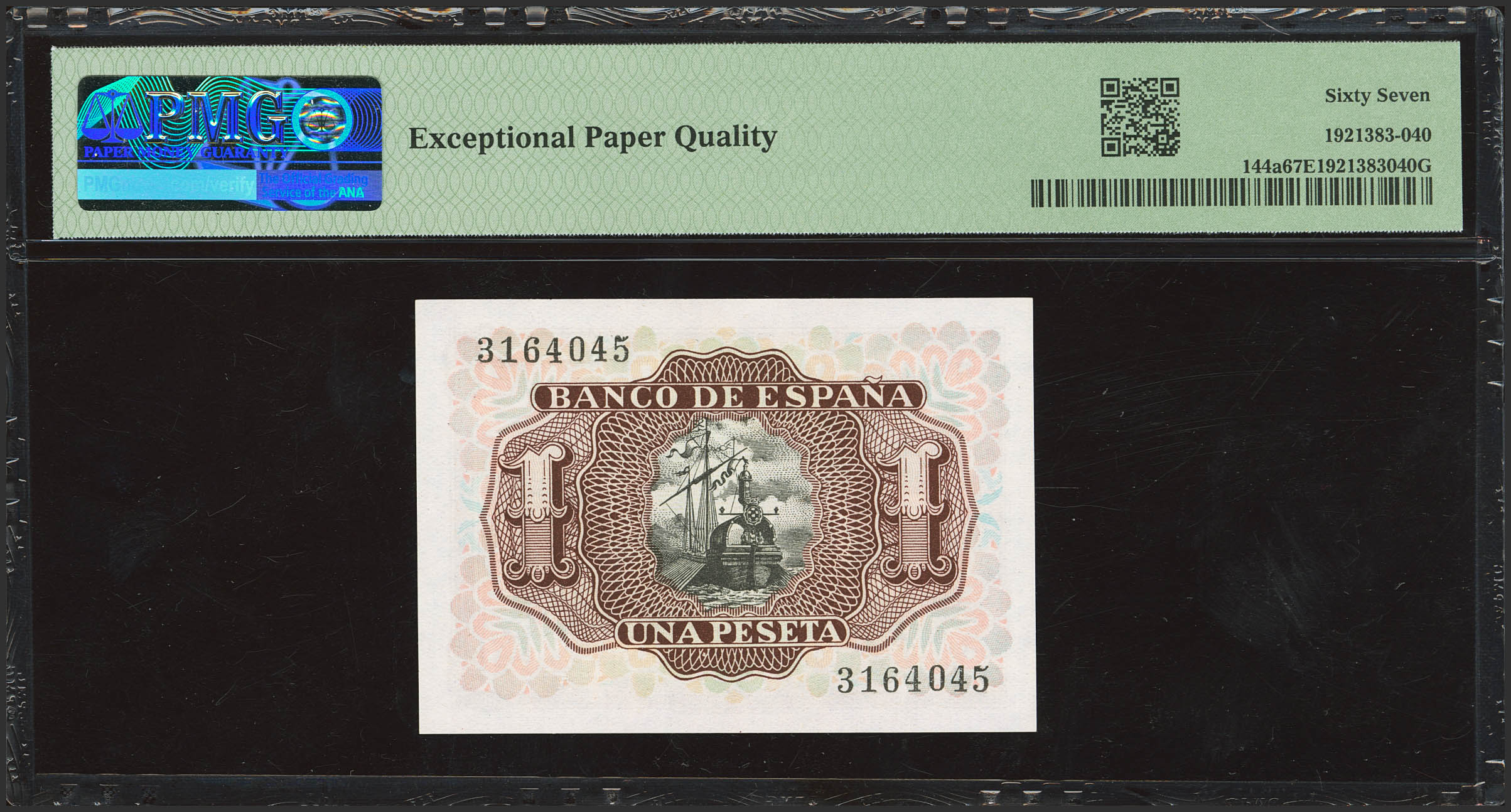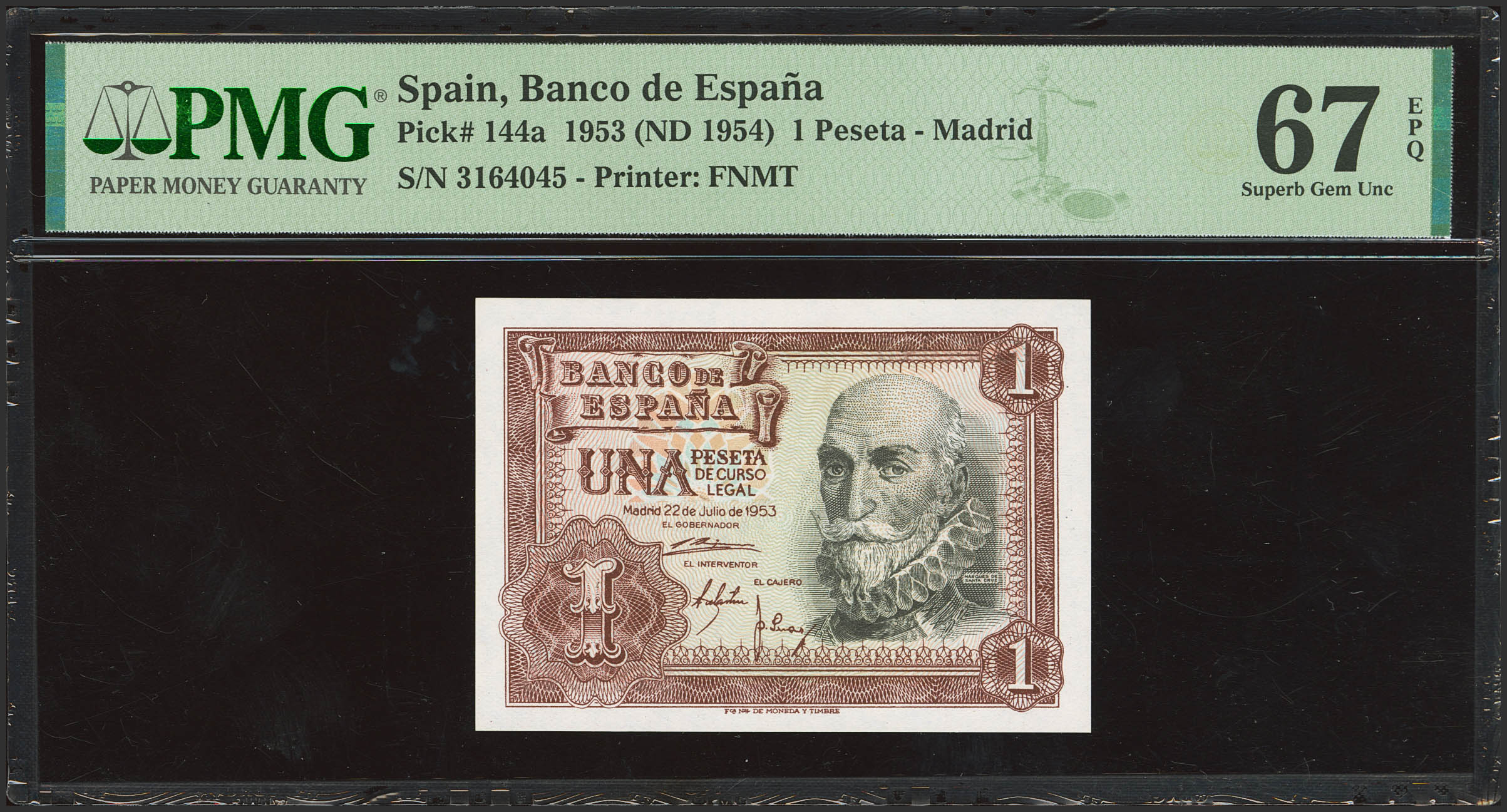 1 Peseta. 22 de Julio de 1953. Sin serie. (Edifil 2023: 465, Pick: 144a). Apresto original. SC. Encapsulado PMG67EPQ.