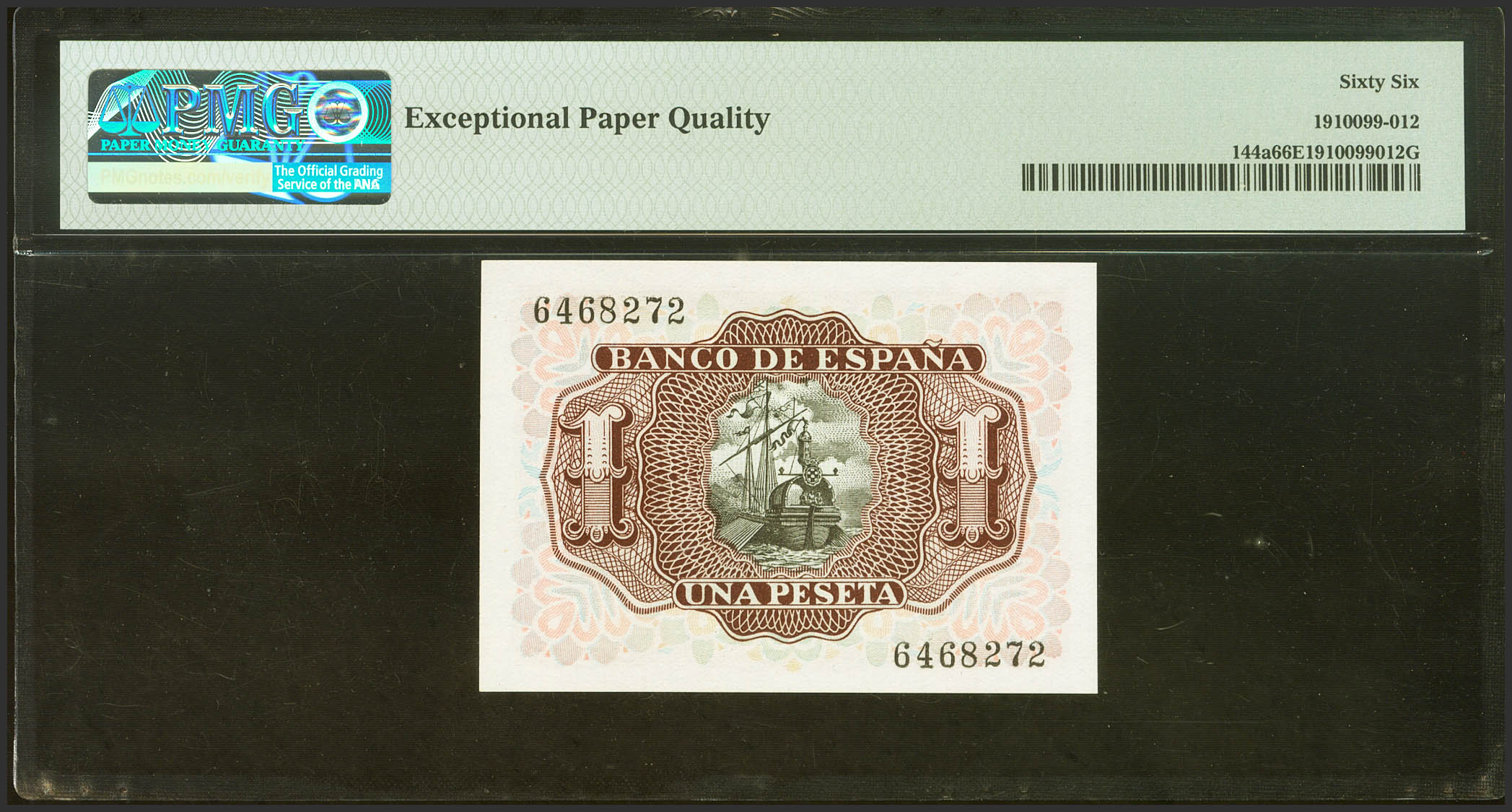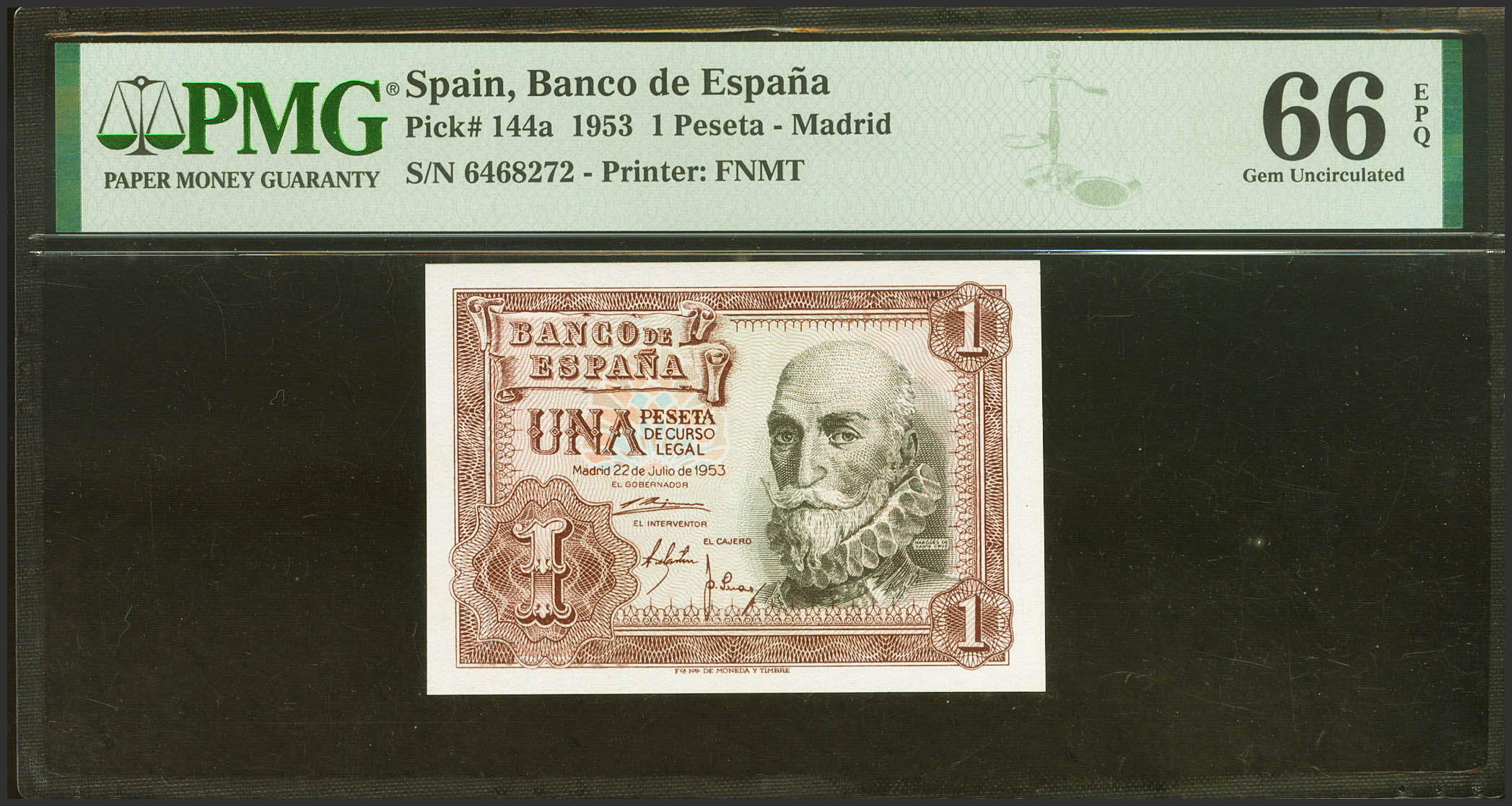 1 Peseta. 22 de Julio de 1953. Sin serie. (Edifil 2021: 465, Pick: 144a). Inusual en esta calidad, apresto original. SC. Encapsulado PMG66EPQ.