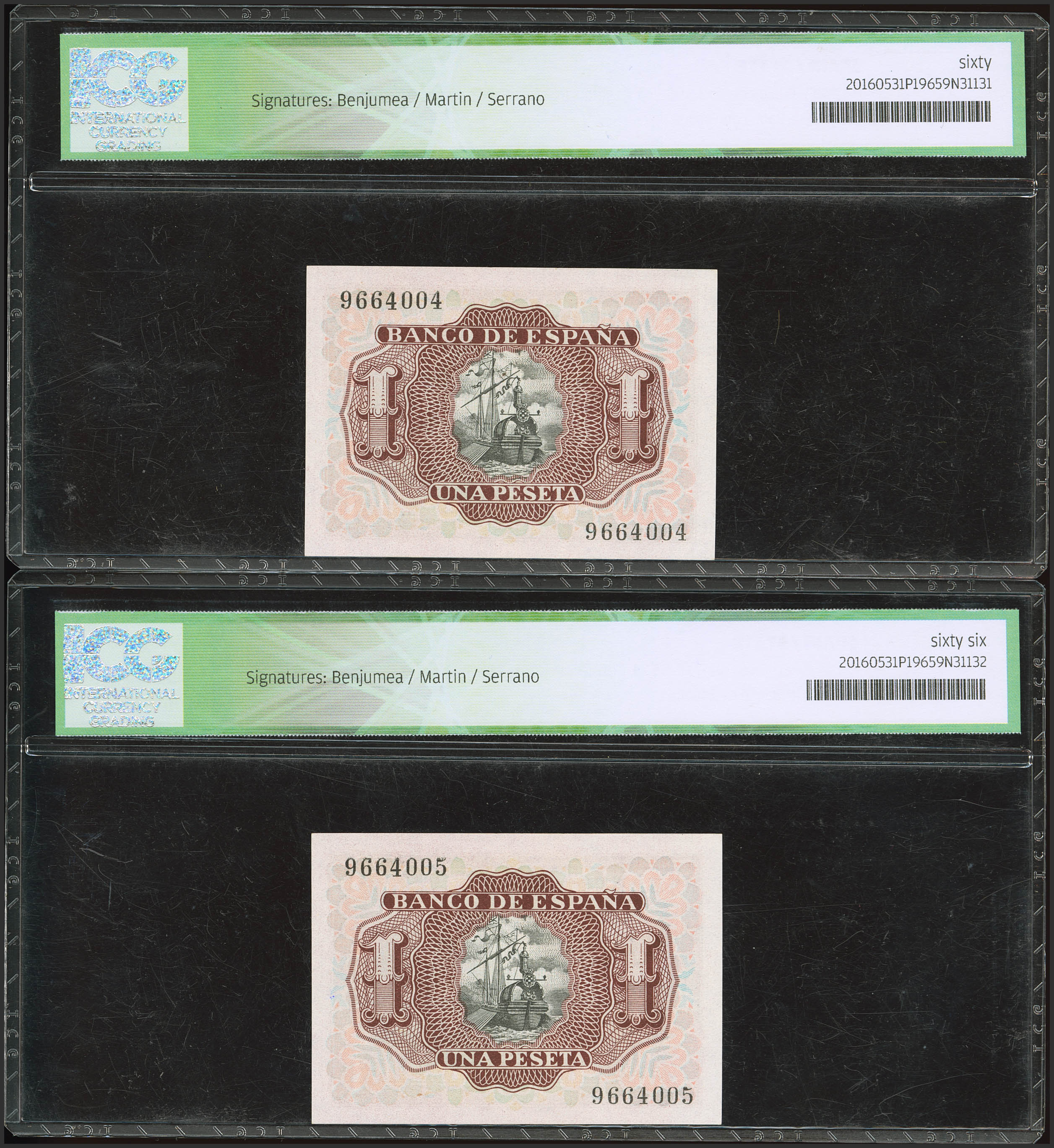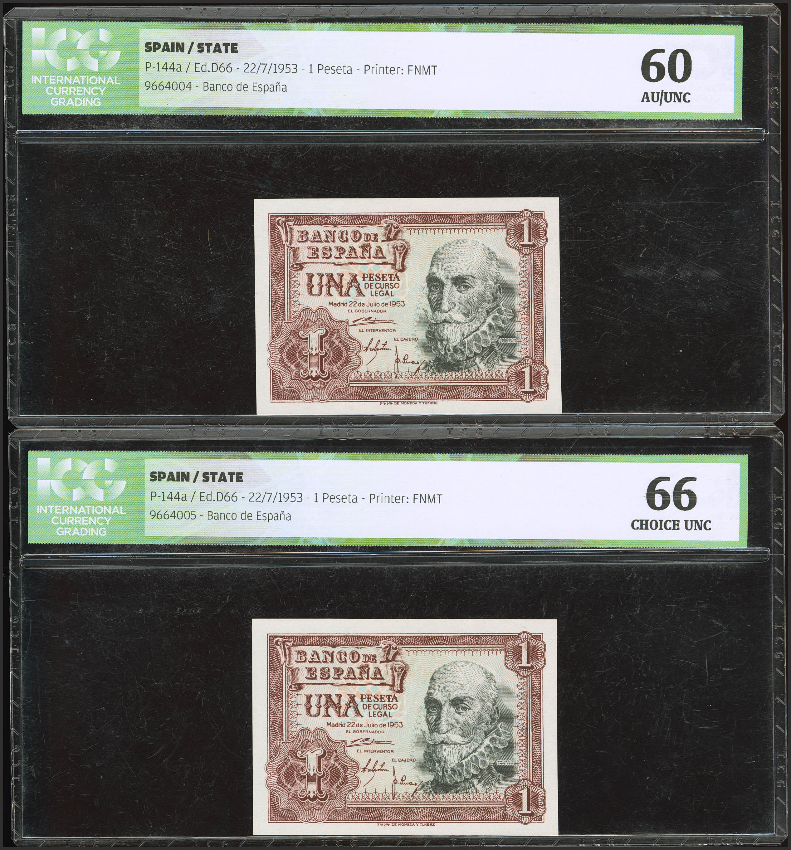 1 Peseta. 22 de Julio de 1953. Pareja correlativa. Sin serie. (Edifil 2023: 465, Pick: 144a). SC/SC-. Encapsulados ICG66/60.