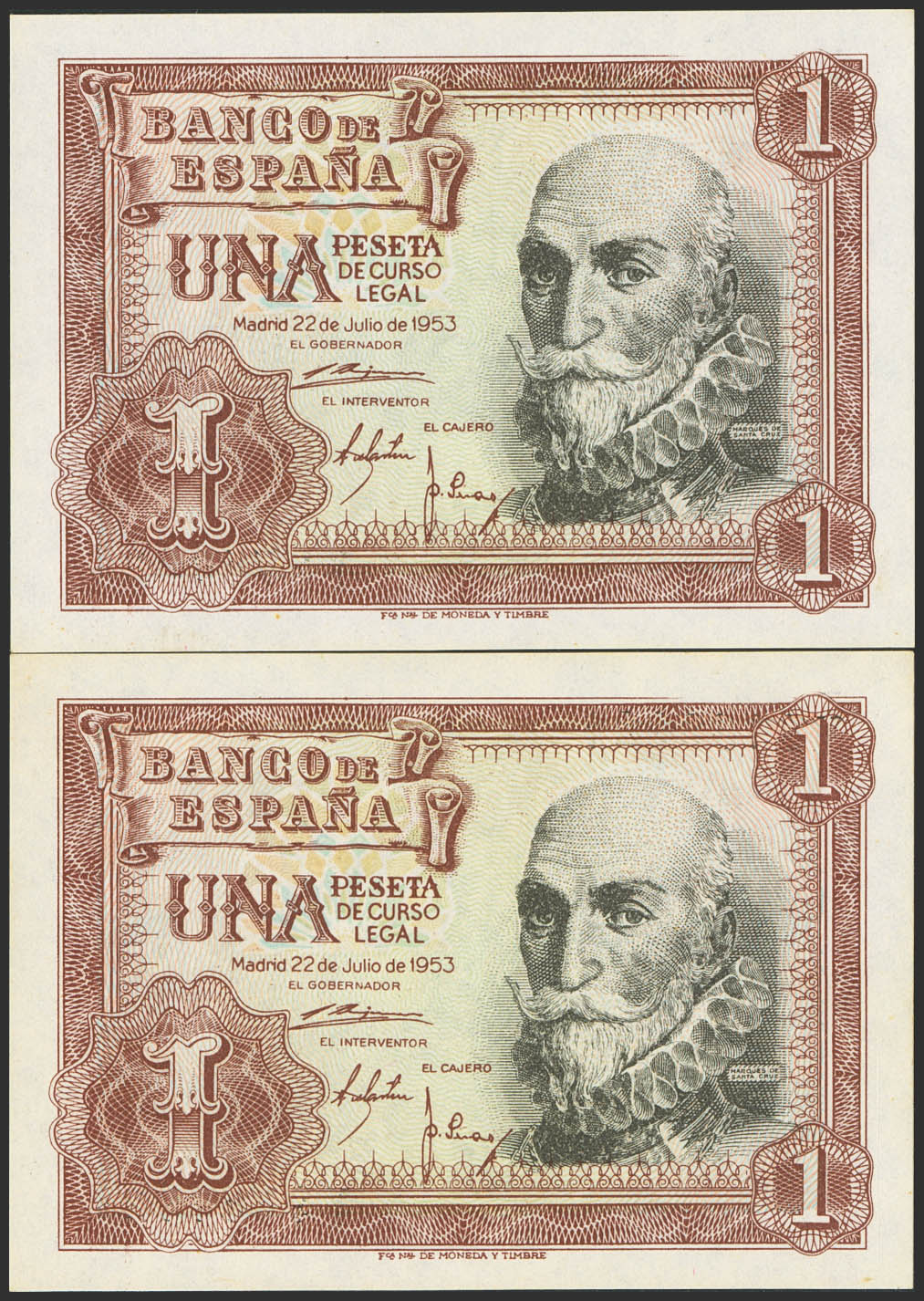1 Peseta. 22 de Julio de 1953. Pareja correlativa. Serie Y. (Edifil 2023: 465a). Apresto original. SC.