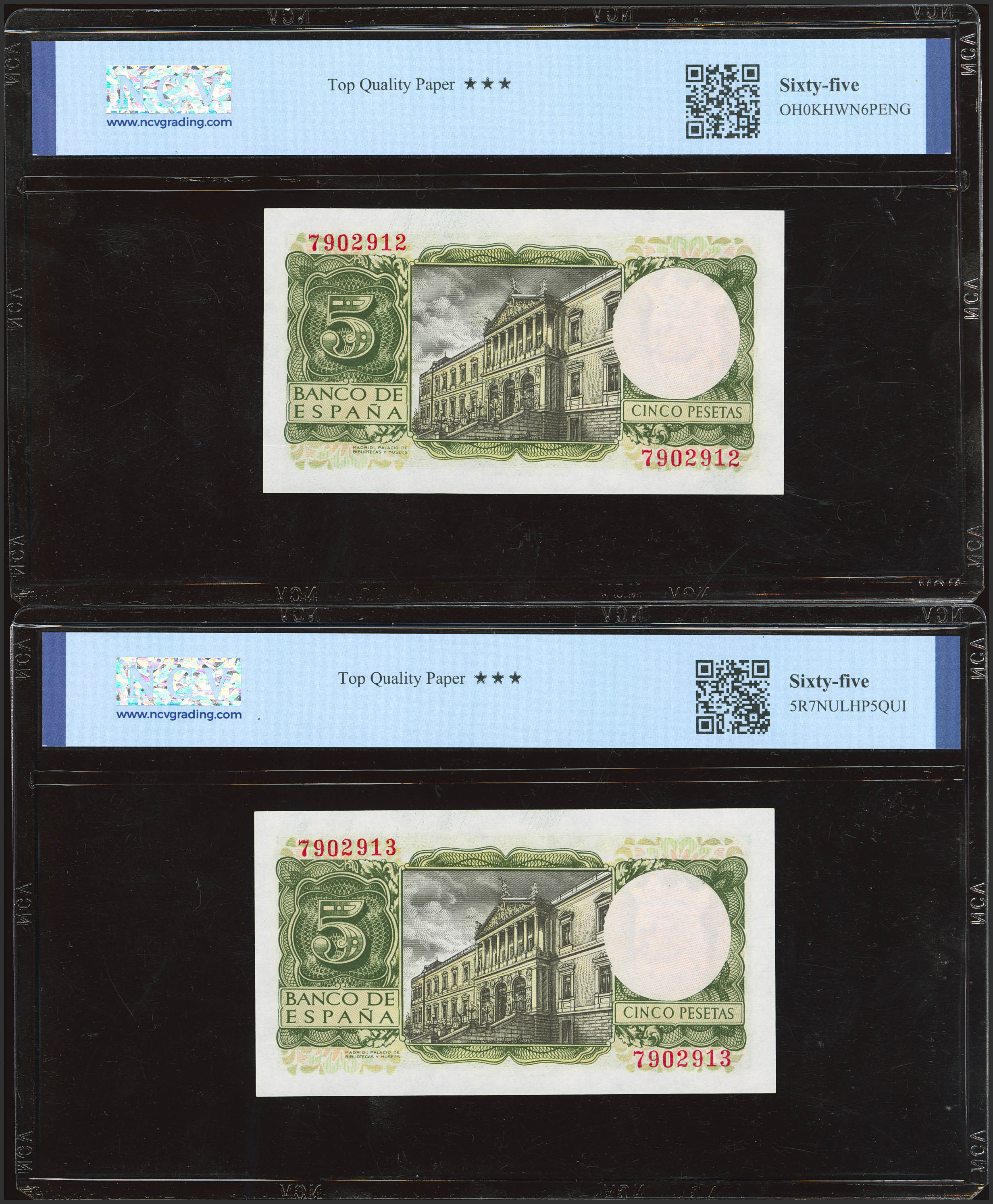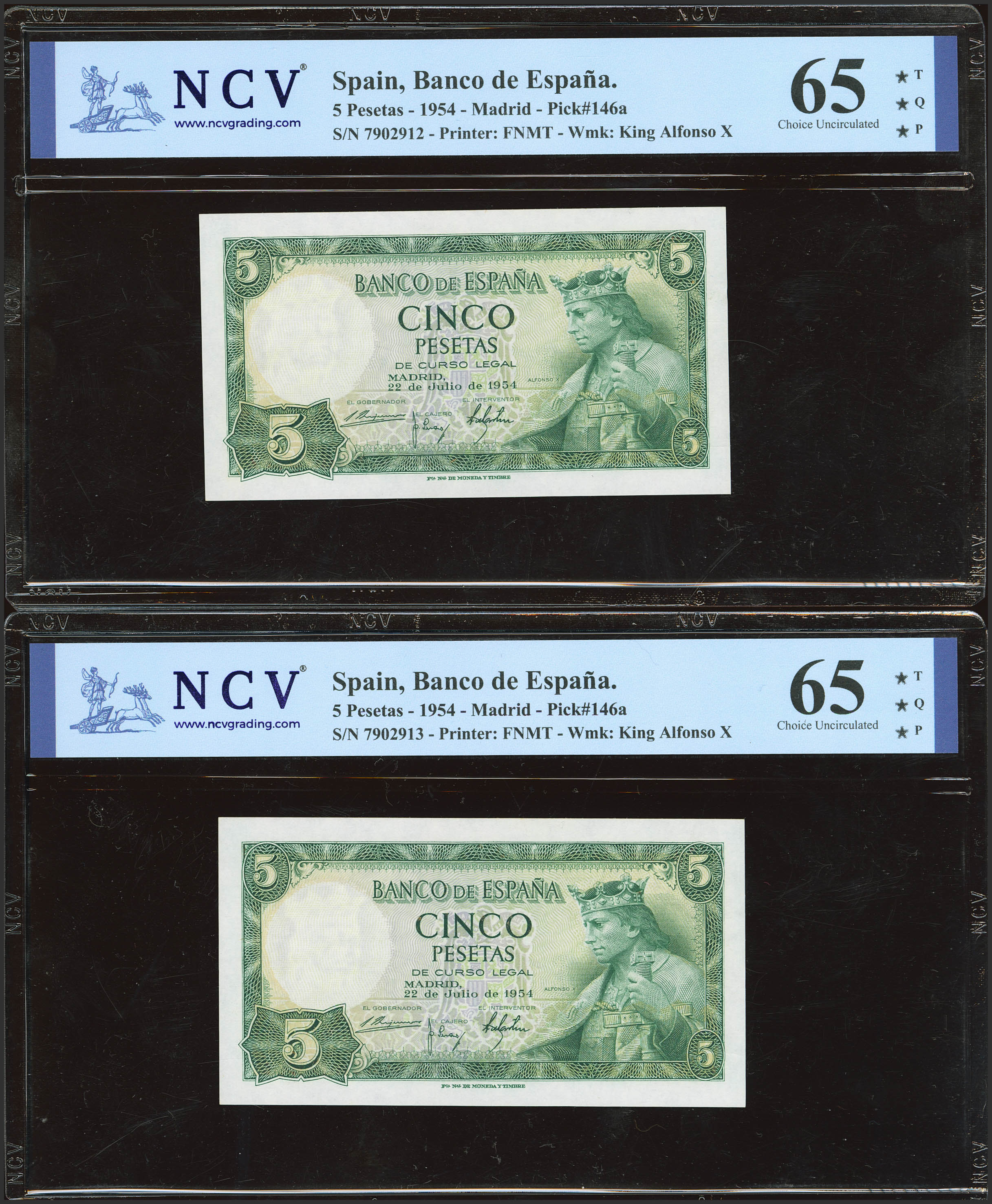 5 Pesetas. 22 de Julio de 1953. Pareja correlativa. Sin serie. (Edifil 2023: 466, Pick: 146a). Apresto original. SC. Encapsulados NCV65TPQ, ambos.