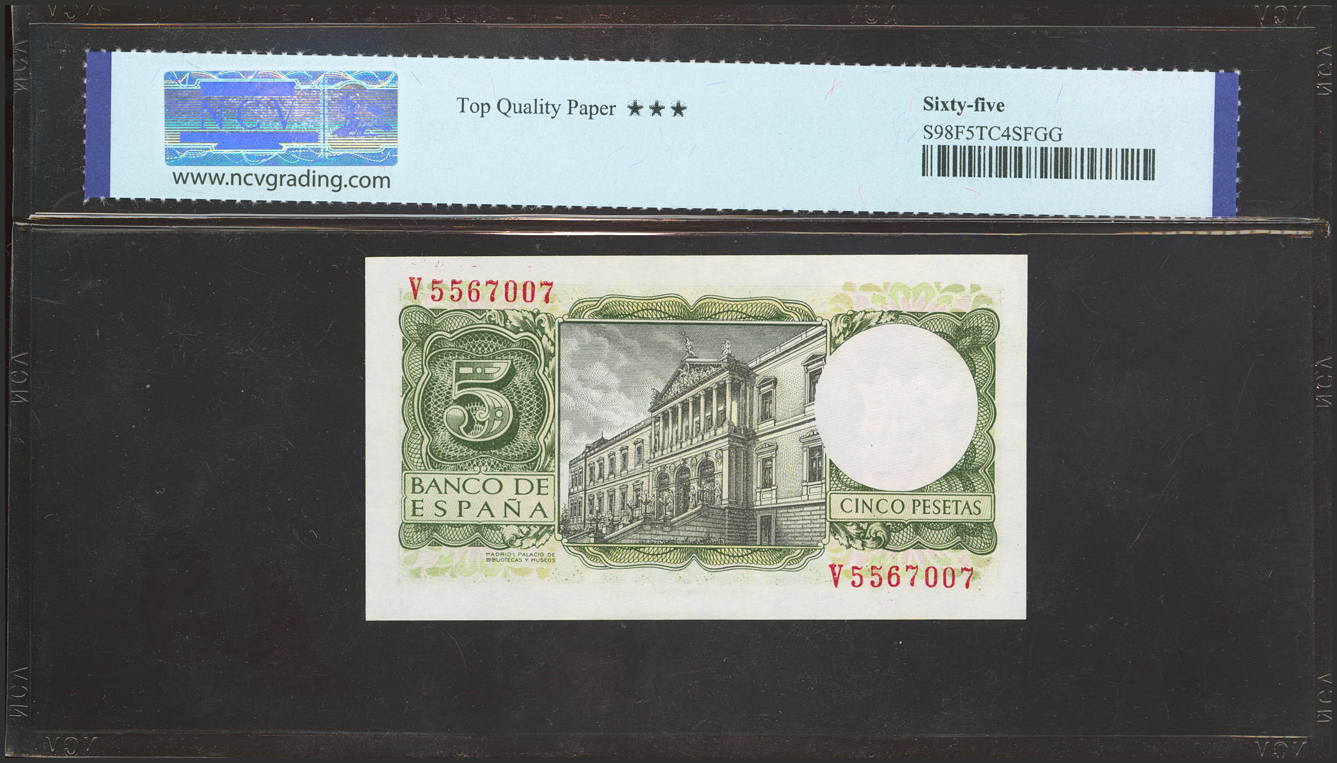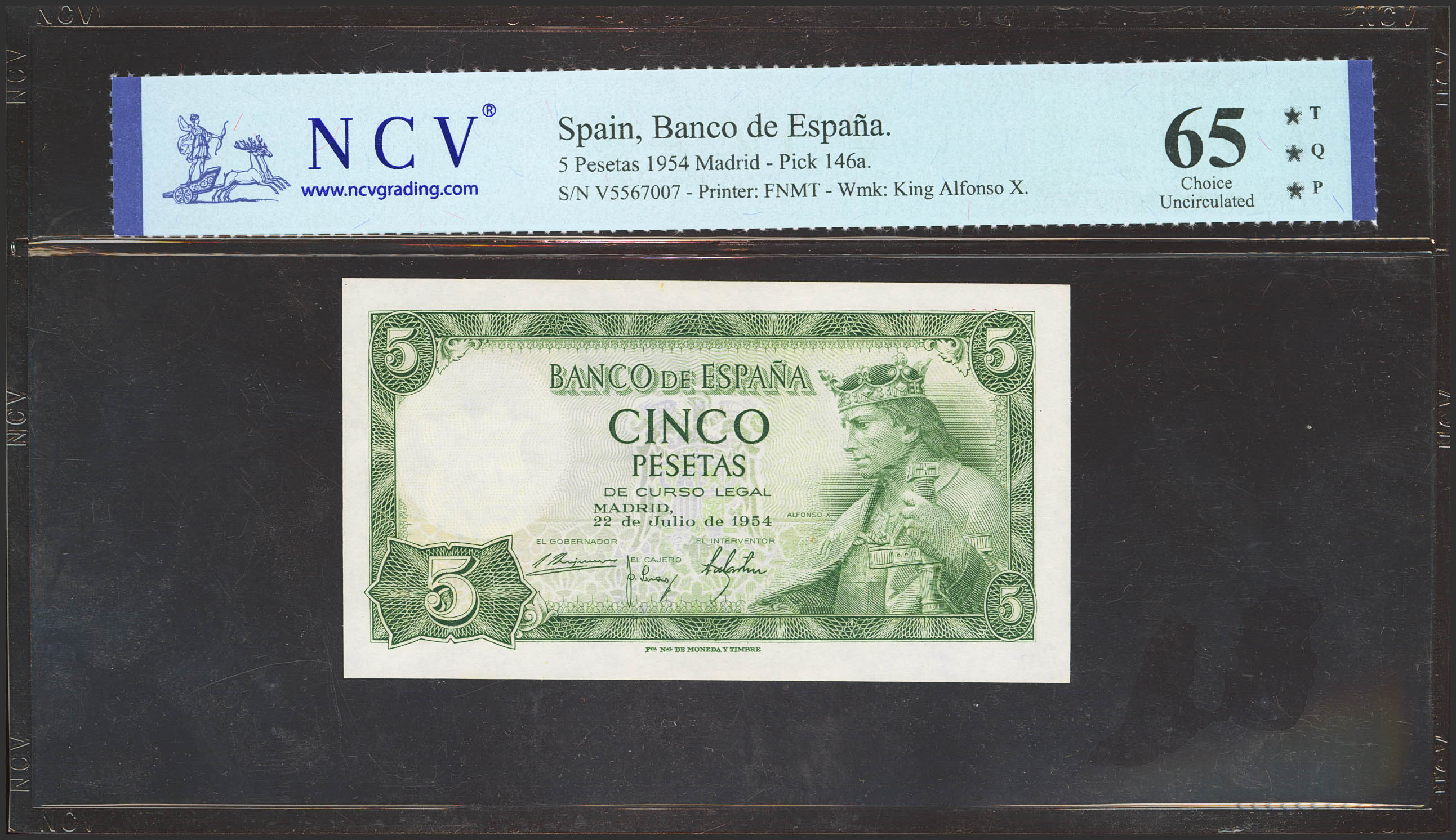 5 Pesetas. 22 de Julio de 1954. Serie V. (Edifil 2023: 466a, Pick: 146a). Apresto original. SC. Encapsulado NCV65TQP.