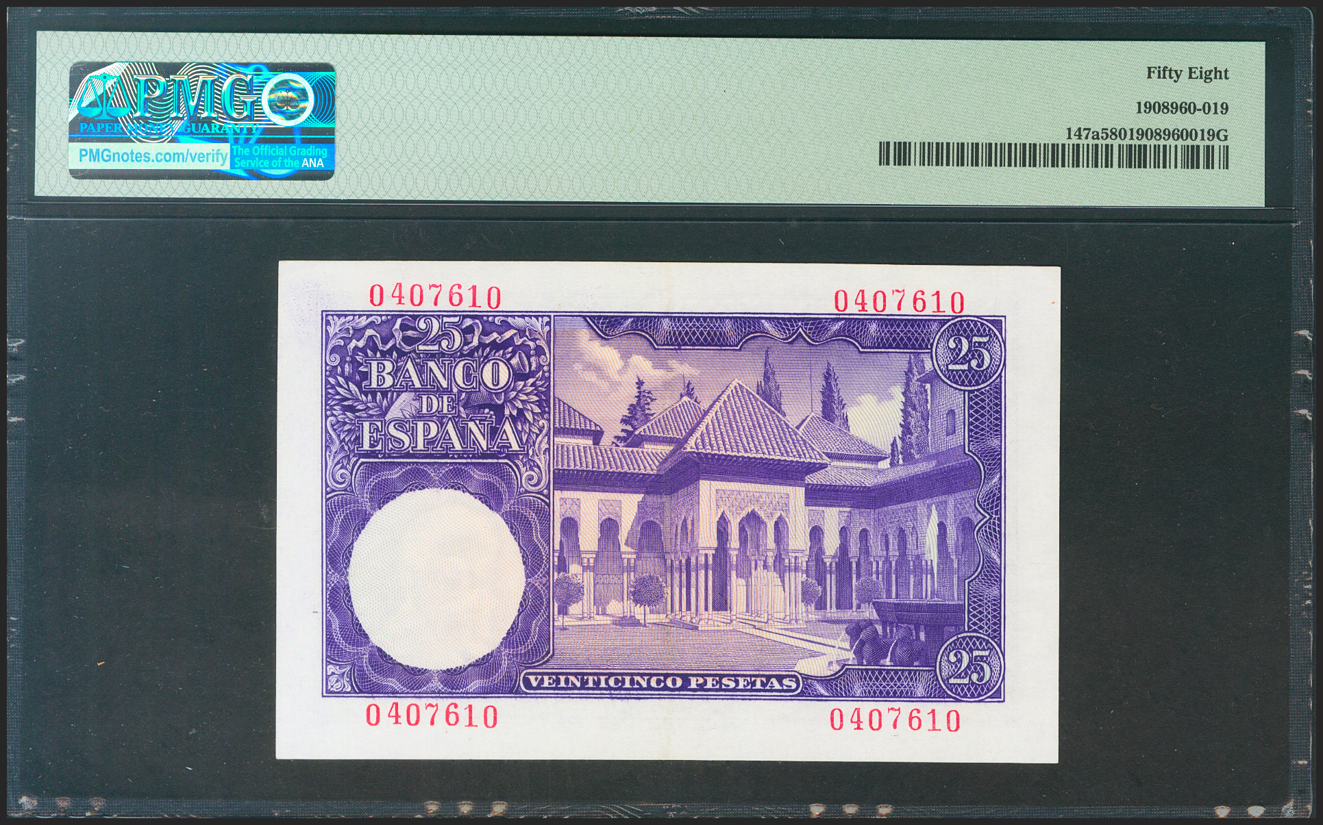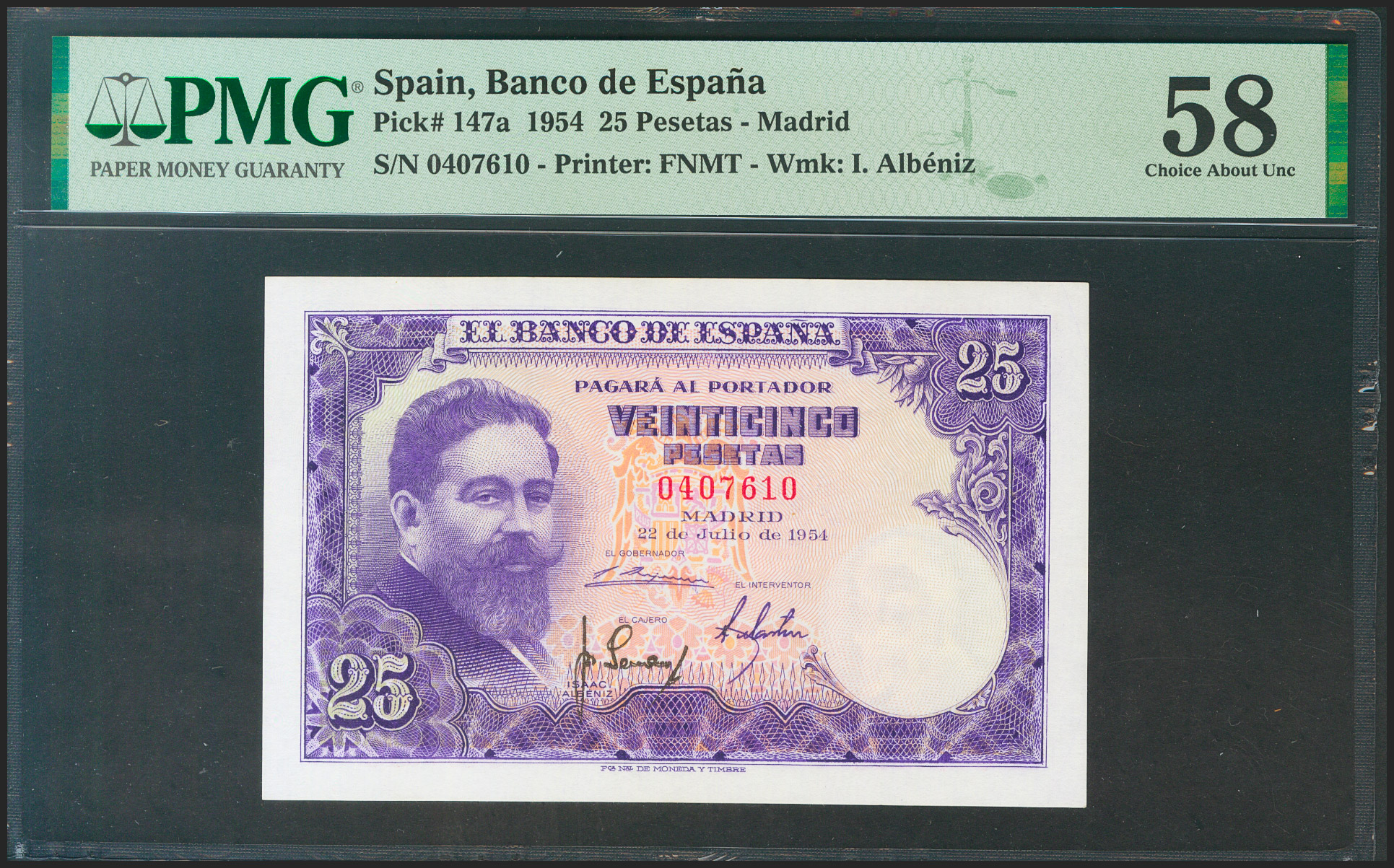 25 Pesetas. 22 de Julio de 1954. Sin serie. (Edifil 2021: 467, Pick: 147a). EBC++. Encapsulado PMG58.