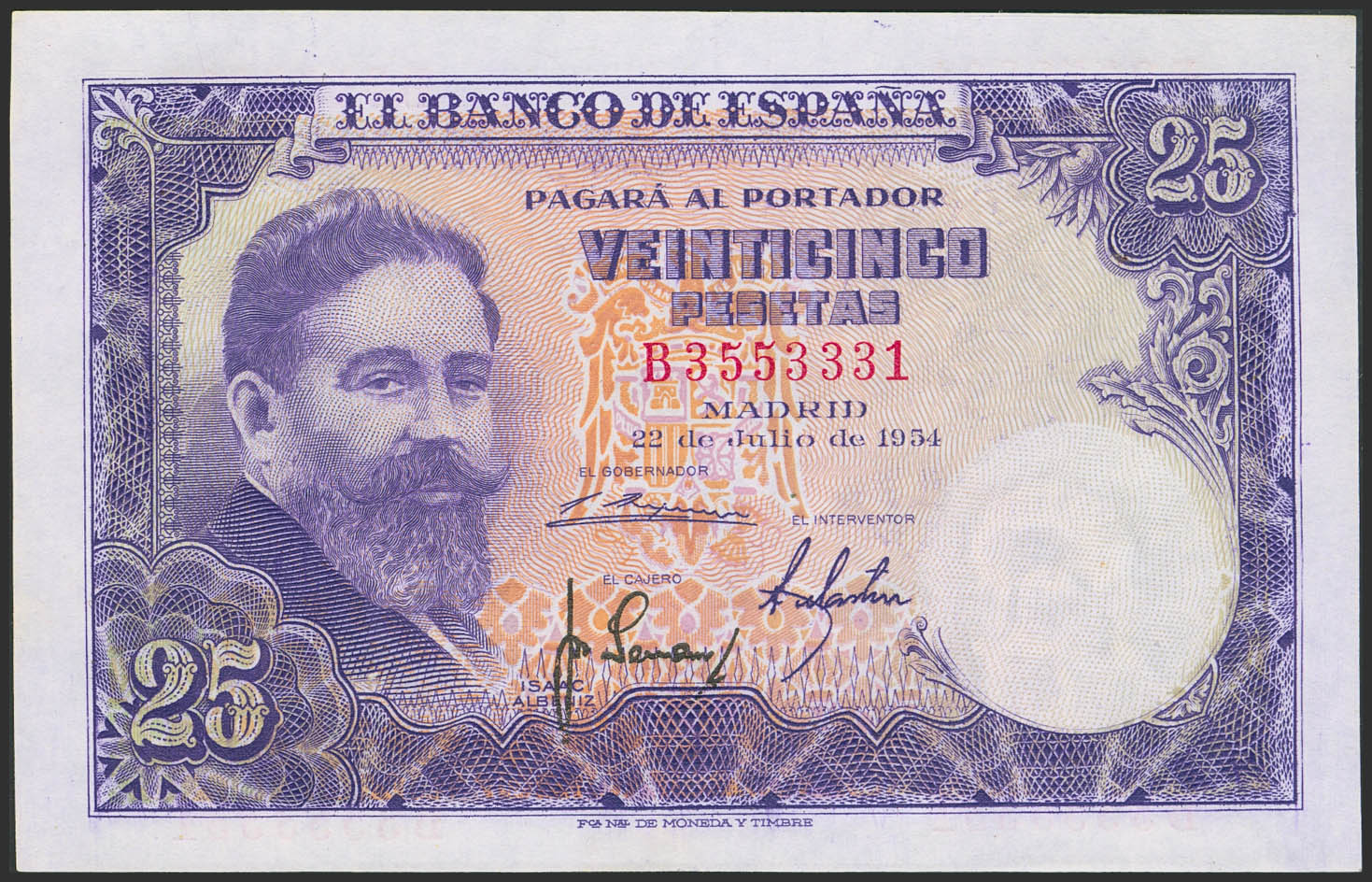 25 Pesetas. 22 de Julio de 1954. Serie B. (Edifil 2023: 467a). Apresto original. SC.