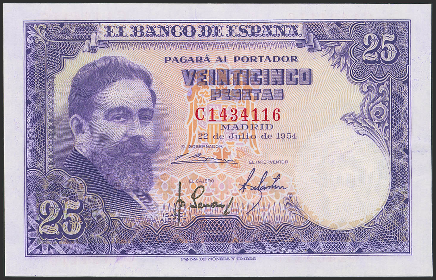 25 Pesetas. 22 de Julio de 1954. Serie C. (Edifil 2023: 467a). Apresto original. SC-.