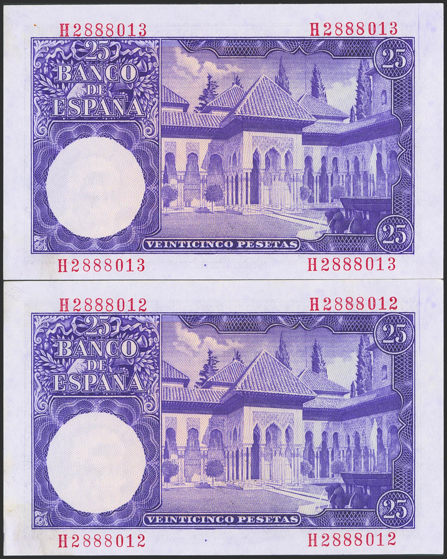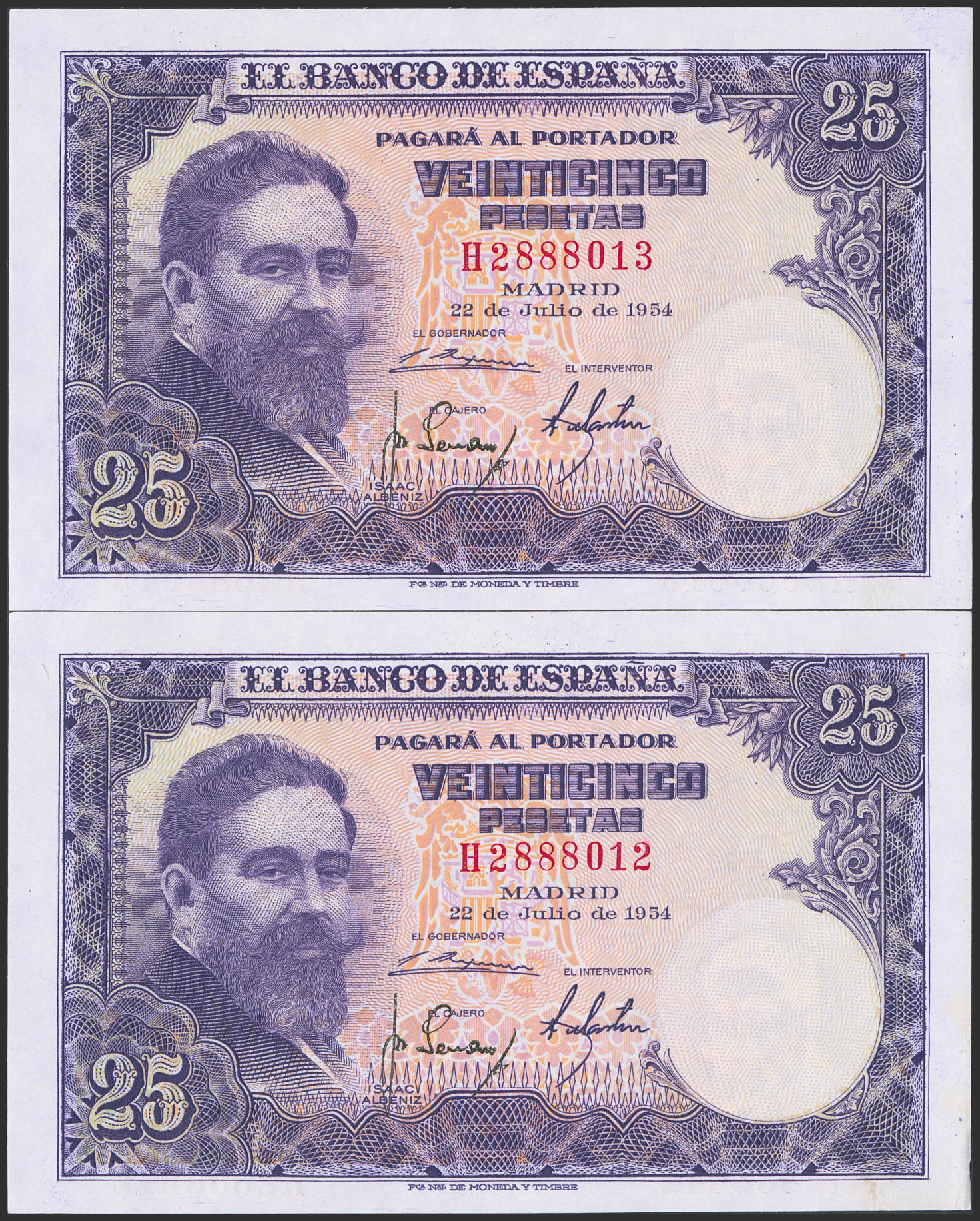 25 Pesetas. 22 de Julio de 1954. Pareja correlativa. Serie H. (Edifil 2023: 467a). Apresto original. SC-.