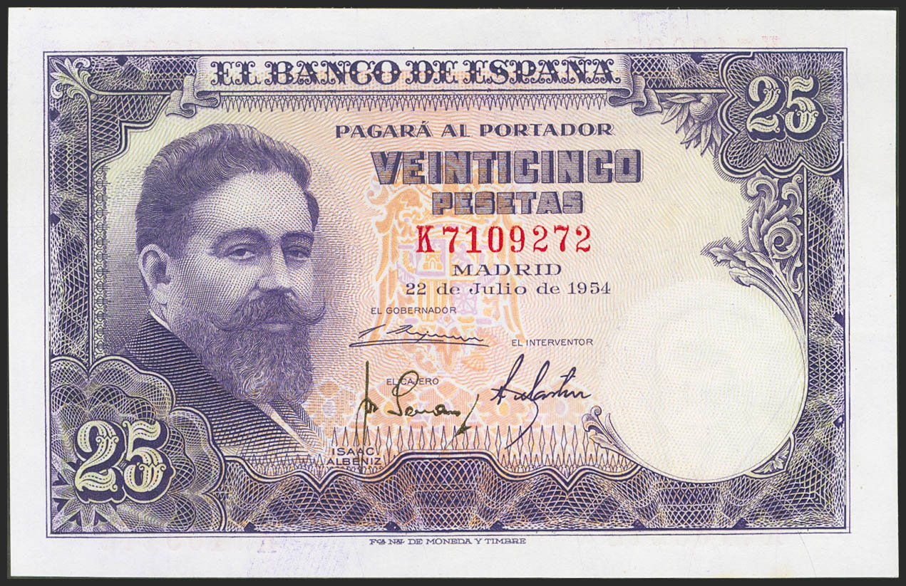 25 Pesetas. 22 de Julio de 1954. Serie K. (Edifil 2021: 467a). Conserva todo su apresto original. SC-.