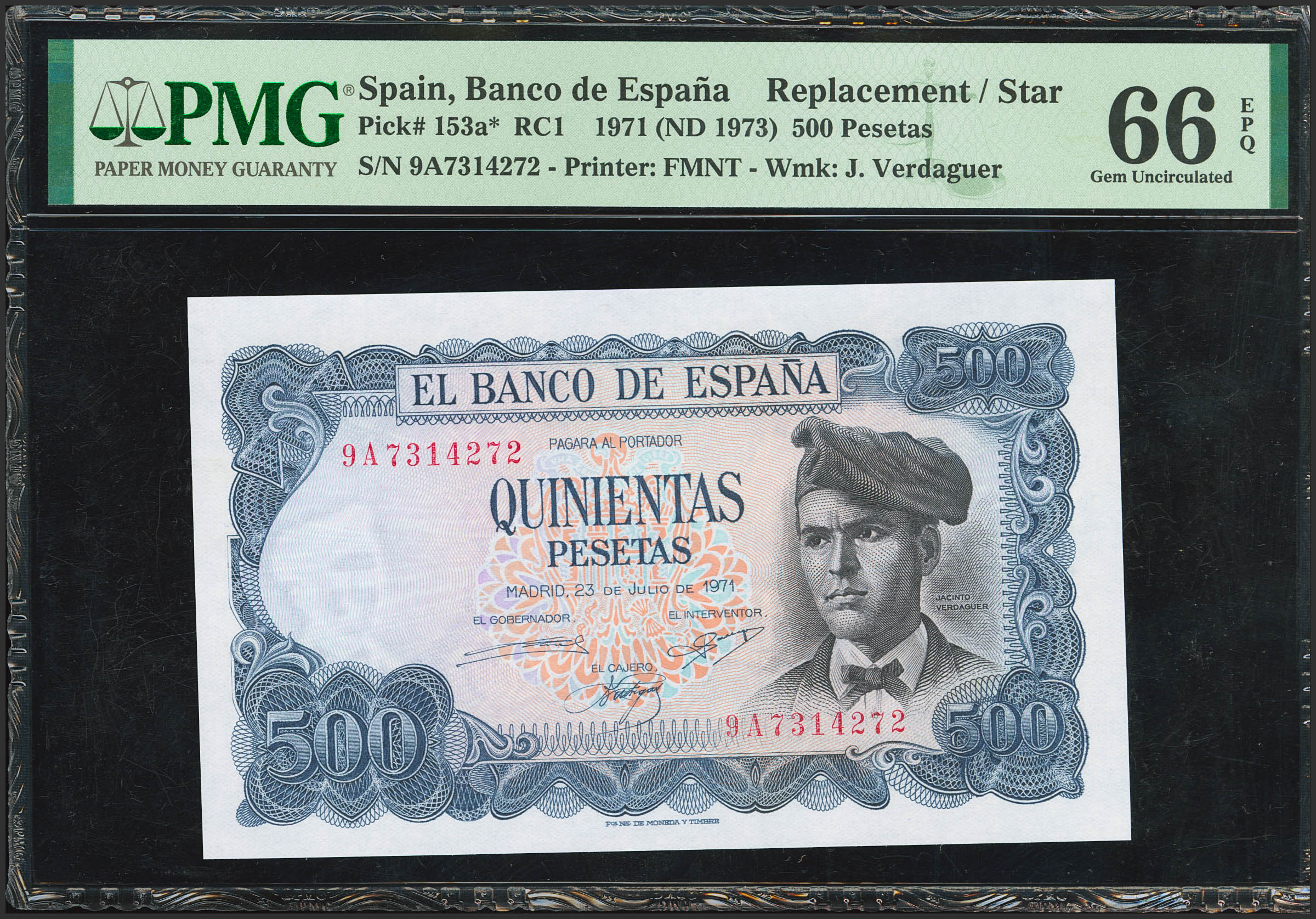 500 Pesetas. 23 de Julio de 1971. Serie especial 9A. (Edifil 2023: 473b, Pick: 153a*). Inusual en esta excepcional calidad. Encapsulado PMG66EPQ.