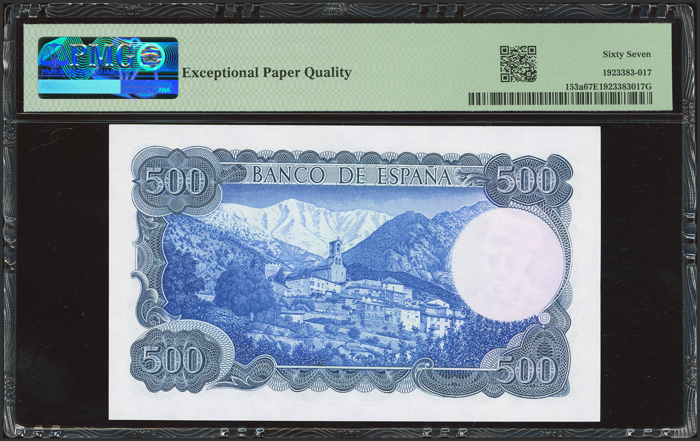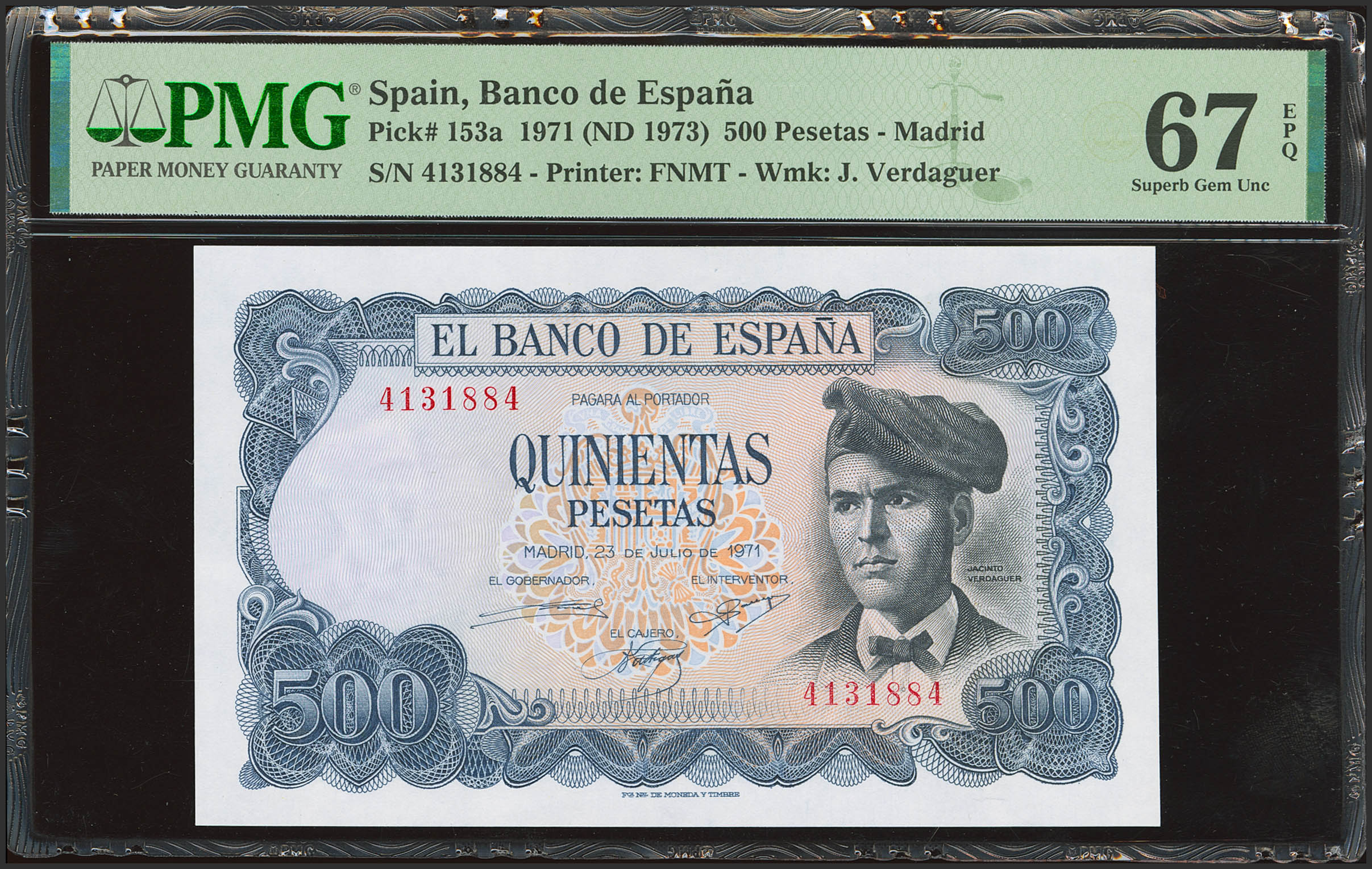 500 Pesetas. 23 de Julio de 1971. Sin serie. (Edifil 2023: 473, Pick: 153a). Apresto original. SC. Encapsulado PMG67EPQ.