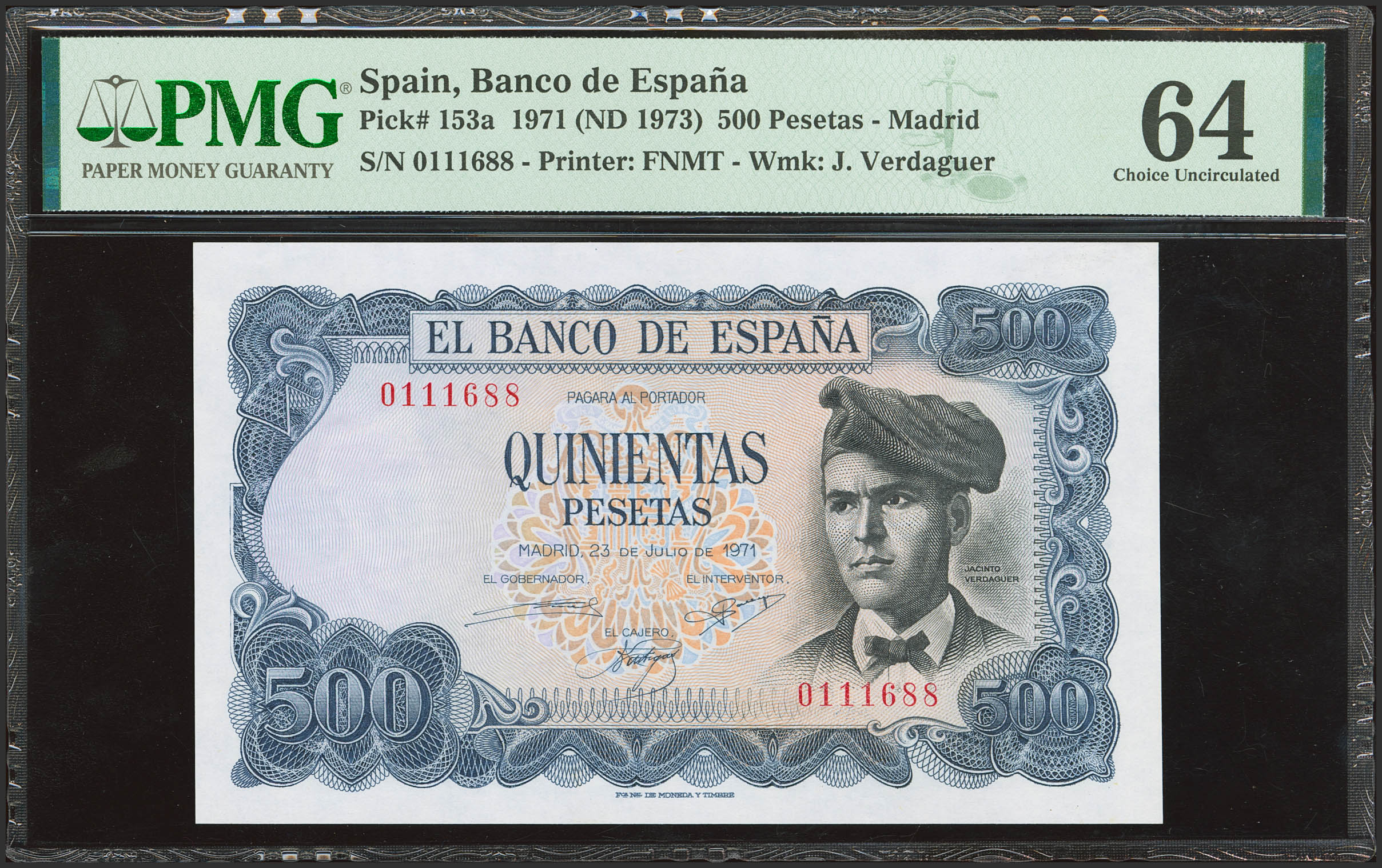500 Pesetas. 23 de Julio de 1971. Sin serie. (Edifil 2023: 473, Pick: 153a). SC. Encapsulado PMG64.