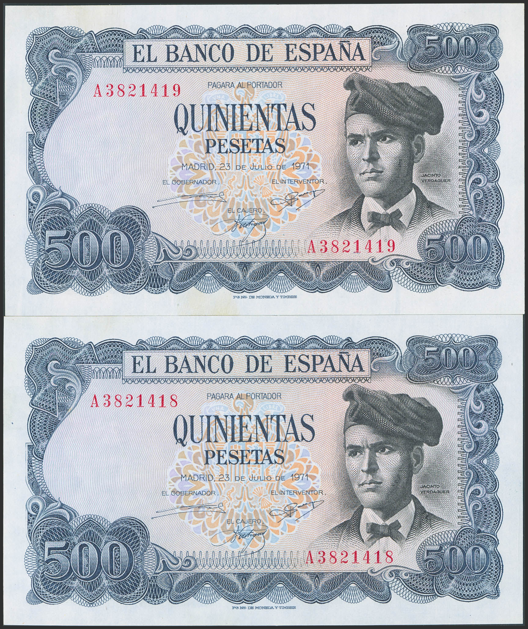 500 Pesetas. 23 de Julio de 1971. Pareja correlativa. Serie A. (Edifil 2023: 473a). SC-.
