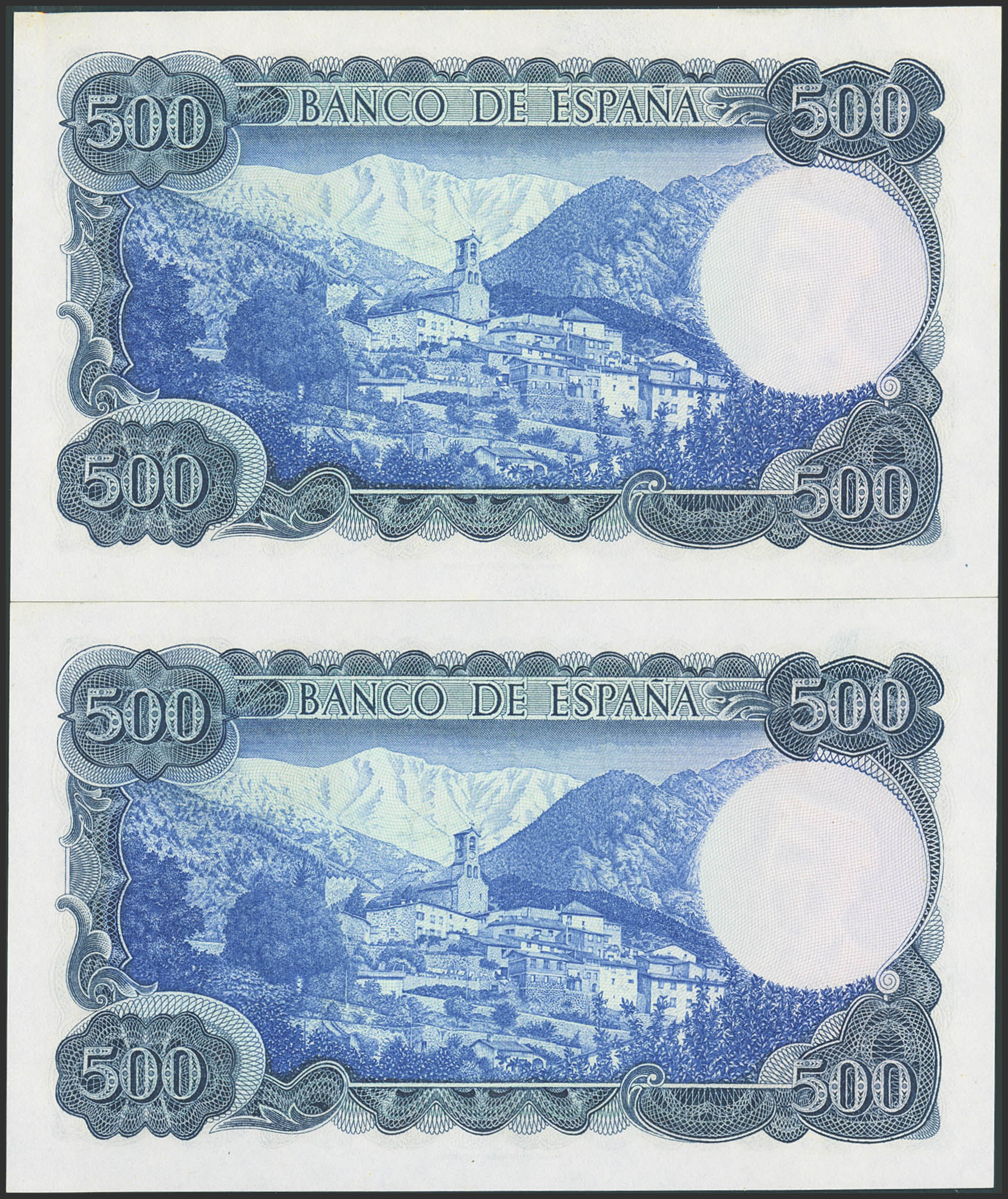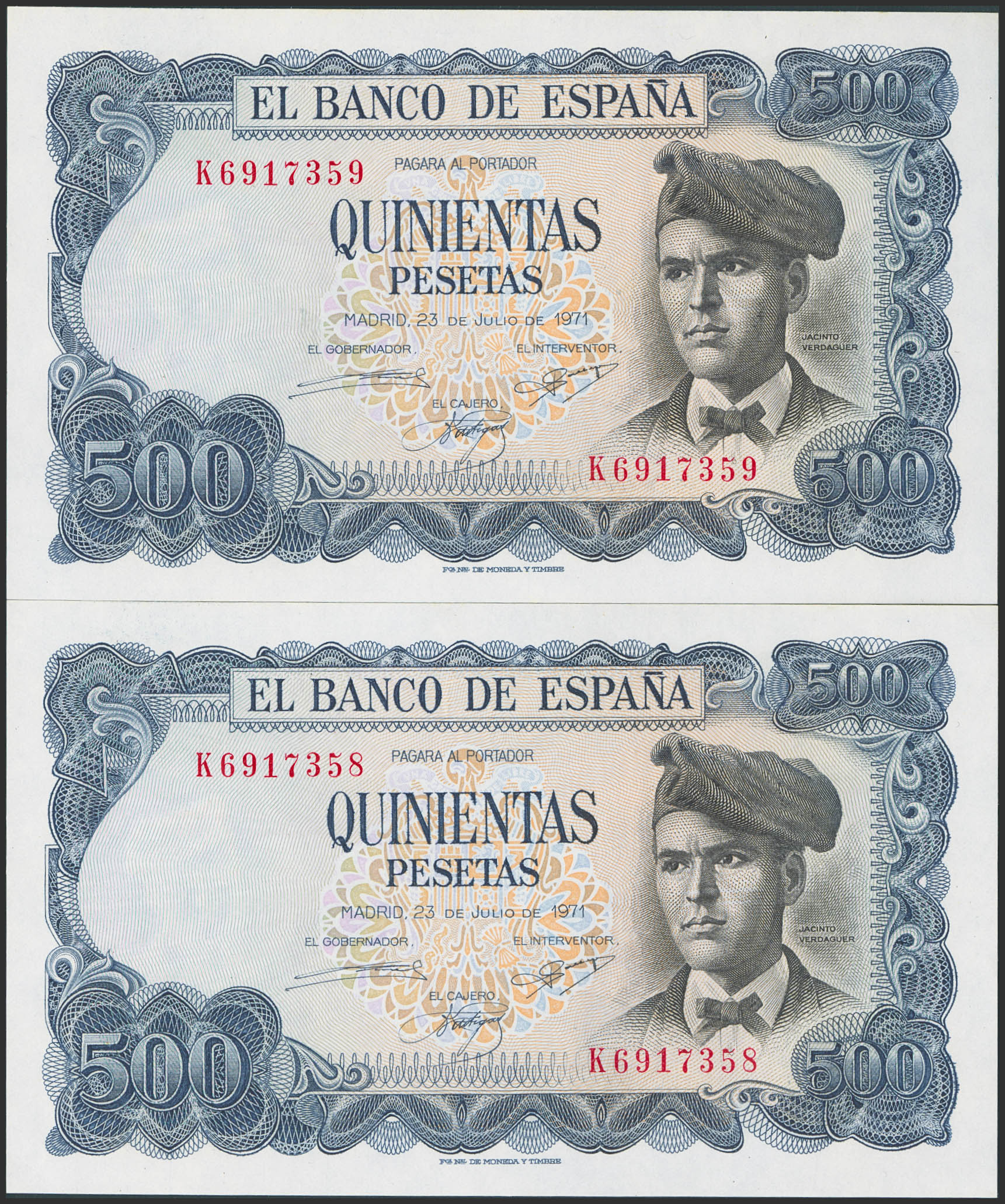 500 Pesetas. 23 de Julio de 1971. Pareja correlativa. Serie K. (Edifil 2023: 473a). SC-.