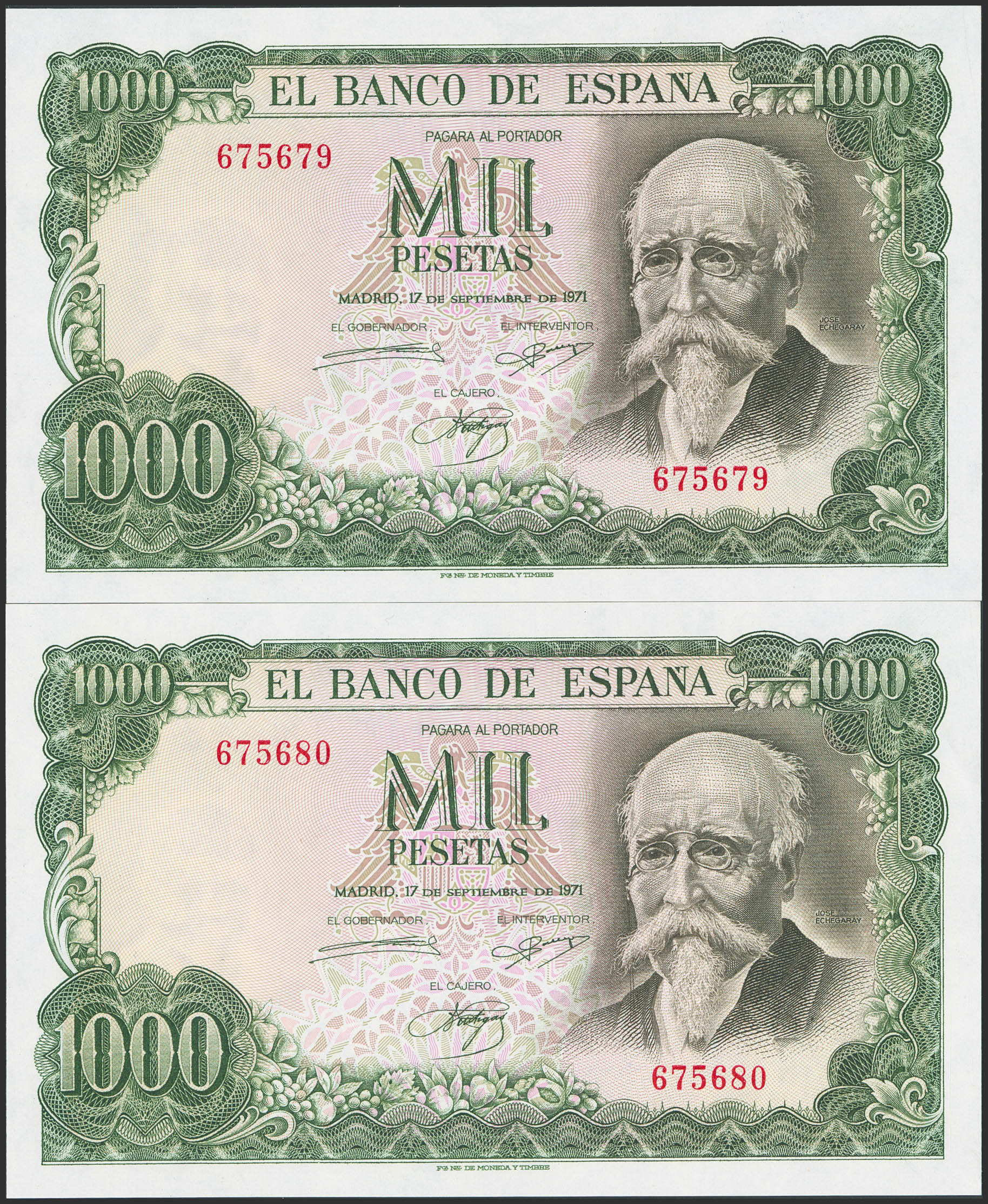 1000 Pesetas. 17 de Septiembre de 1971. Pareja correlativa. Sin serie. (Edifil 2023: 474). Apresto original. SC.