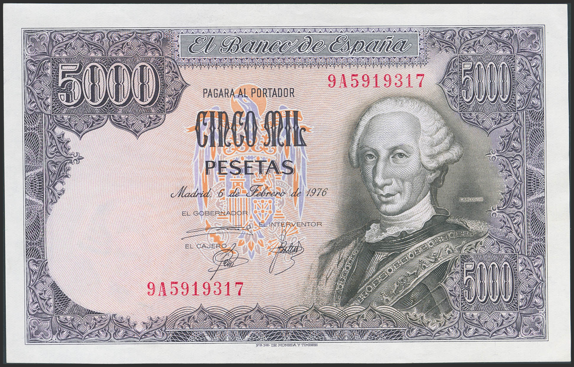 5000 Pesetas. 6 de Febrero de 1976. Serie especial 9A. (Edifil 2023: 475b). SC-.
