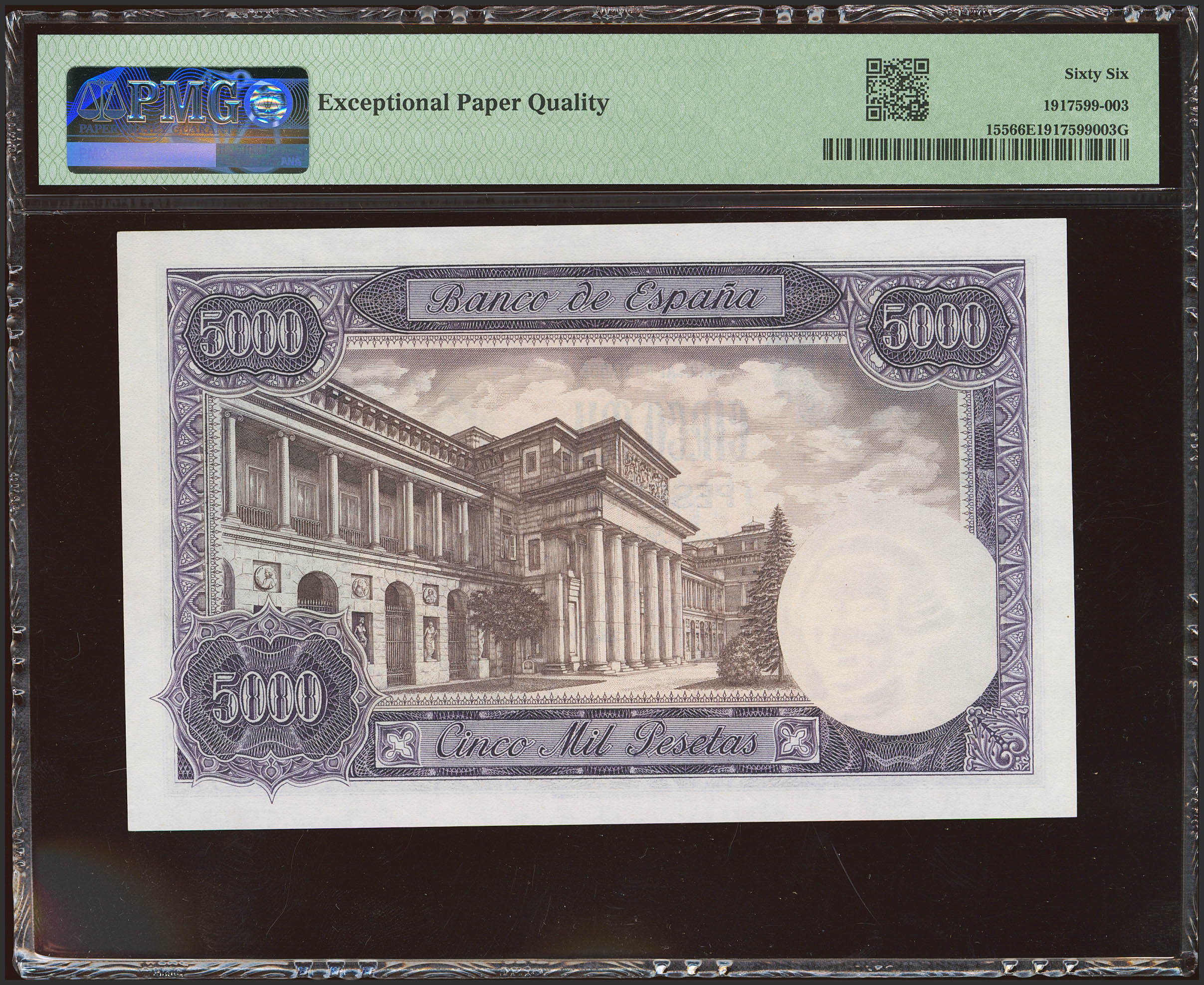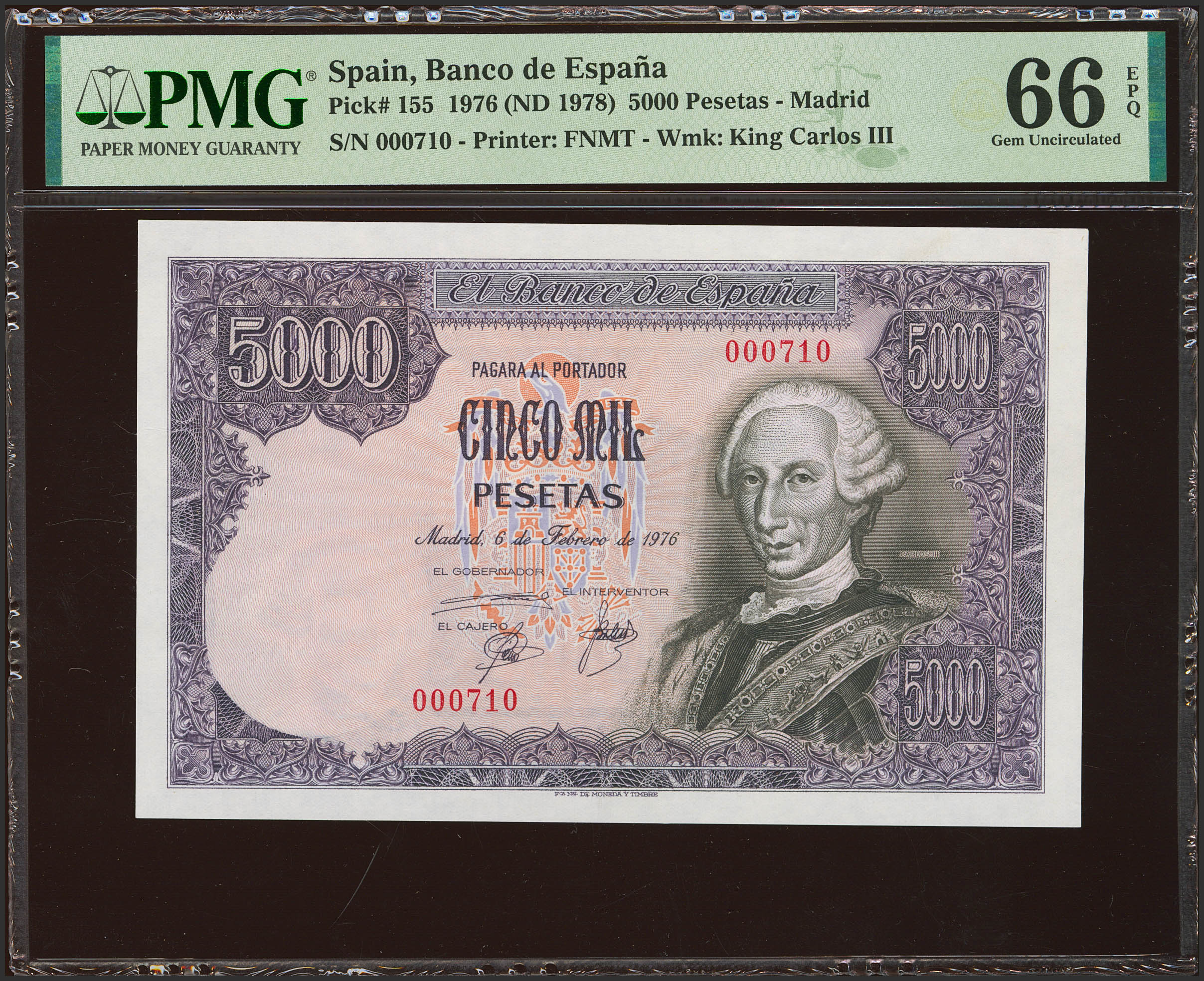 5000 Pesetas. 6 de Febrero de 1976. Sin serie y numeración bajísima (Nº000710). (Edifil 2023: 475, Pick: 155). Raro, especialmente en esta excepcional calidad. SC. Encapsulado PMG66EPQ.