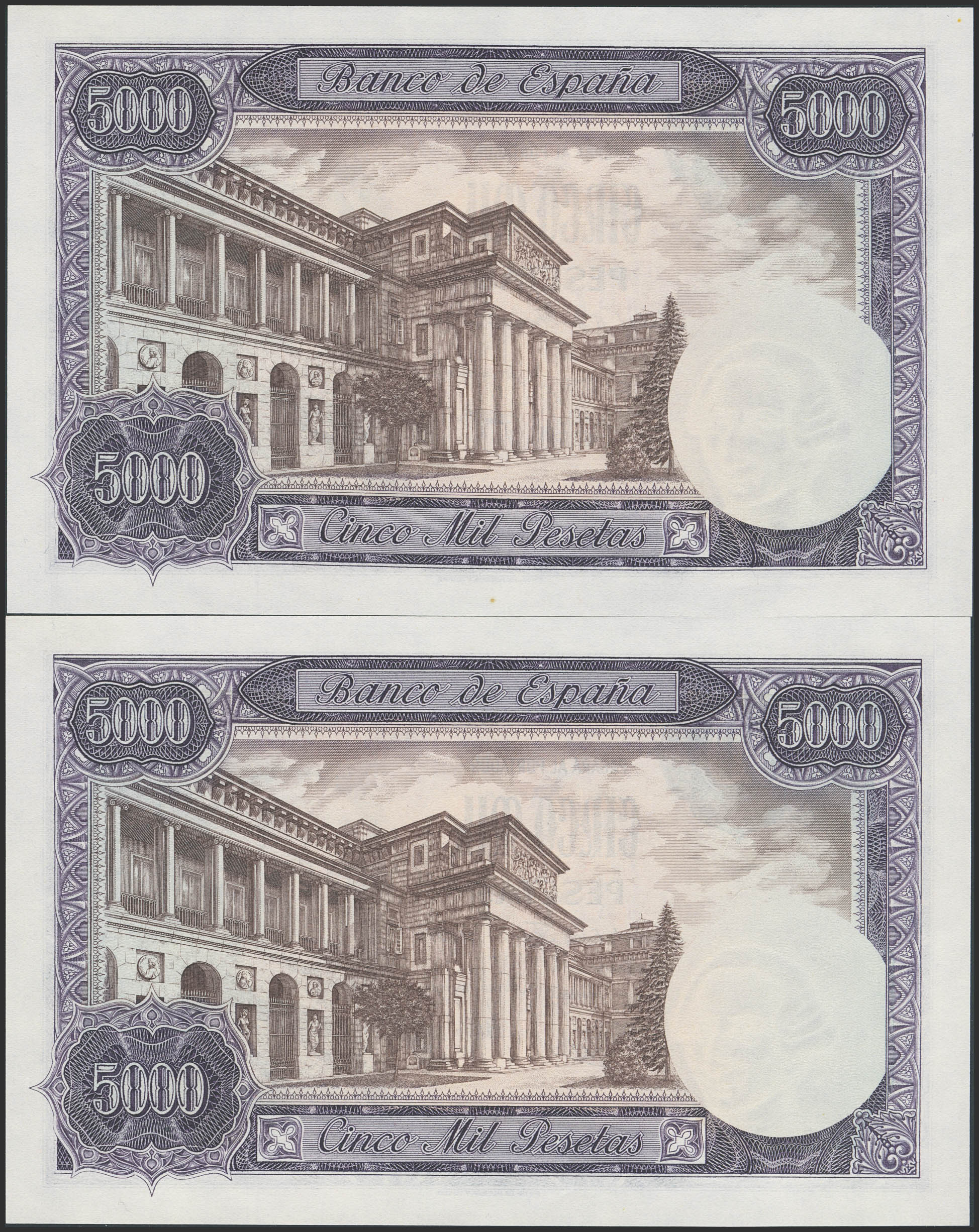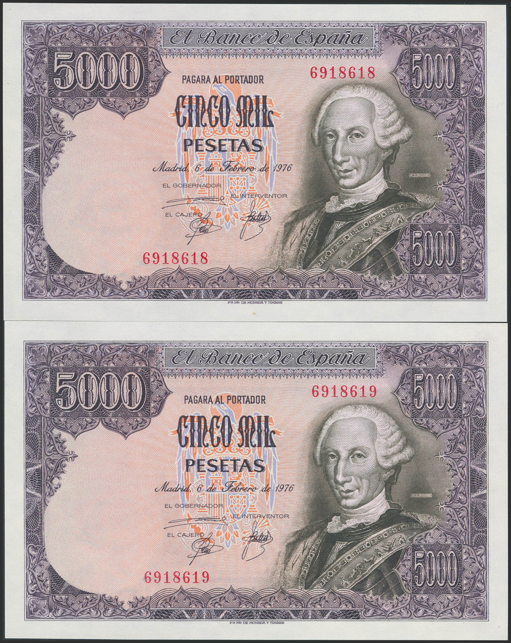 5000 Pesetas. 6 de Febrero de 1976. Pareja correlativa. Sin serie. (Edifil 2023: 475). Apresto original. SC.