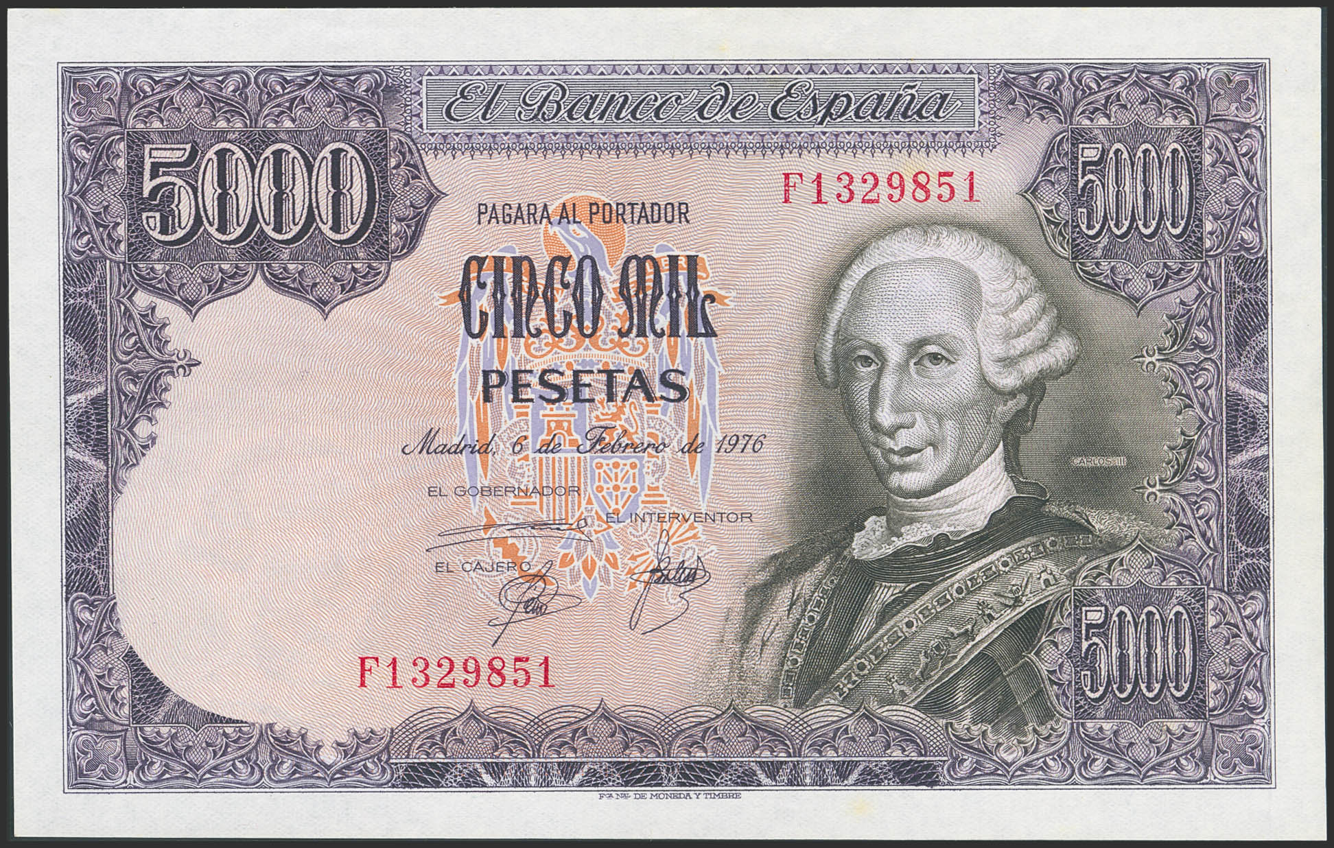 5000 Pesetas. 6 de Febrero de 1976. Serie F. (Edifil 2023: 475a). EBC++.