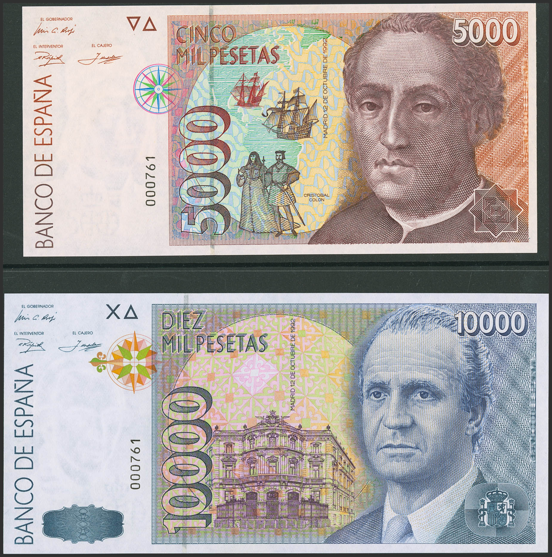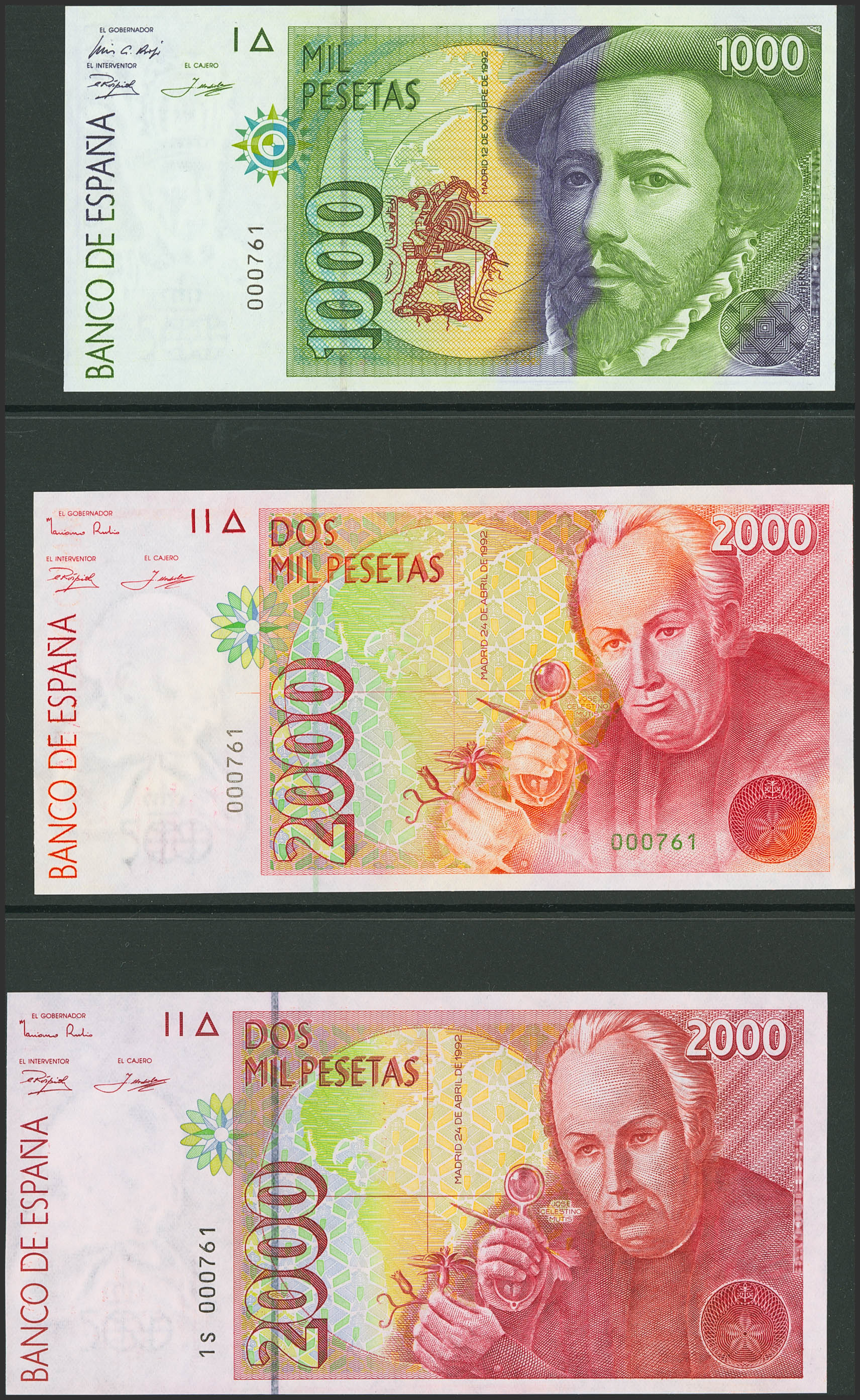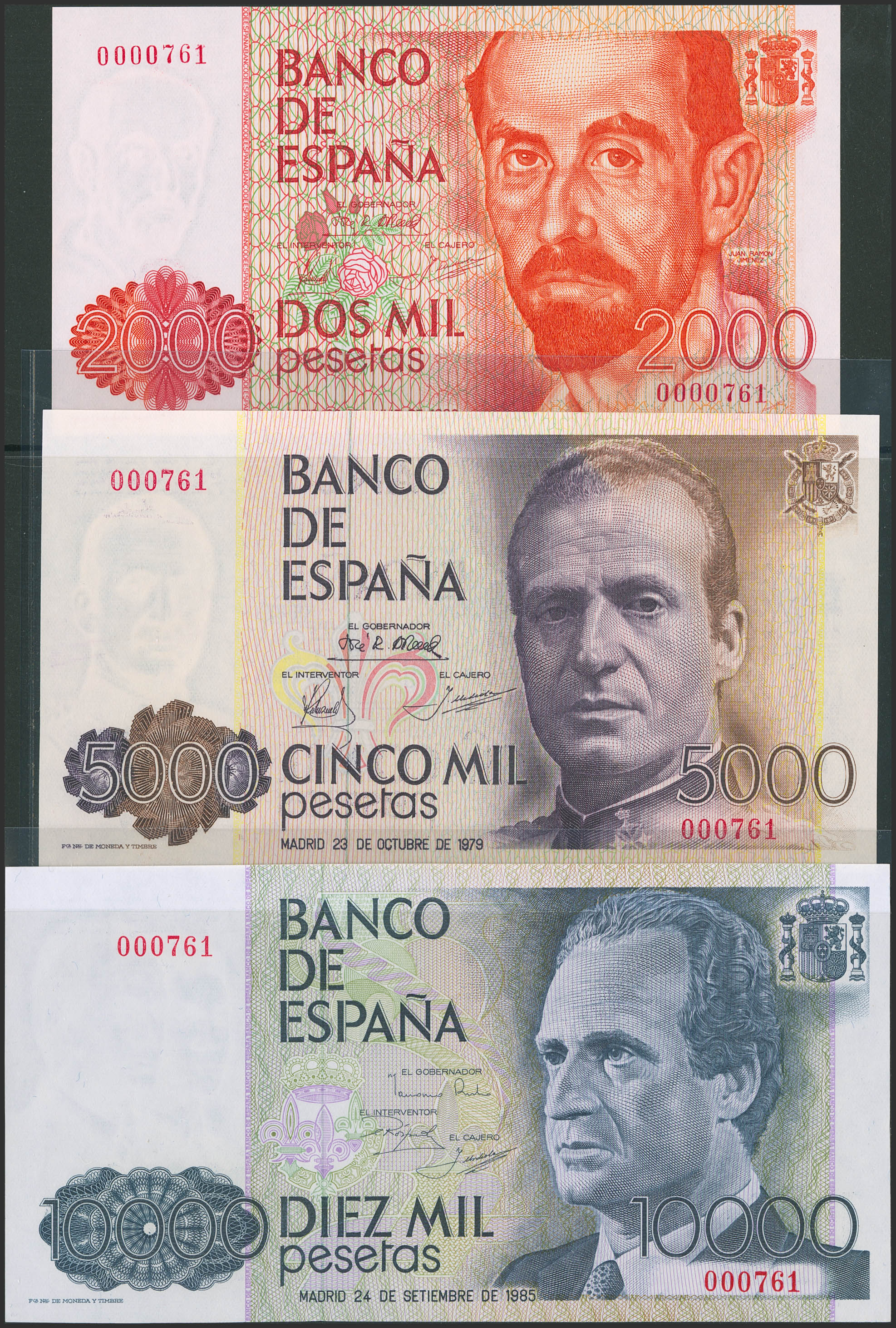 Conjunto de 6 billetes de 200 Pesetas, 500 Pesetas, 1000 Pesetas, 2000 Pesetas, 5000 Pesetas y 10000 Pesetas, todos los billetes emitidos entre 1979 y 1985, todos sin serie y con la misma bajísima numeración 0000761, además la serie completa de 5 billetes de la emisión de 1992 (incluyendo el de 2000 Pesetas de 1995 con la serie 1S), todos sin serie y con la misma numeración bajísima que el grupo anterior 0000761. (Edifil 2023: 476/81, 482/85, 482A). Extremadamente raro conjunto, muy pocos conjuntos conocidos así de completos. SC.
