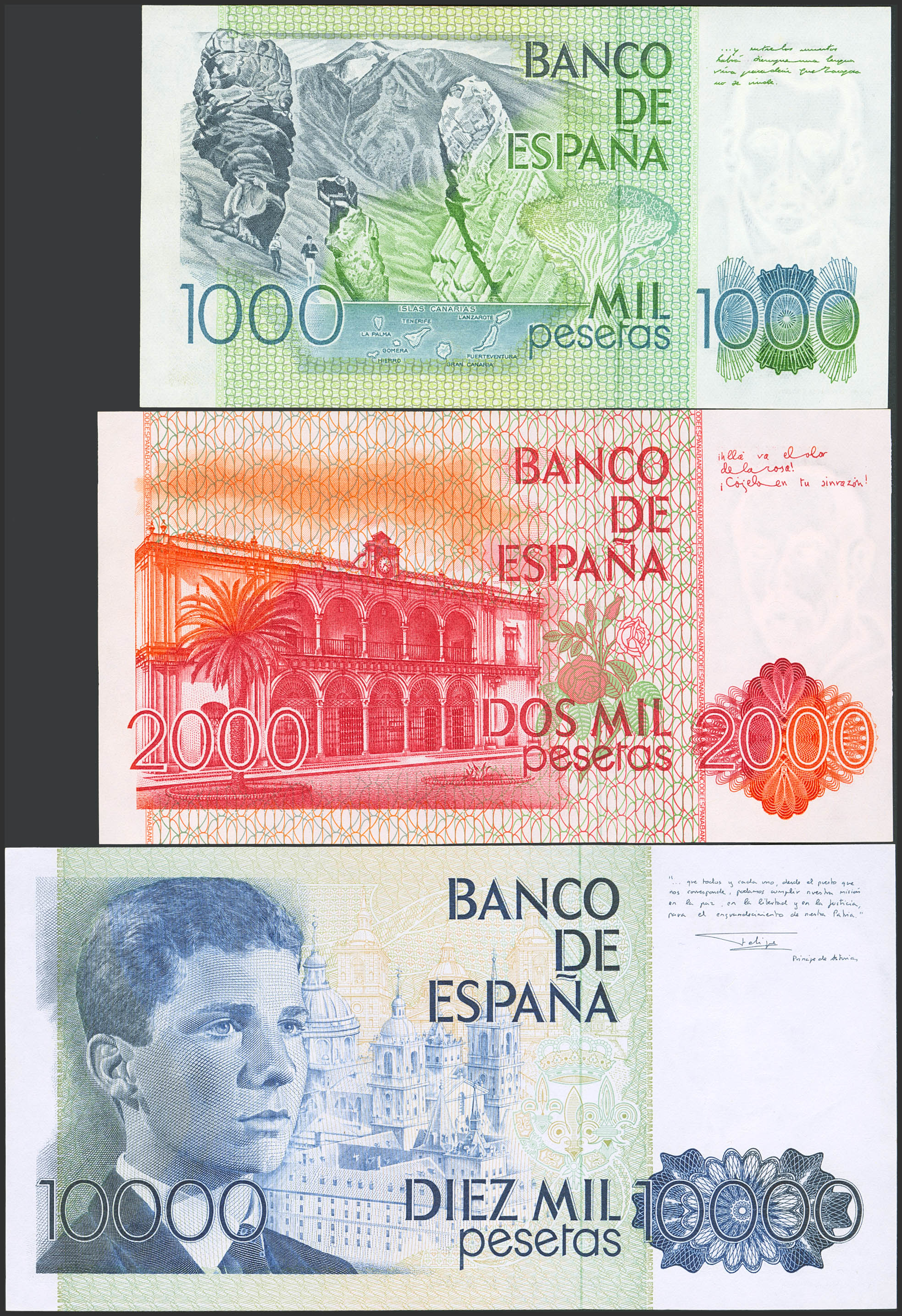 Conjunto de 3 billetes del Banco de España de 1000 Pesetas, 2000 Pesetas y 10000 Pesetas, emitidos entre 1979 y 1985, todos ellos sin serie. (Edifil 2023: 477, 479, 481). SC/SC-.