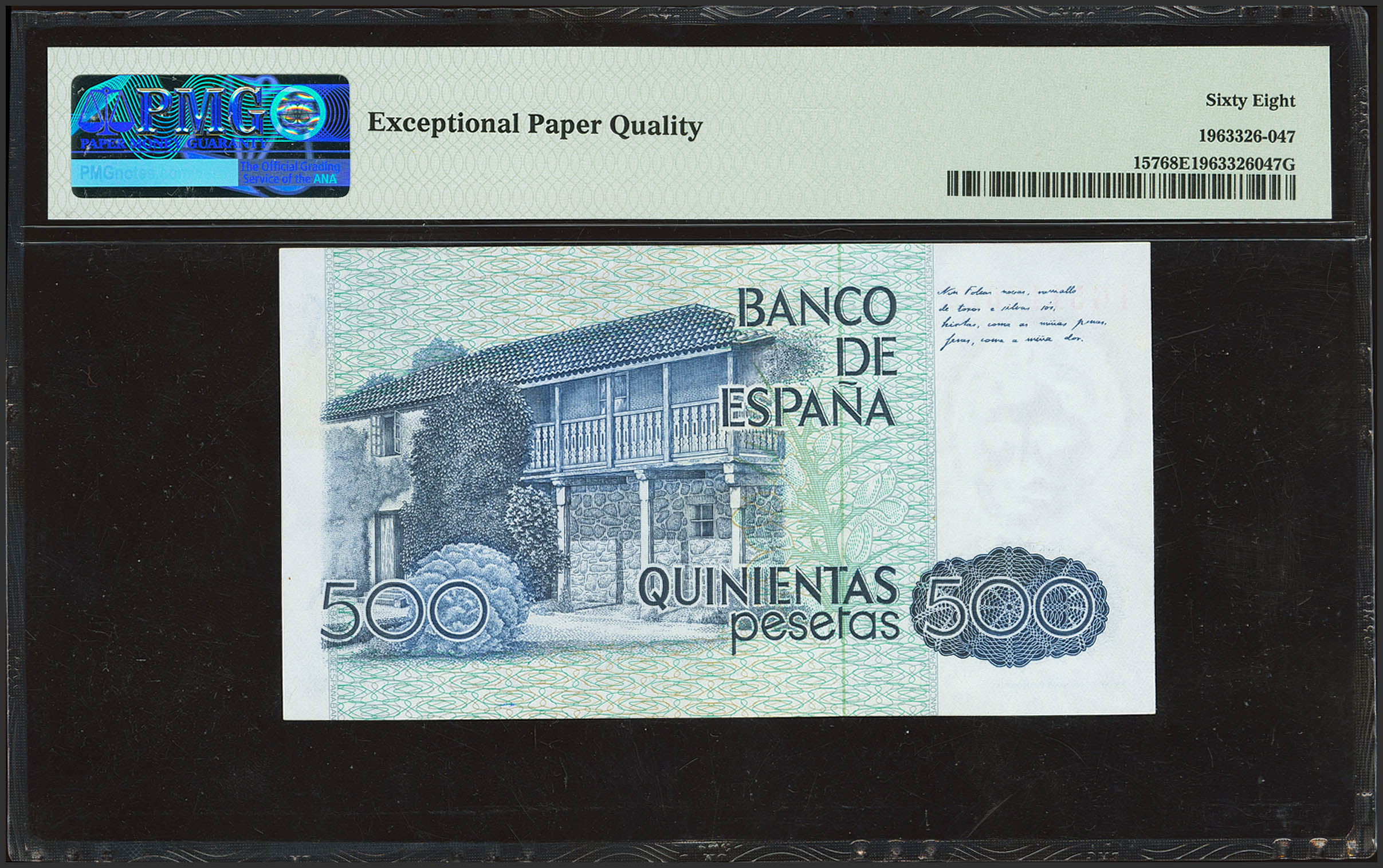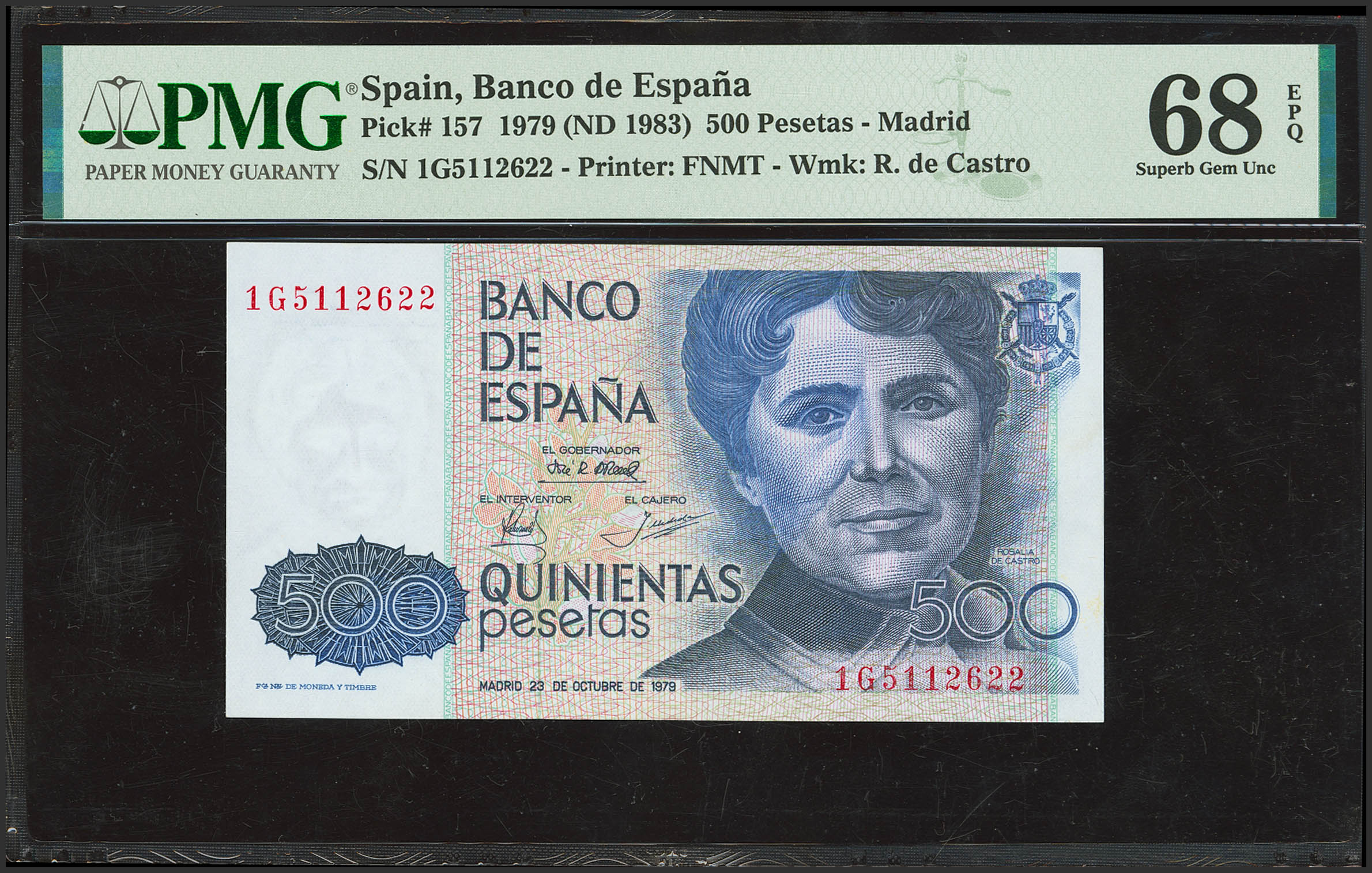 500 Pesetas. 23 de Octubre de 1979. Serie 1G. (Edifil 2023: 476a, Pick: 157). Raro en esta calidad. SC. Encapsulado PMG68EPQ.