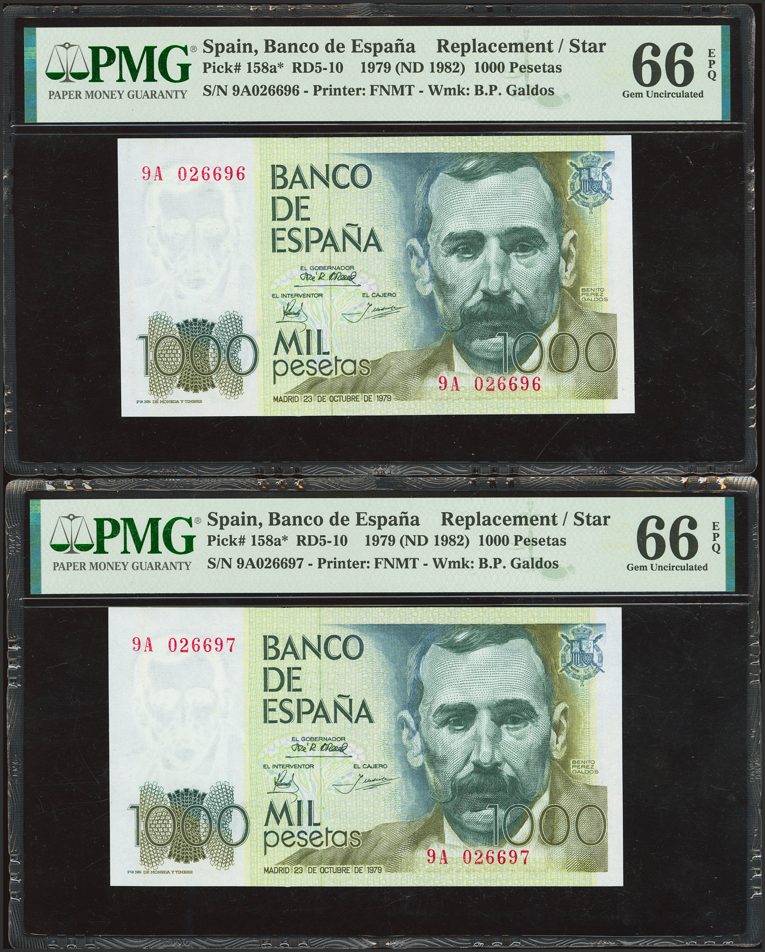 1000 Pesetas. 23 de Octubre de 1979. Pareja correlativa. Serie especial 9A. (Edifil 2023: 477b, Pick: 158*). SC. Encapsulados PMG66EPQ, ambos.