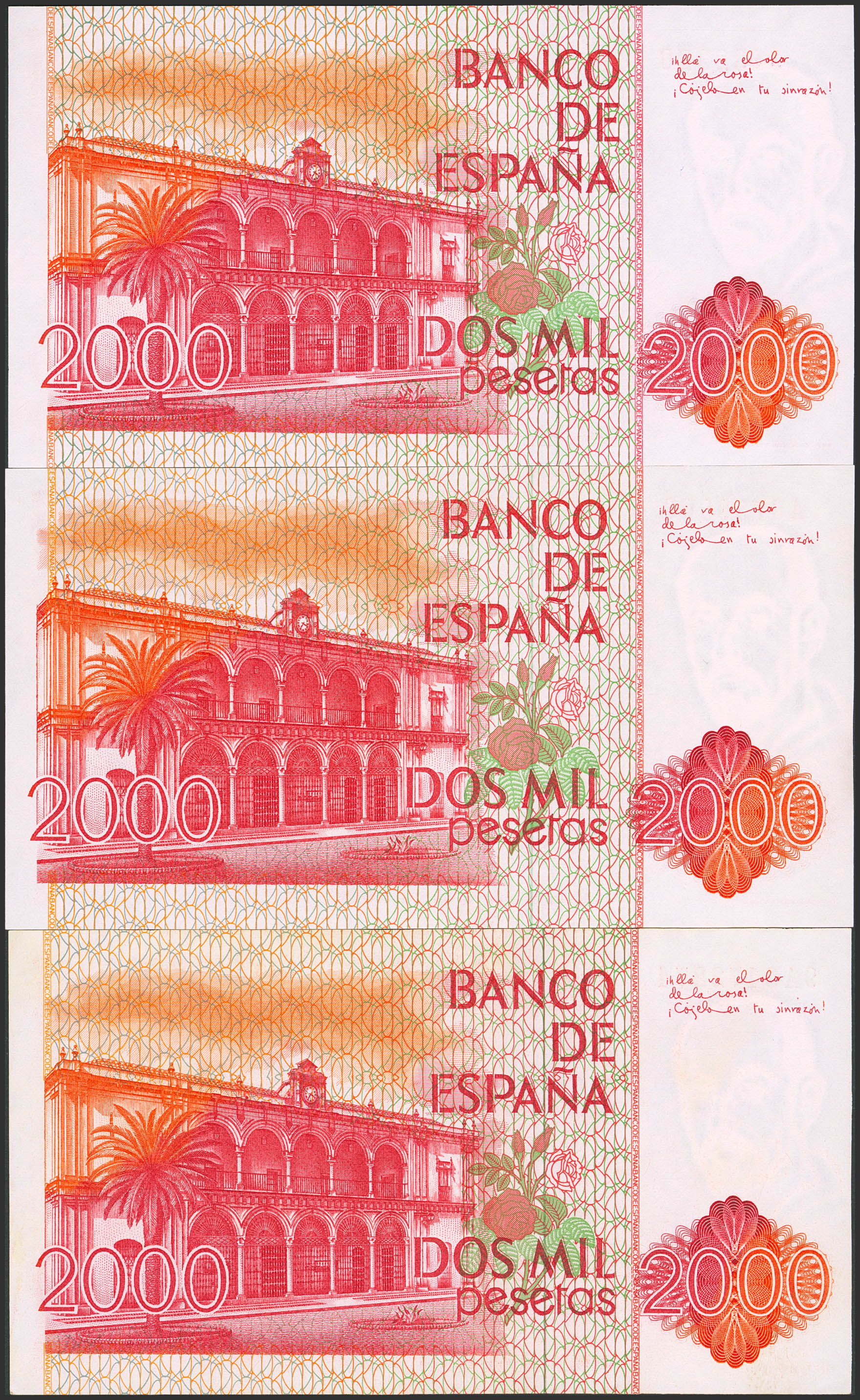 Conjunto de 3 billetes de 2000 Pesetas emitidos el 22 de Julio de 1980, serie especial 9A, sin serie y serie A. (Edifil 2023: 479b, 479, 479a). SC/EBC+++.