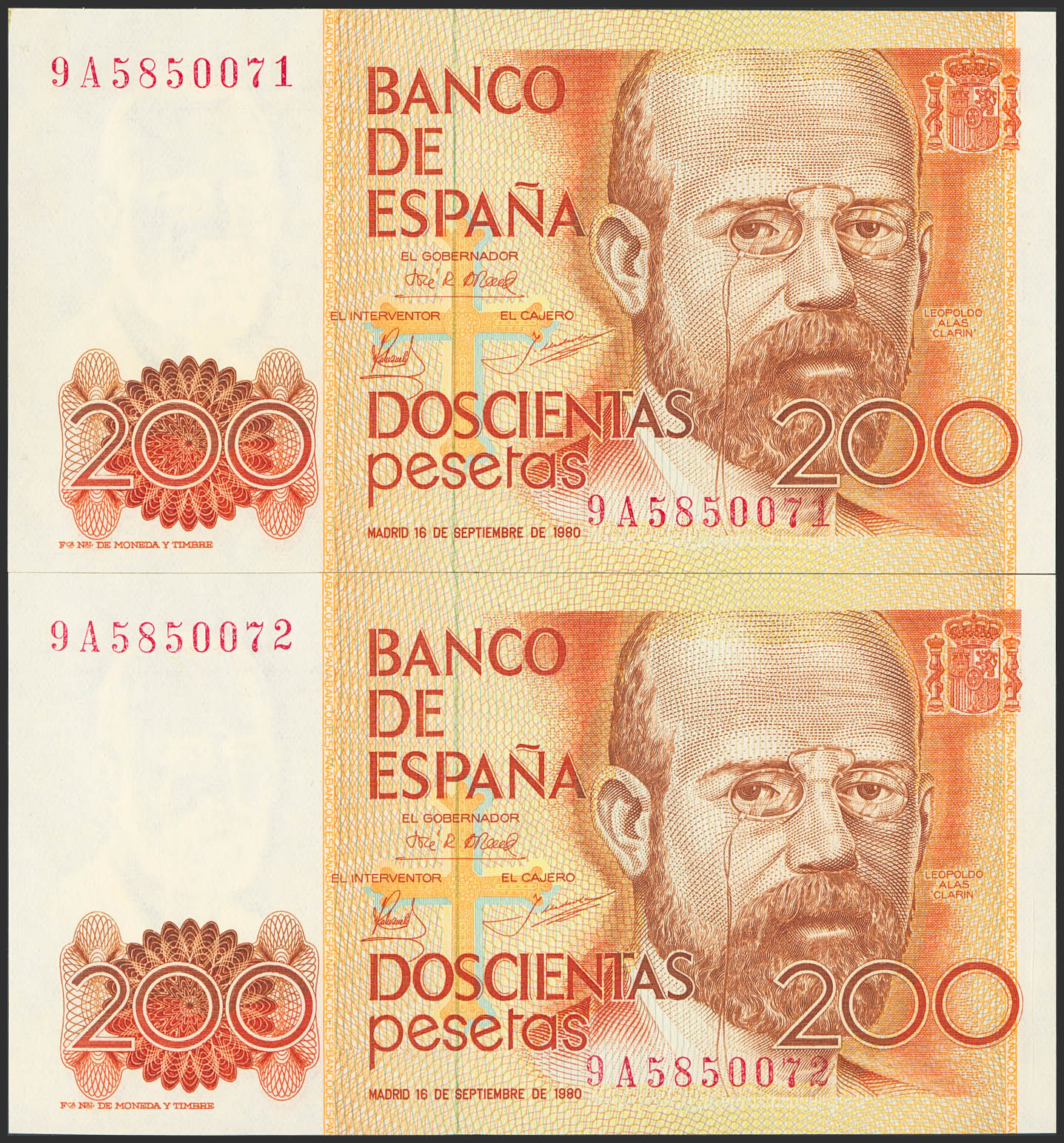 200 Pesetas. 16 de Septiembre de 1980. Pareja correlativa. Serie especial 9A. (Edifil 2023: 480b). SC.