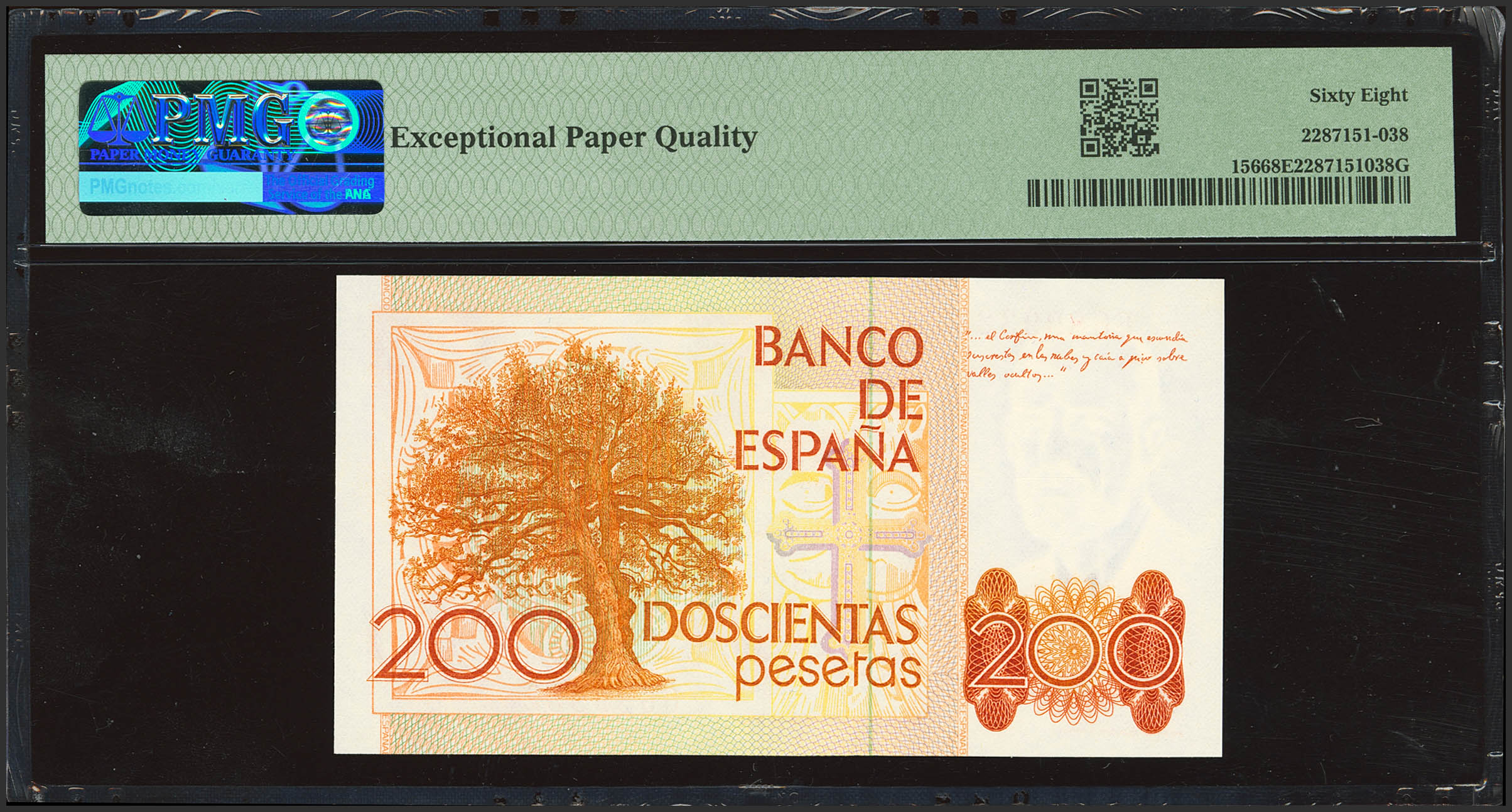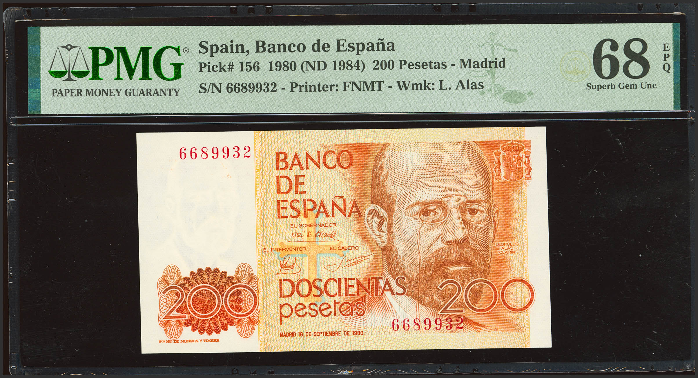 200 Pesetas. 16 de Septiembre de 1980. Sin serie. (Edifil 2023: 480, Pick: 156). Raro en esta calidad. SC. Encapsulado PMG68EPQ.