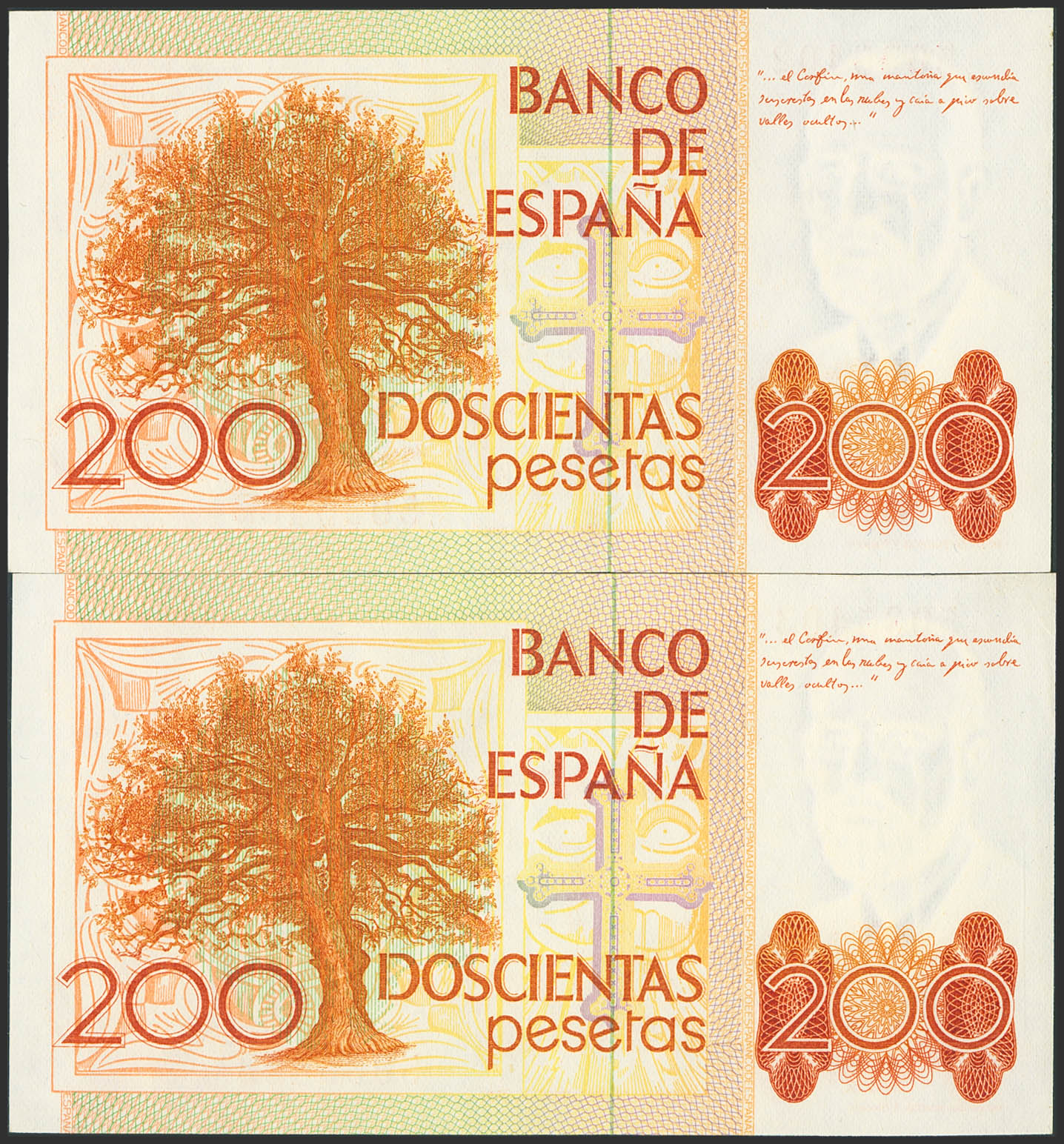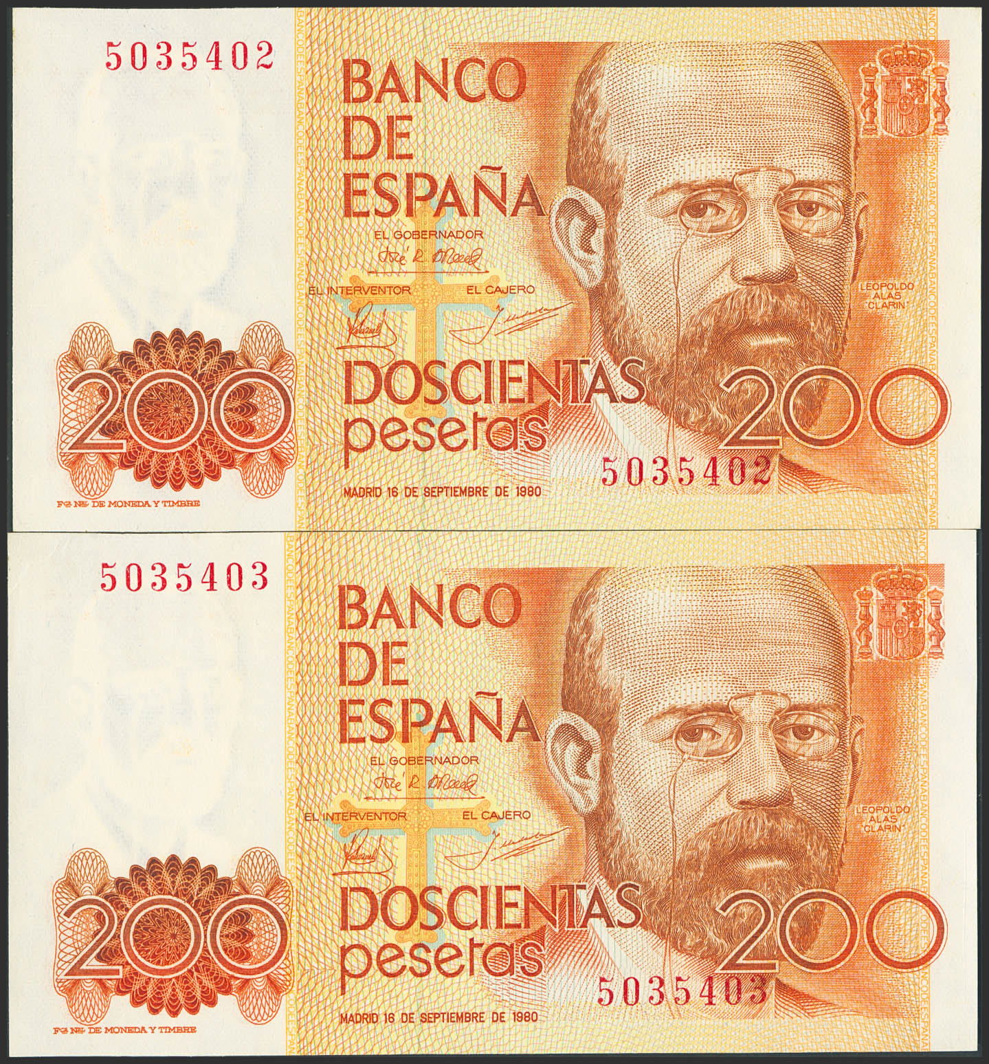 200 Pesetas. 16 de Septiembre de 1980. Pareja correlativa. Sin serie . (Edifil 2023: 480). SC-.