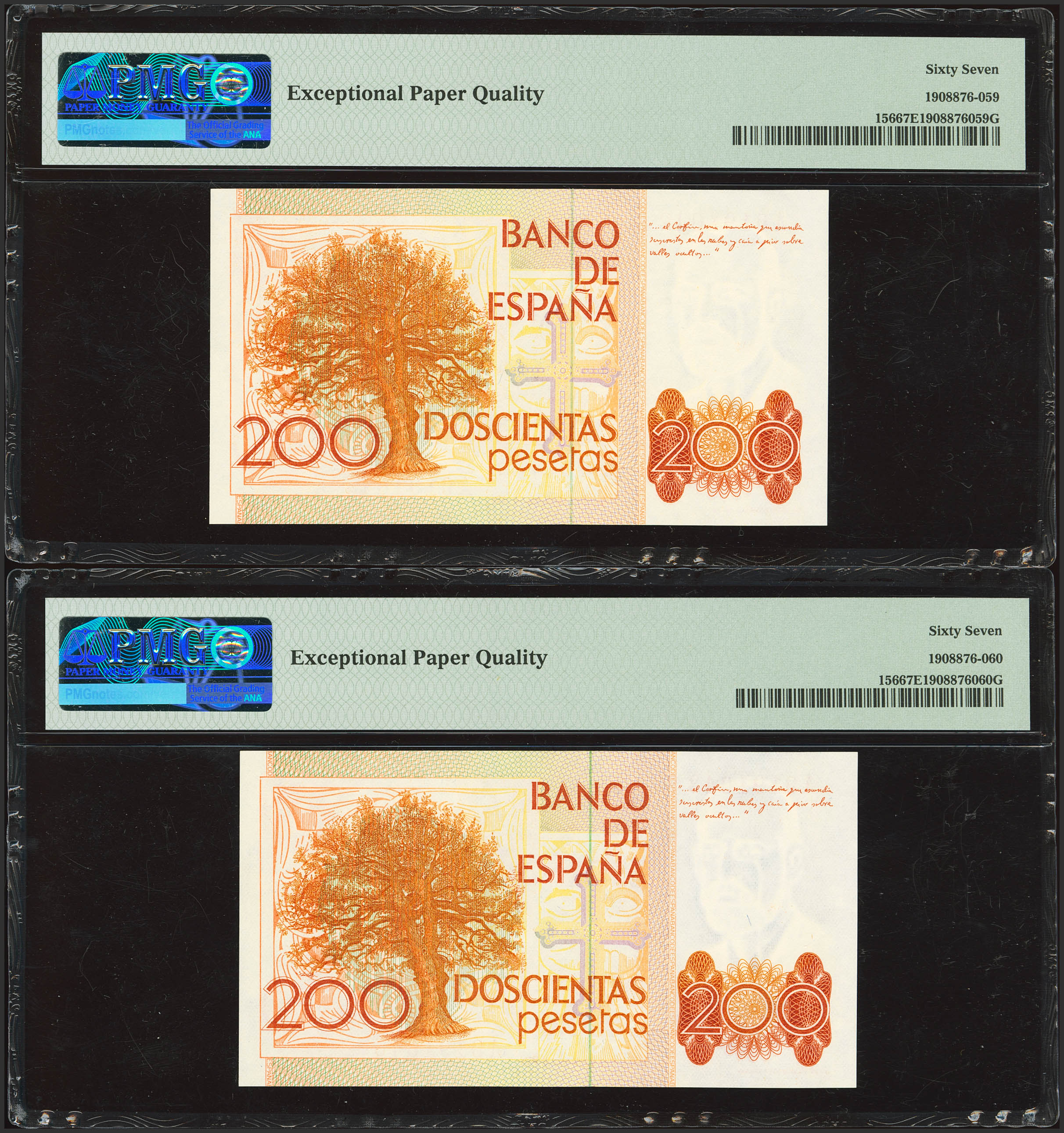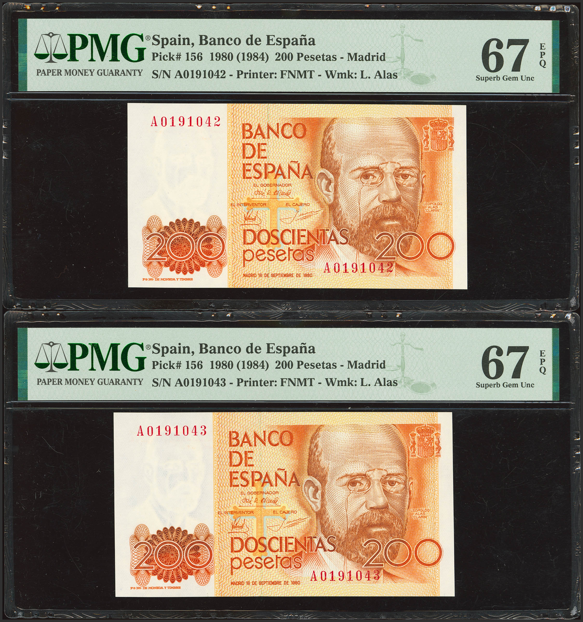 200 Pesetas. 16 de Septiembre de 1980. Pareja correlativa. Serie A. (Edifil 2023: 480a, Pick: 156). SC. Encapsulado PMG67EPQ, ambos.