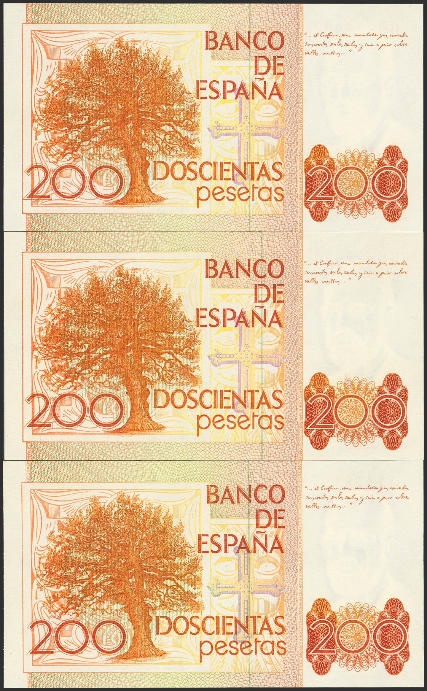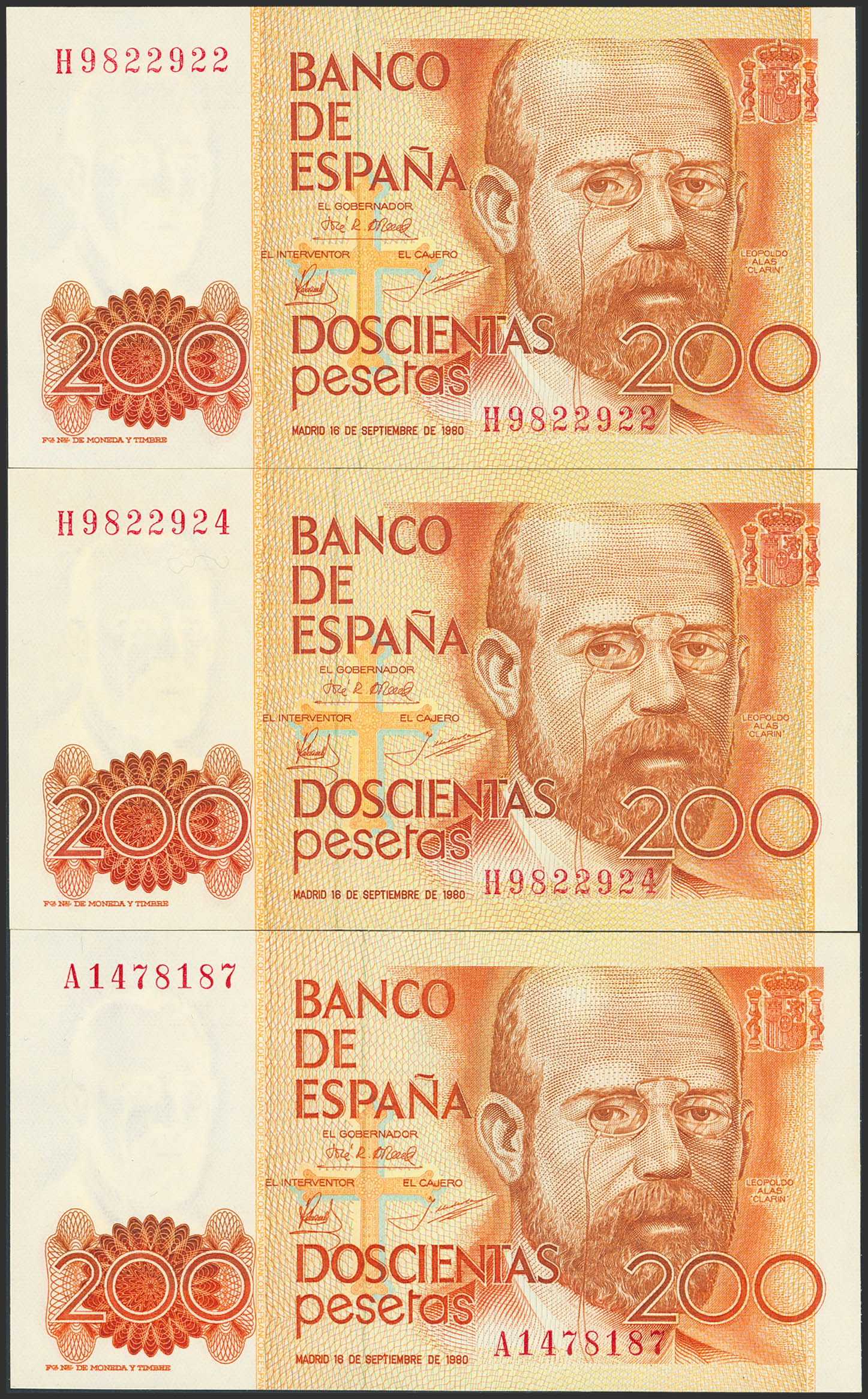 Conjunto de 3 billetes de 200 Pesetas emitidos el 16 de Septiembre de 1980 con las series A y H(2). (Edifil 2023: 480a). SC.
