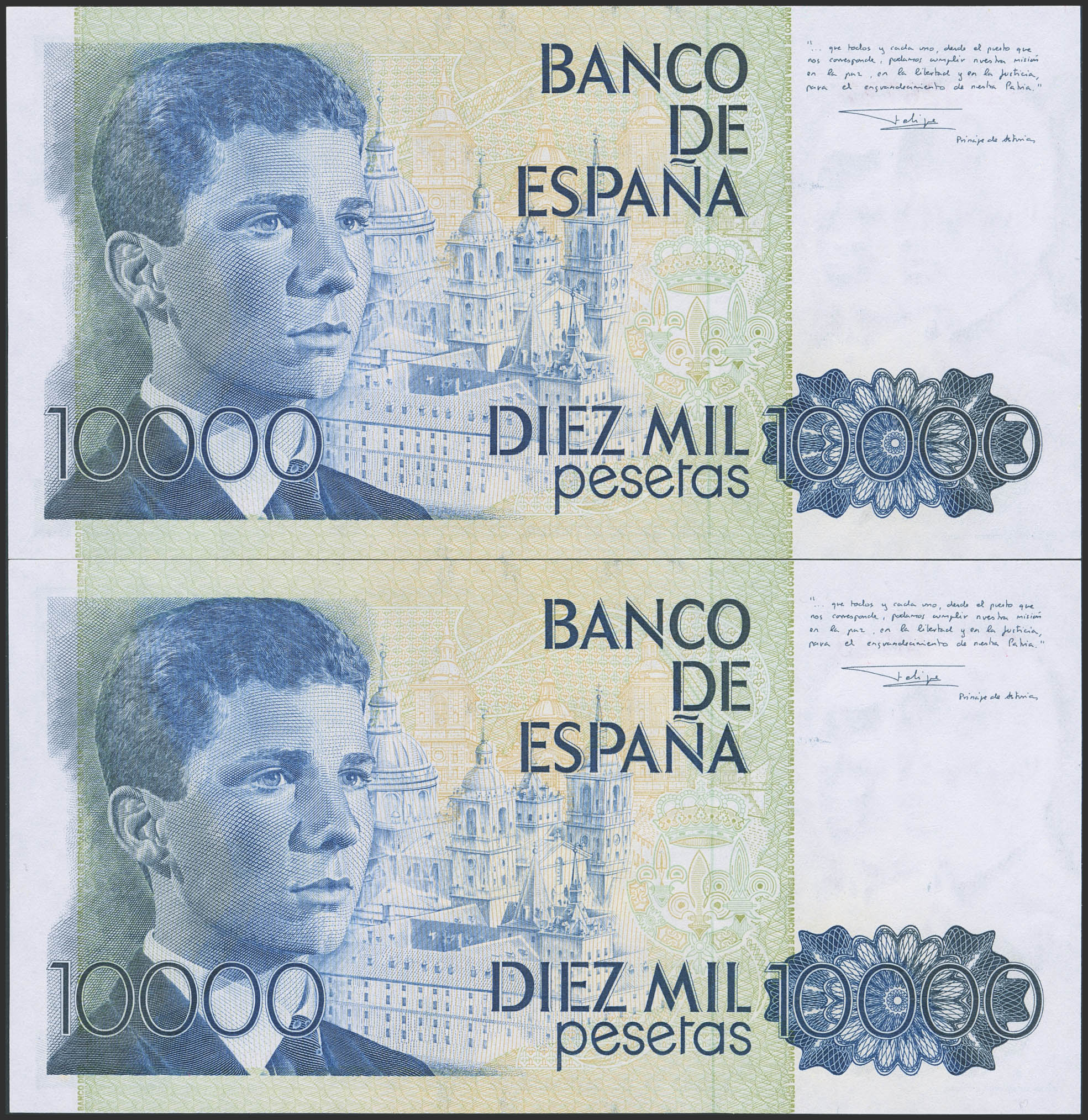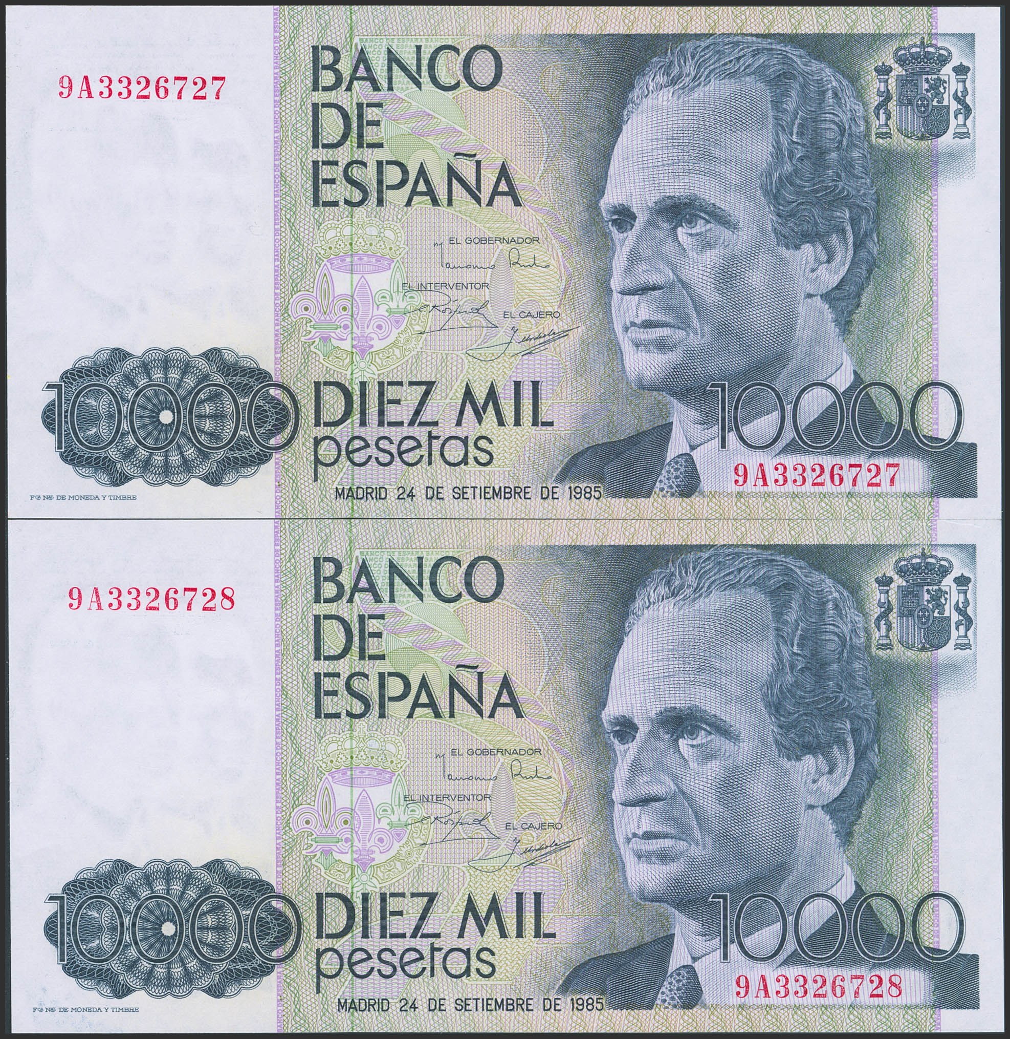 10000 Pesetas. 24 de Septiembre de 1985. Pareja correlativa. Serie especial 9A. (Edifil 2023: 481b). Ondulación natural del proceso de fabricación (este es el único motivo de "quitarle" el SC). EBC+.