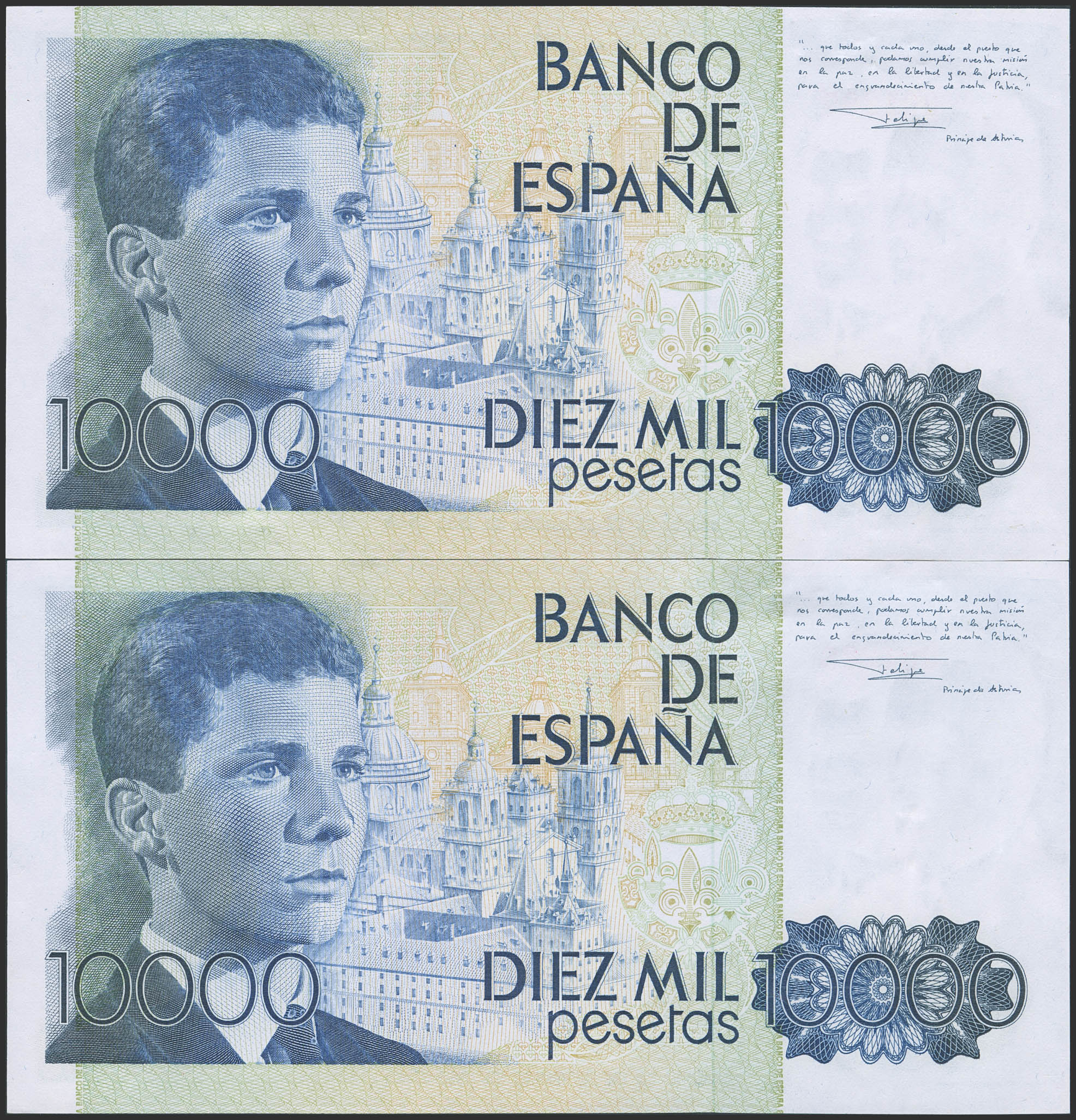 10000 Pesetas. 24 de Septiembre de 1985. Pareja correlativa. Sin serie y numeración muy baja. (Edifil 2023: 481). SC--.