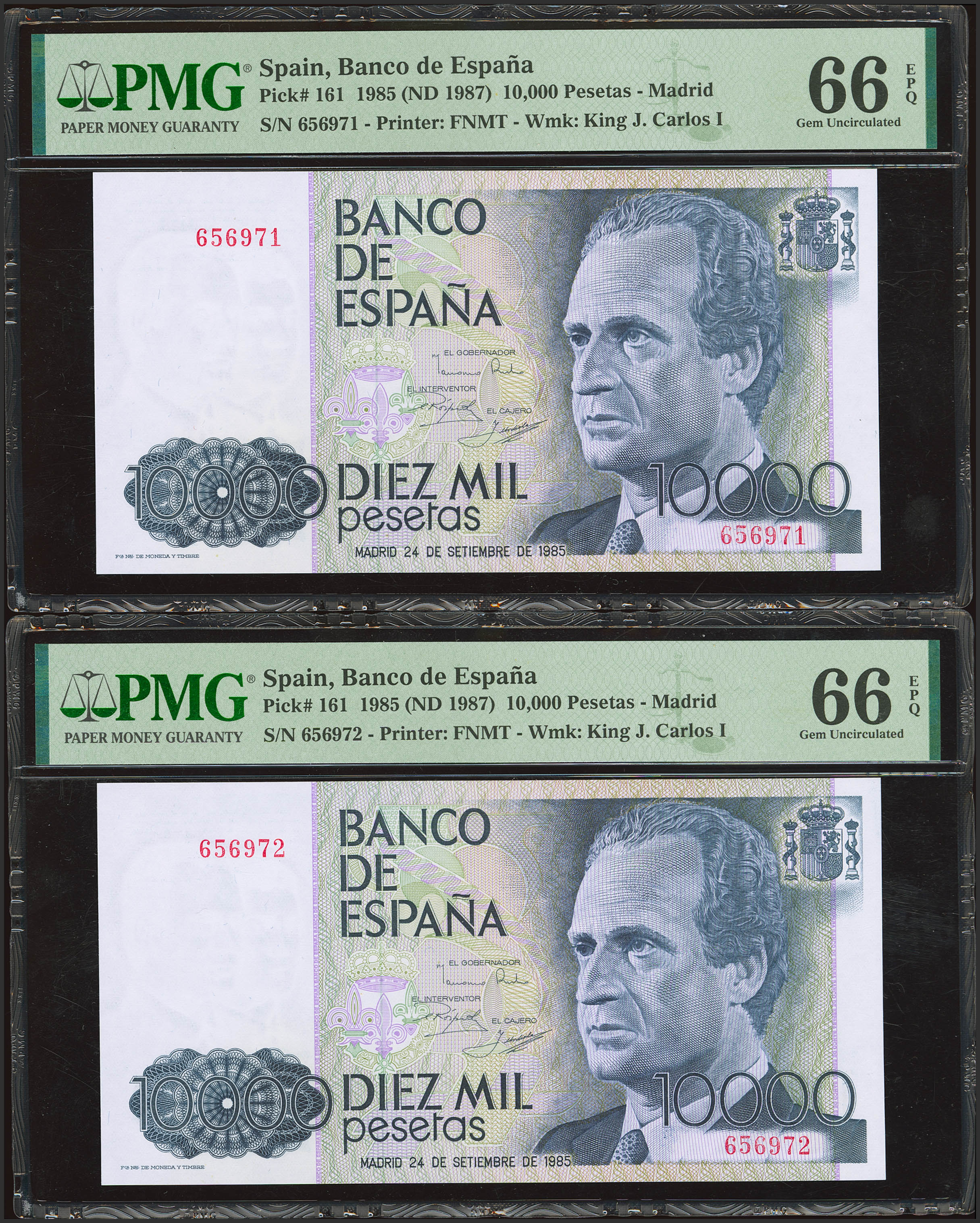 10000 Pesetas. 24 de Septiembre de 1985. Pareja correlativa. Sin serie. (Edifil 2023: 481, Pick: 161). SC. Encapsulados PMG66EPQ, ambos.