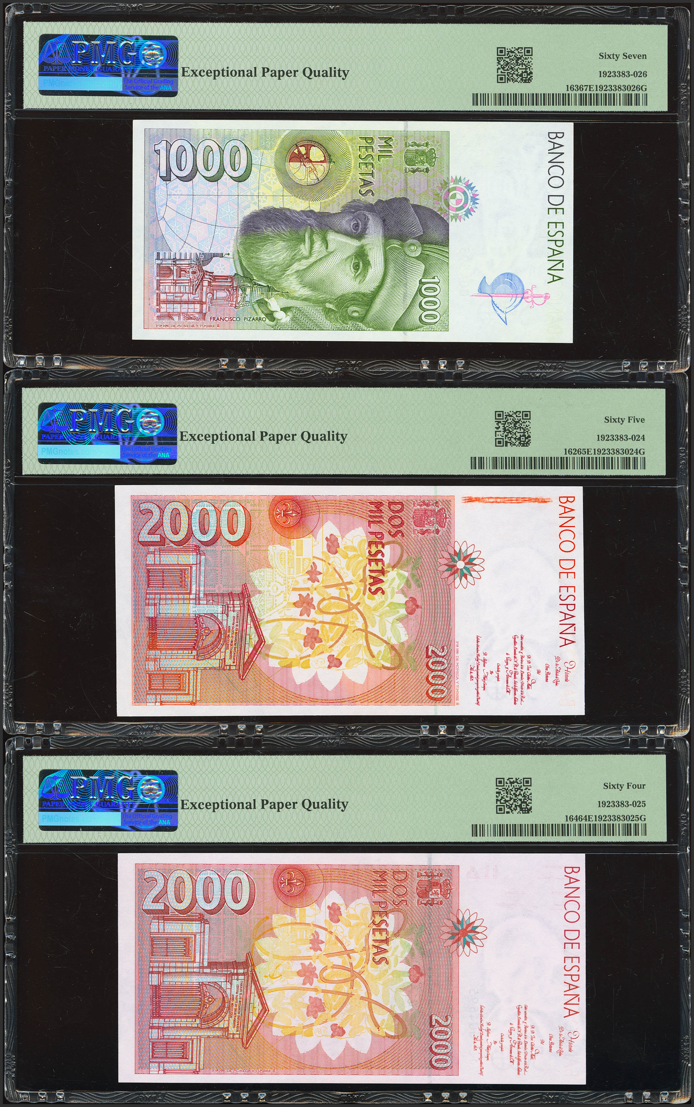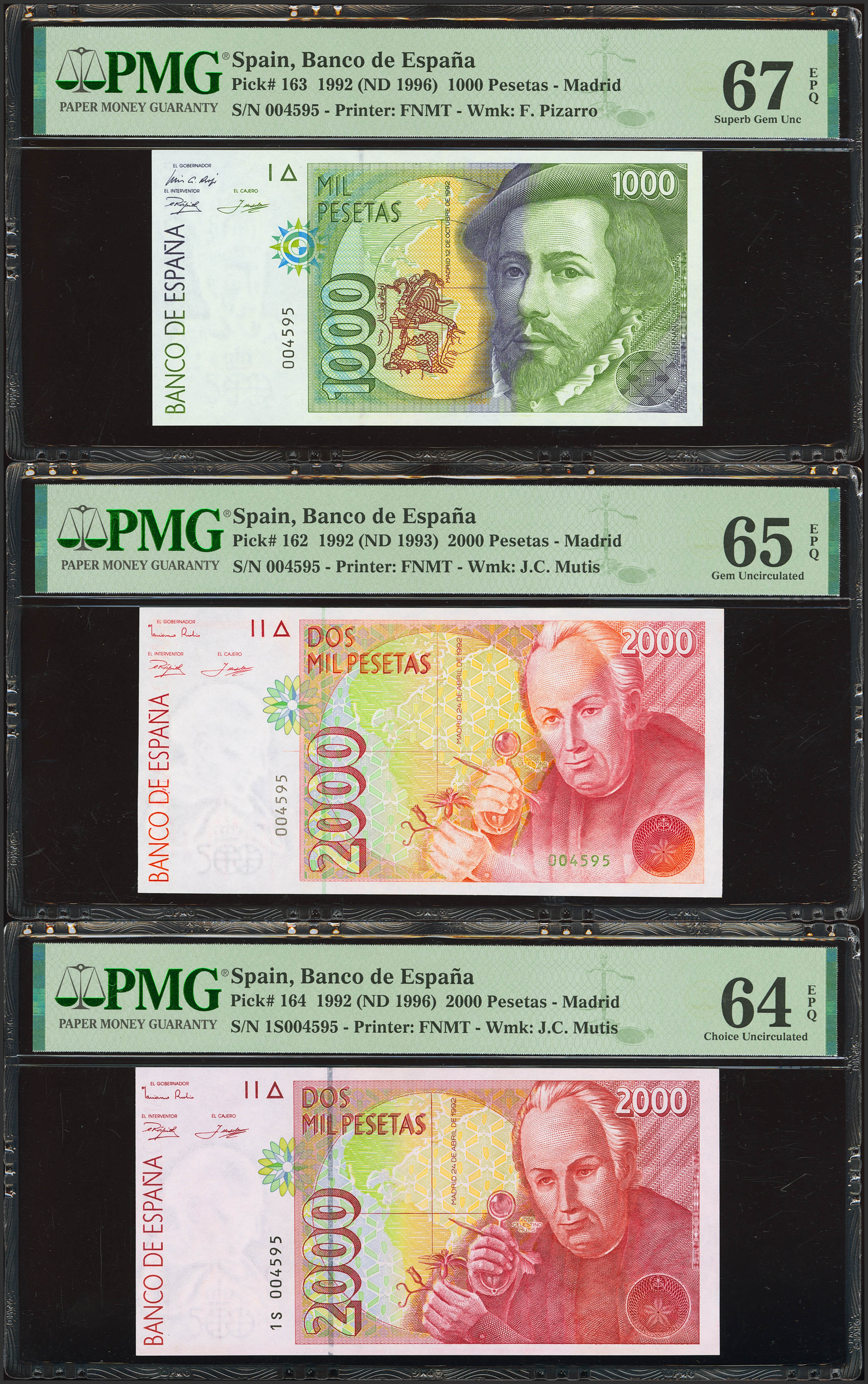 Serie completa de los billetes de 1000, 2000 (además otro con la numeración 1S), 5000 y 10000 Pesetas emitidos en 1992 y todos ellos con el mismo número de serie Nº004595. (Edifil 2023: 482/85, 482A). Raro conjunto. SC. Encapsulados PMG67EPQ, 65EPQ, 64EPQ, 65EPQ, 64.