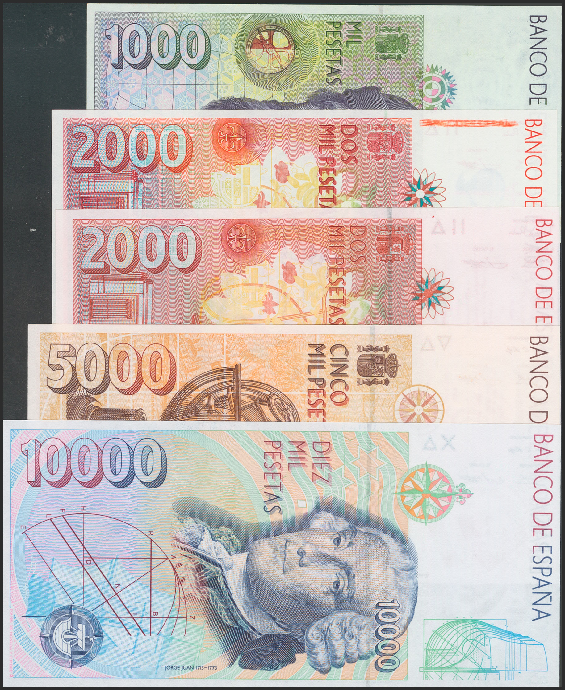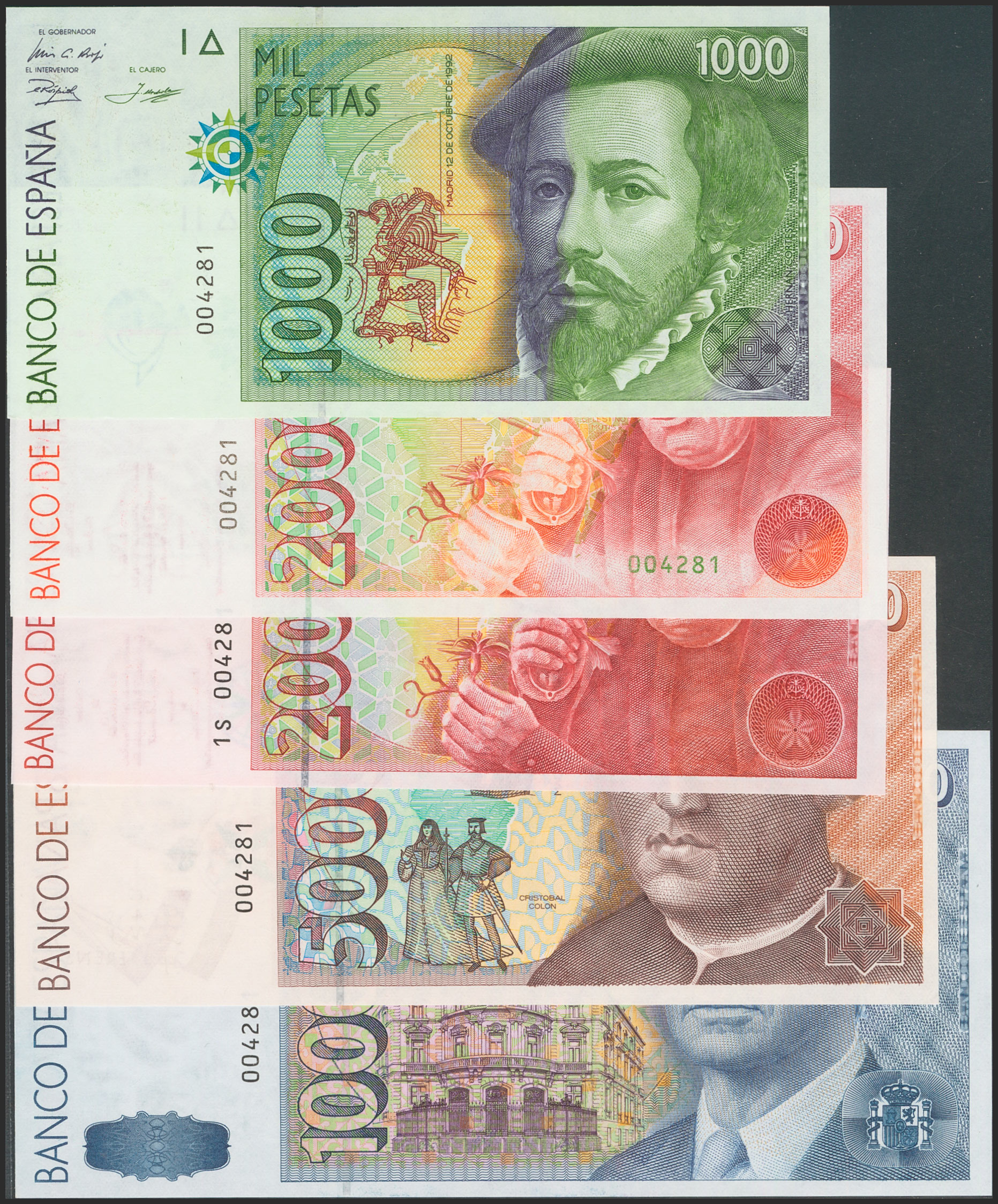Serie completa de 5 billetes de la emisión de 1992 (incluyendo el de 2000 Pesetas de 1995 con la serie 1S). Sin serie y todos ellos con la misma numeración. (Edifil 2017: 482/85, 482A). SC-.