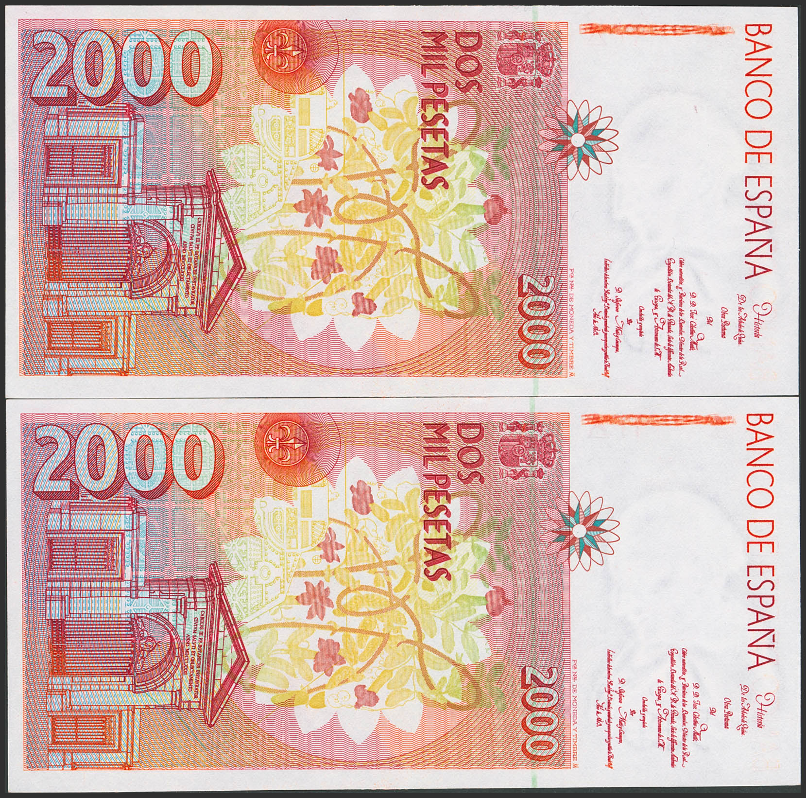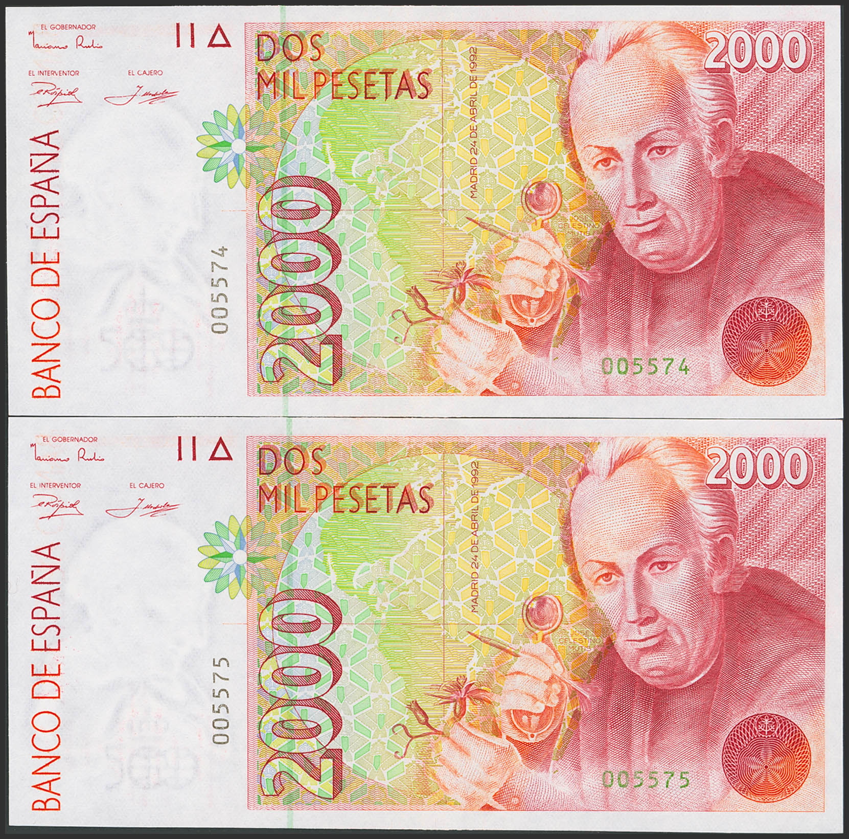 2000 Pesetas. 24 de Abril de 1992. Pareja correlativa. Sin serie y numeración muy baja. (Edifil 2023: 482). SC.