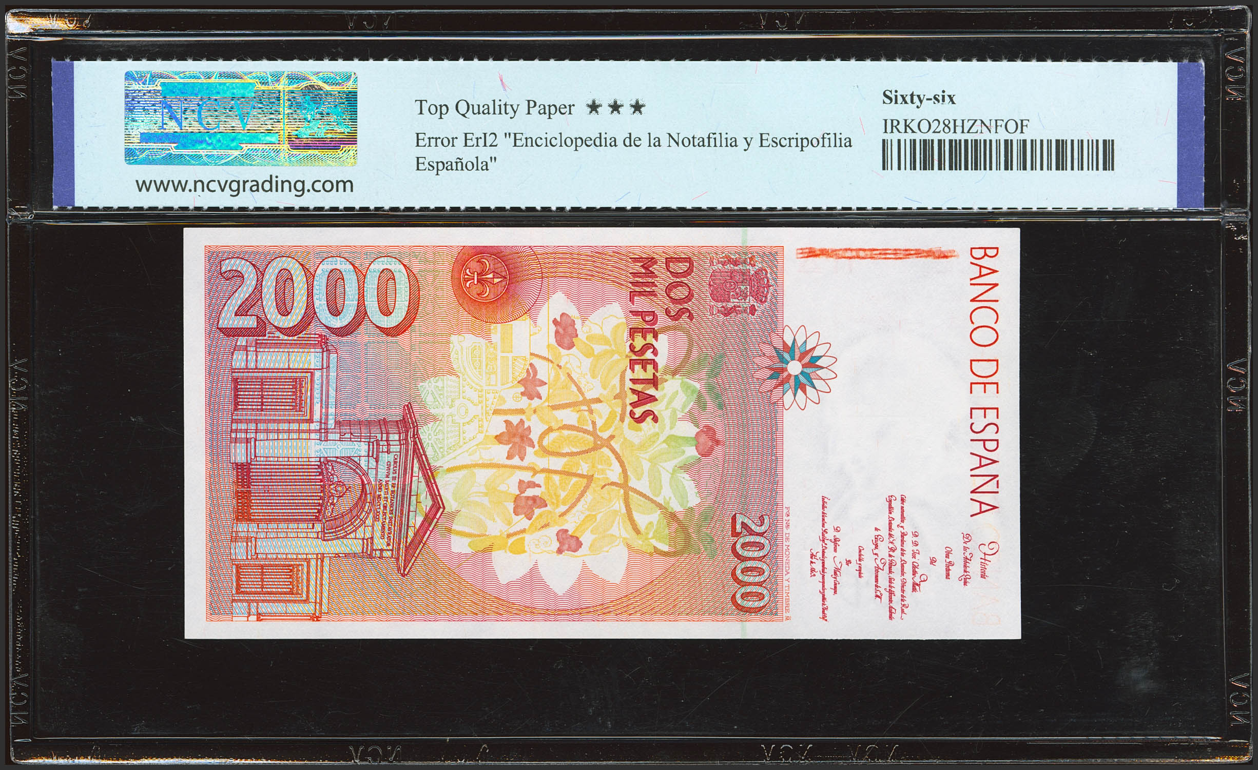 2000 Pesetas. 24 de Abril de 1992. Sin serie. (Edifil 2023: 482, Pick: 162). SC. Encapsulado NCV66TPQ.