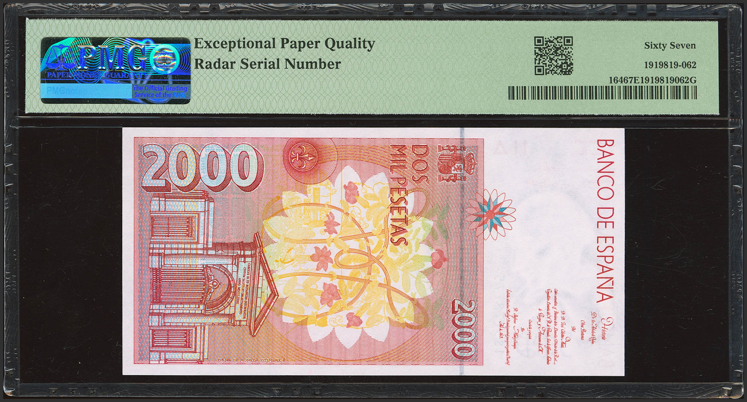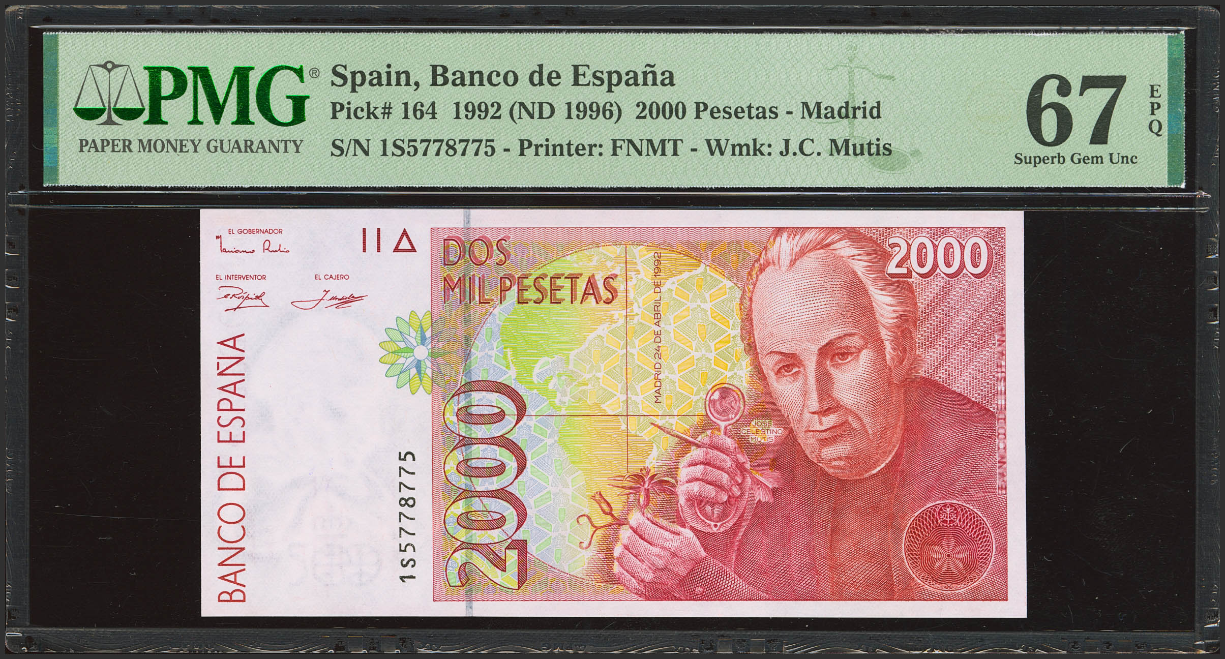 2000 Pesetas. 24 de Abril de 1992. Serie 1S y numeración capicúa. (Edifil 2023: 482A, Pick: 164). SC. Encapsulado PMG67EPQ.