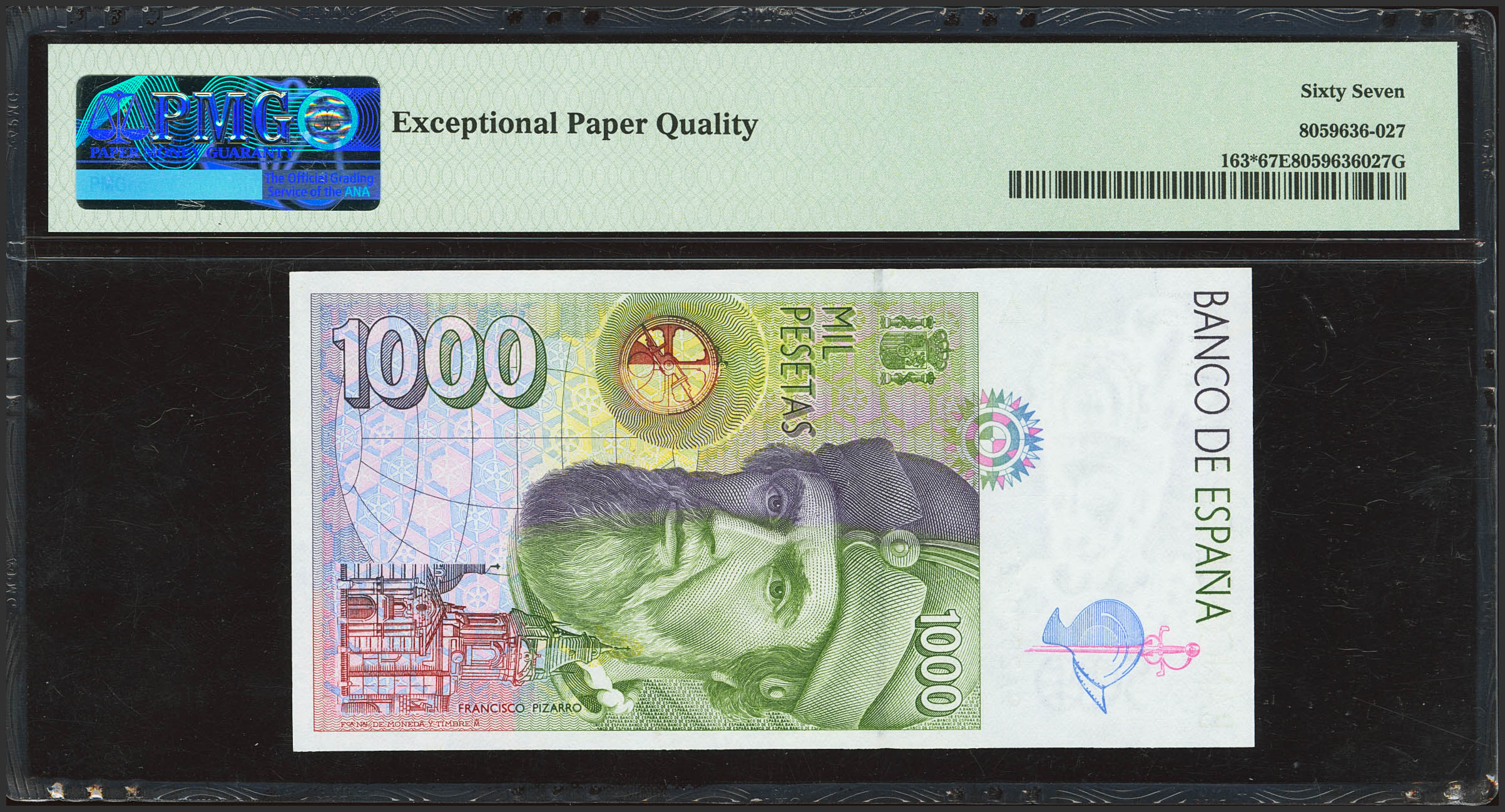 1000 Pesetas. 12 de Octubre de 1992. Serie especial 9A. (Edifil 2023: 483c, Pick: 163*). SC. Encapsulado PMG67EPQ.