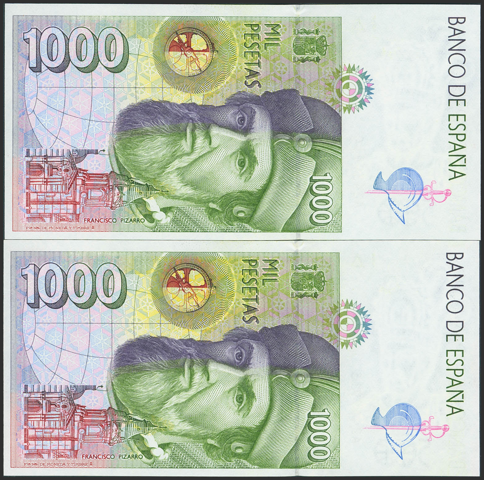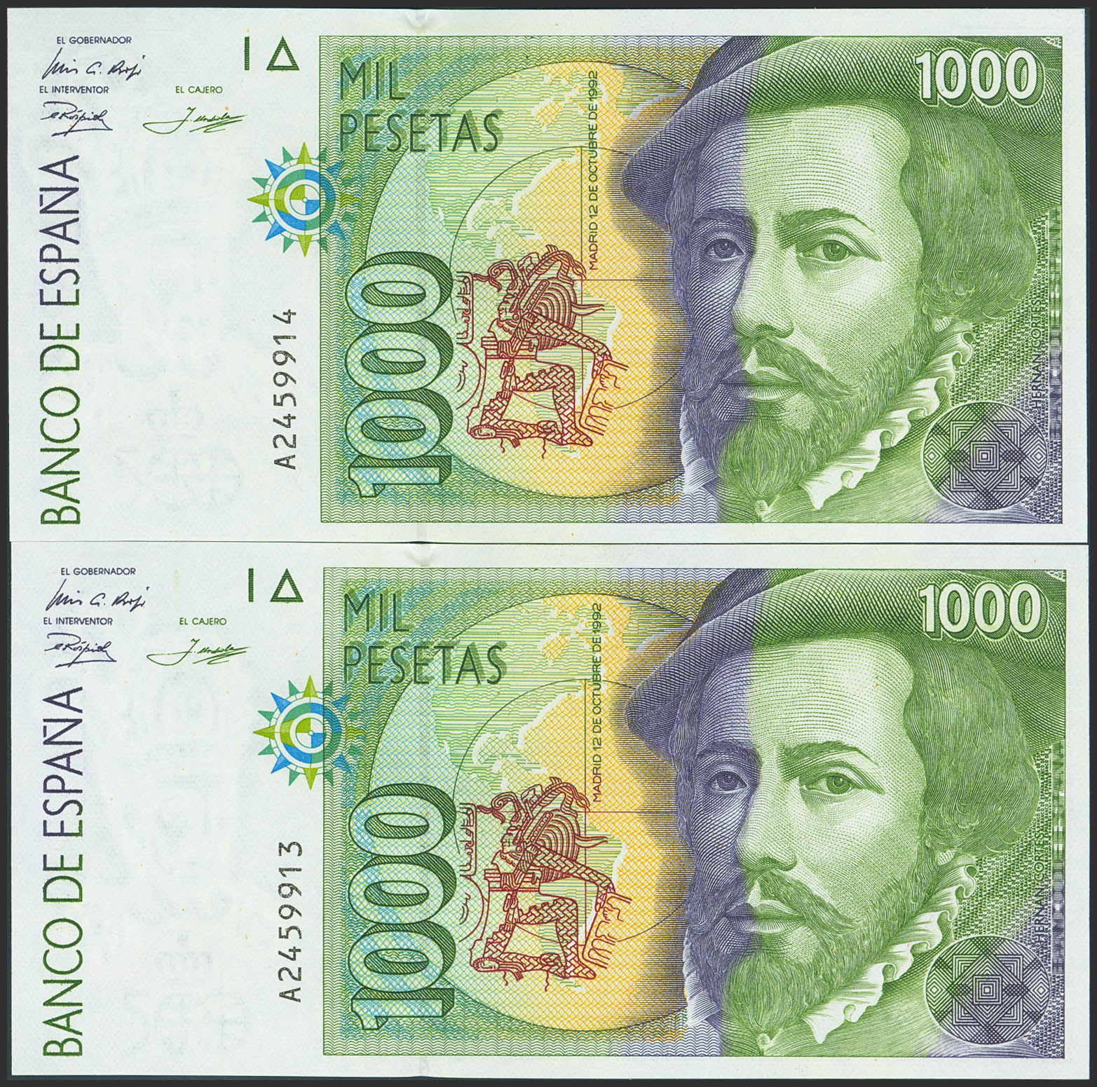 1000 Pesetas. 12 de Octubre de 1992. Pareja correlativa. Serie A. (Edifil 2023: 483a). SC.