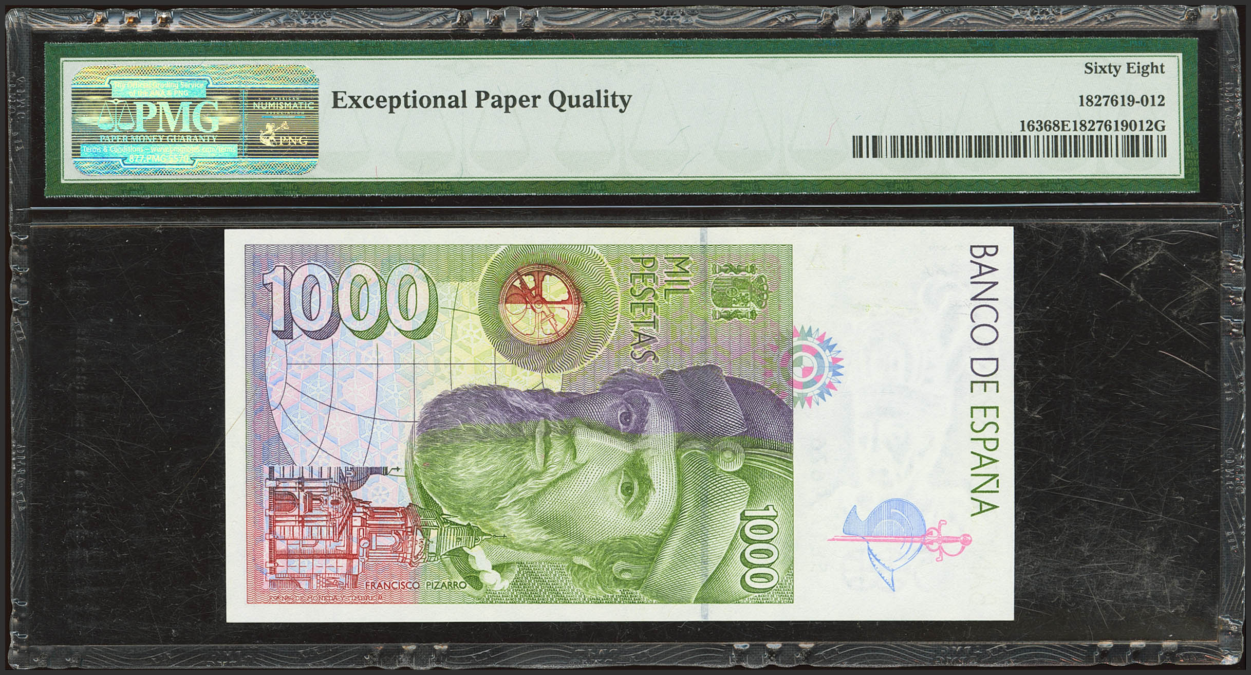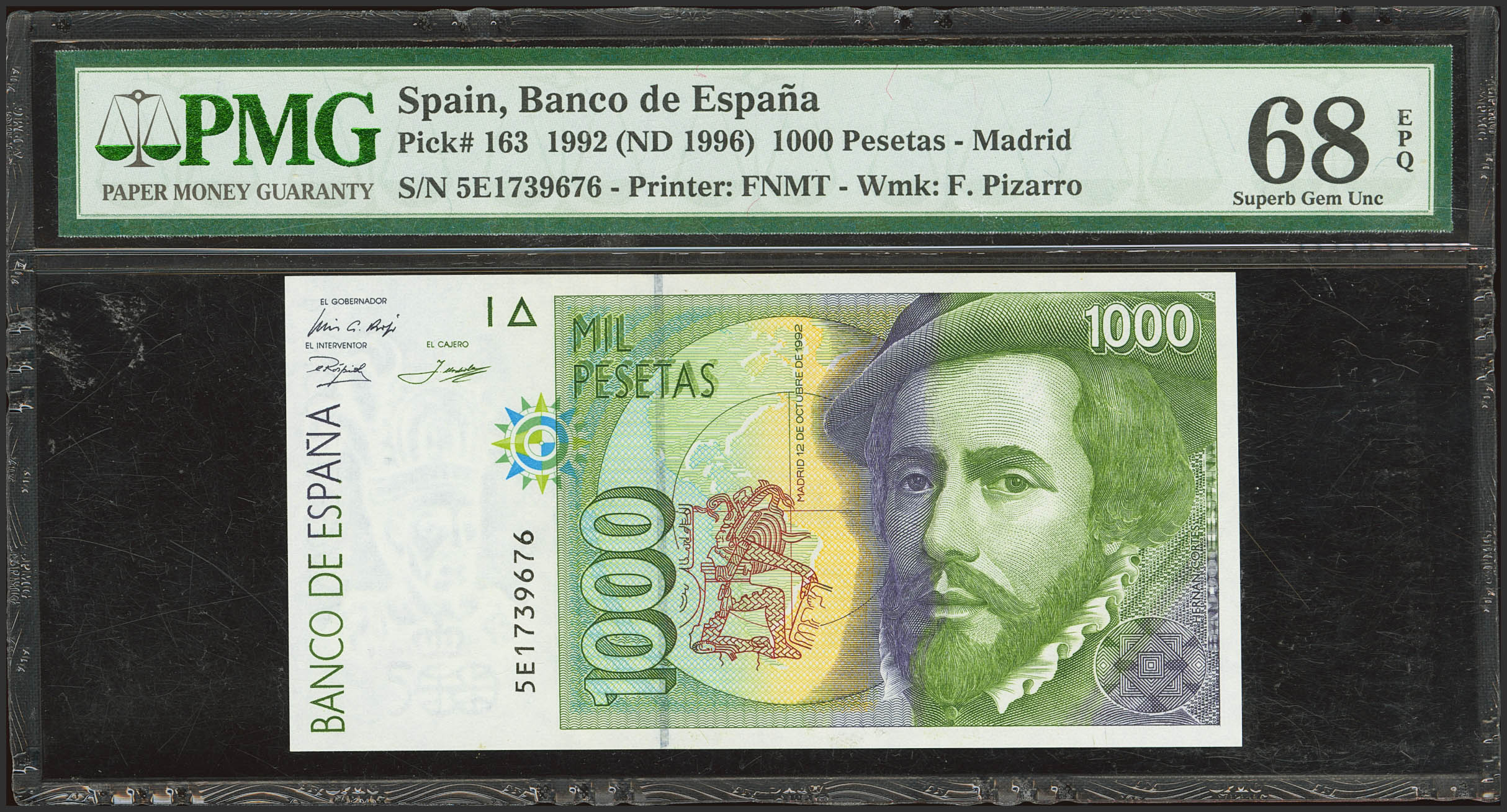 1000 Pesetas. 12 de Octubre de 1992. Serie 5E. (Edifil 2023: 483b, Pick: 163). Raro en esta calidad. SC. Encapsulado PMG68EPQ.