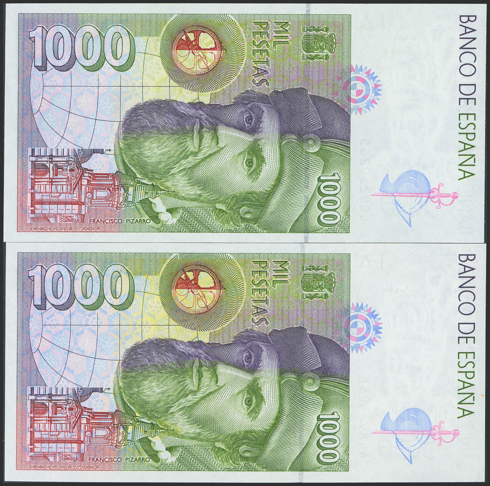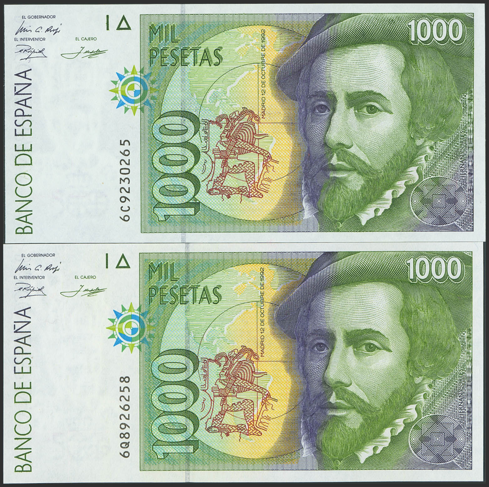 Conjunto de 2 billetes de 1000 Pesetas, emitidos el 12 de Octubre de 1992, con las series 6C y 6Q, (Edifil 2023: 483b). SC.