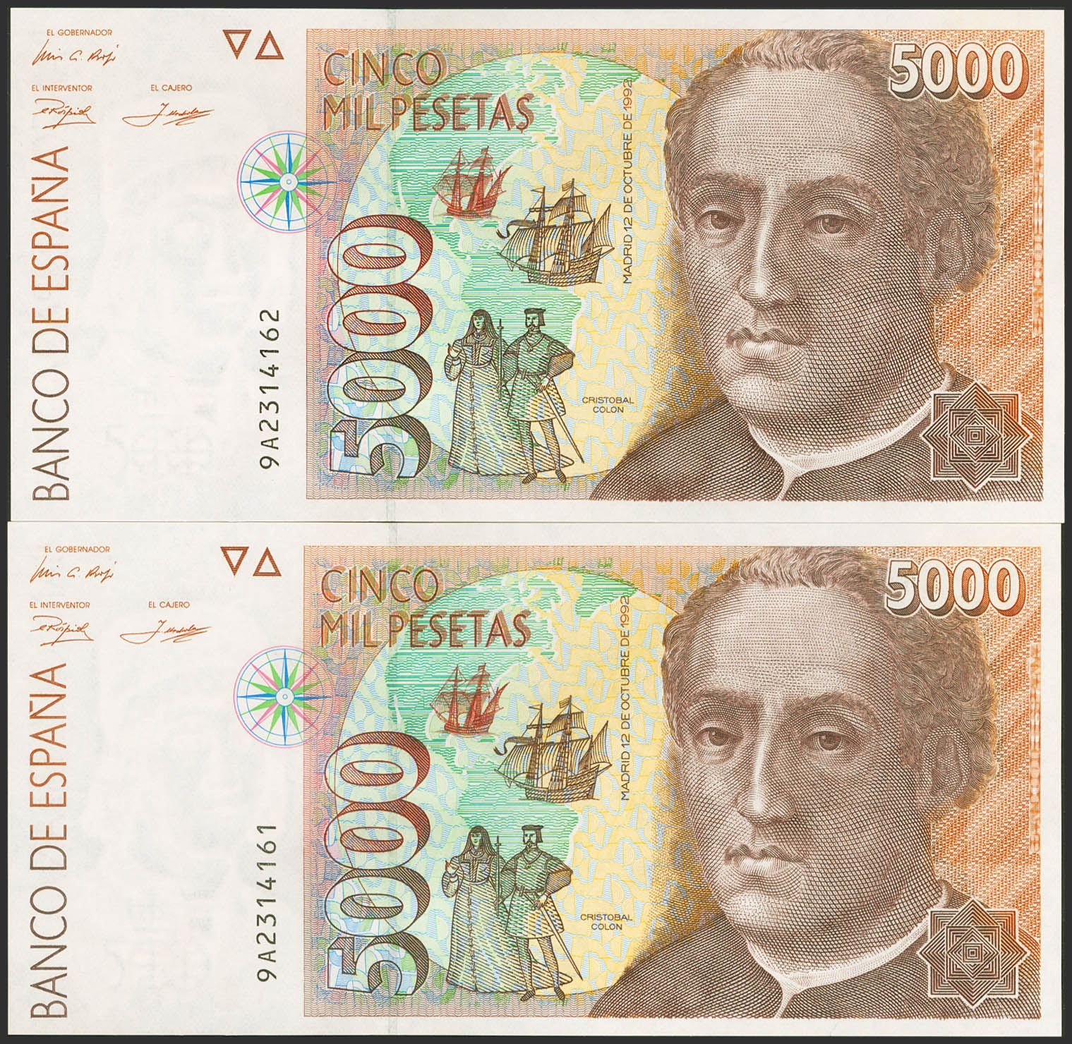 5000 Pesetas. 12 de Octubre de 1992. Pareja correlativa. Serie especial 9A. (Edifil 2017: 484b). SC.