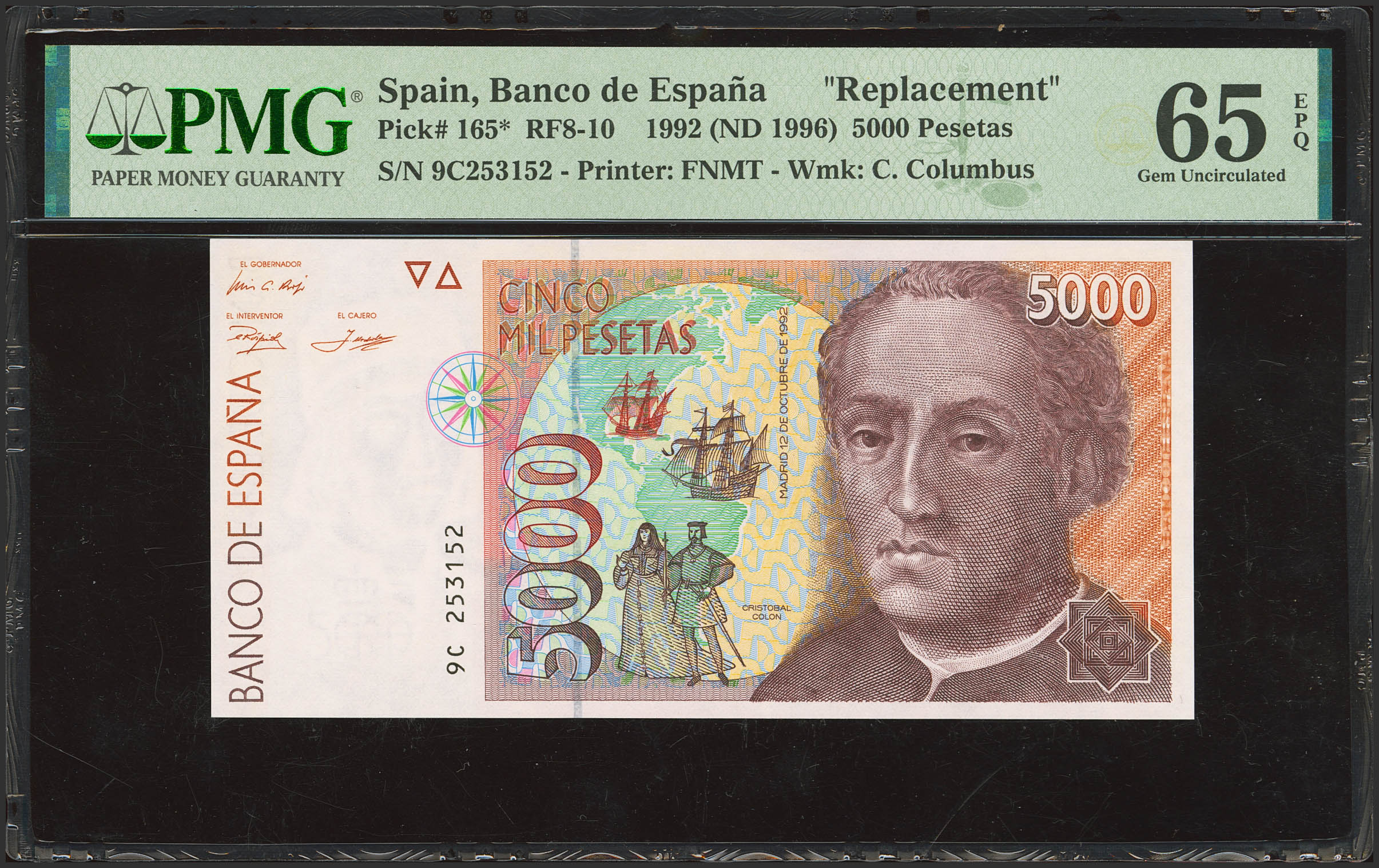 5000 Pesetas. 12 de Octubre de 1992. Serie especial 9C. (Edifil 2023: 484b, Pick: 165*). SC. Encapsulado PMG65EPQ.