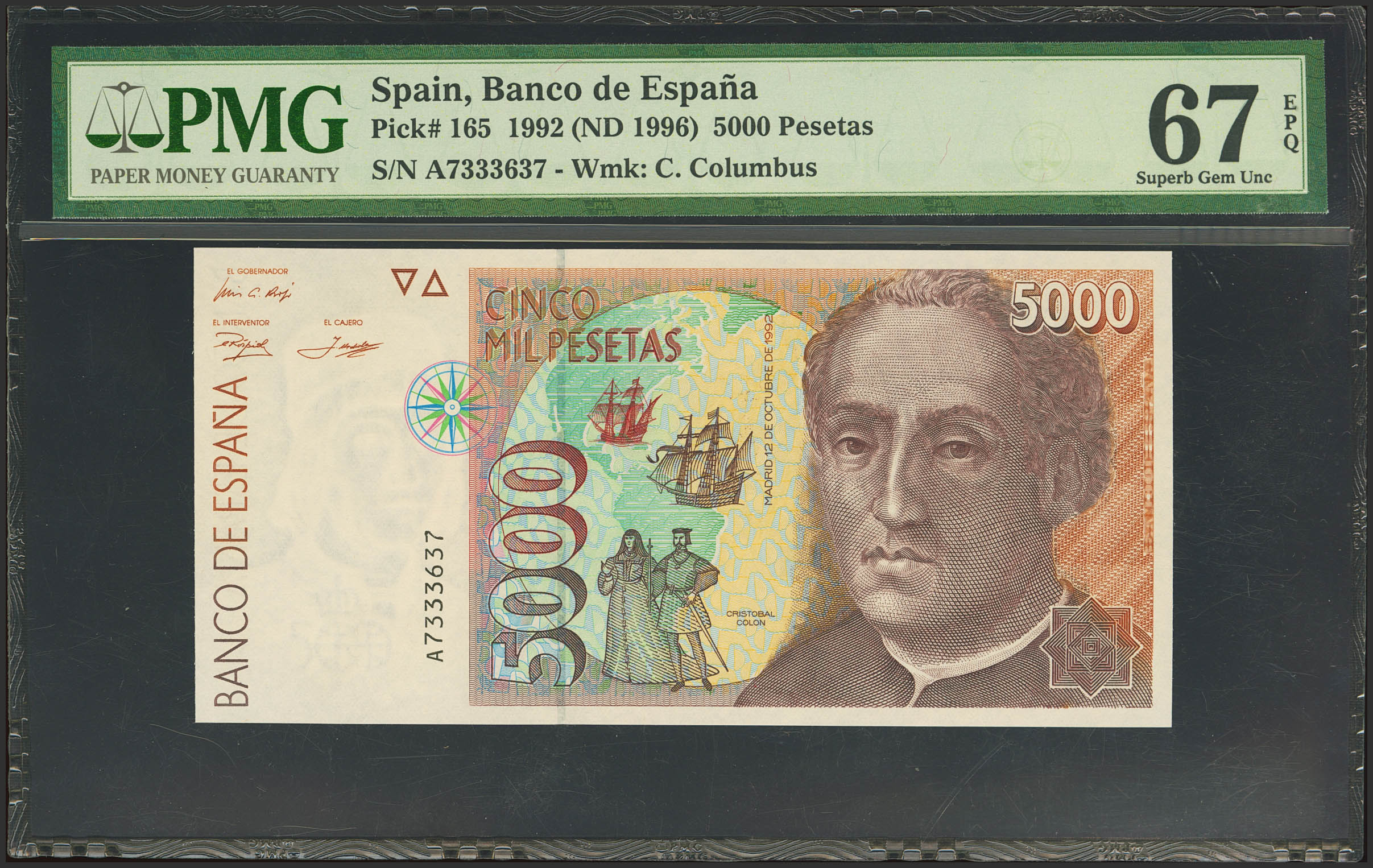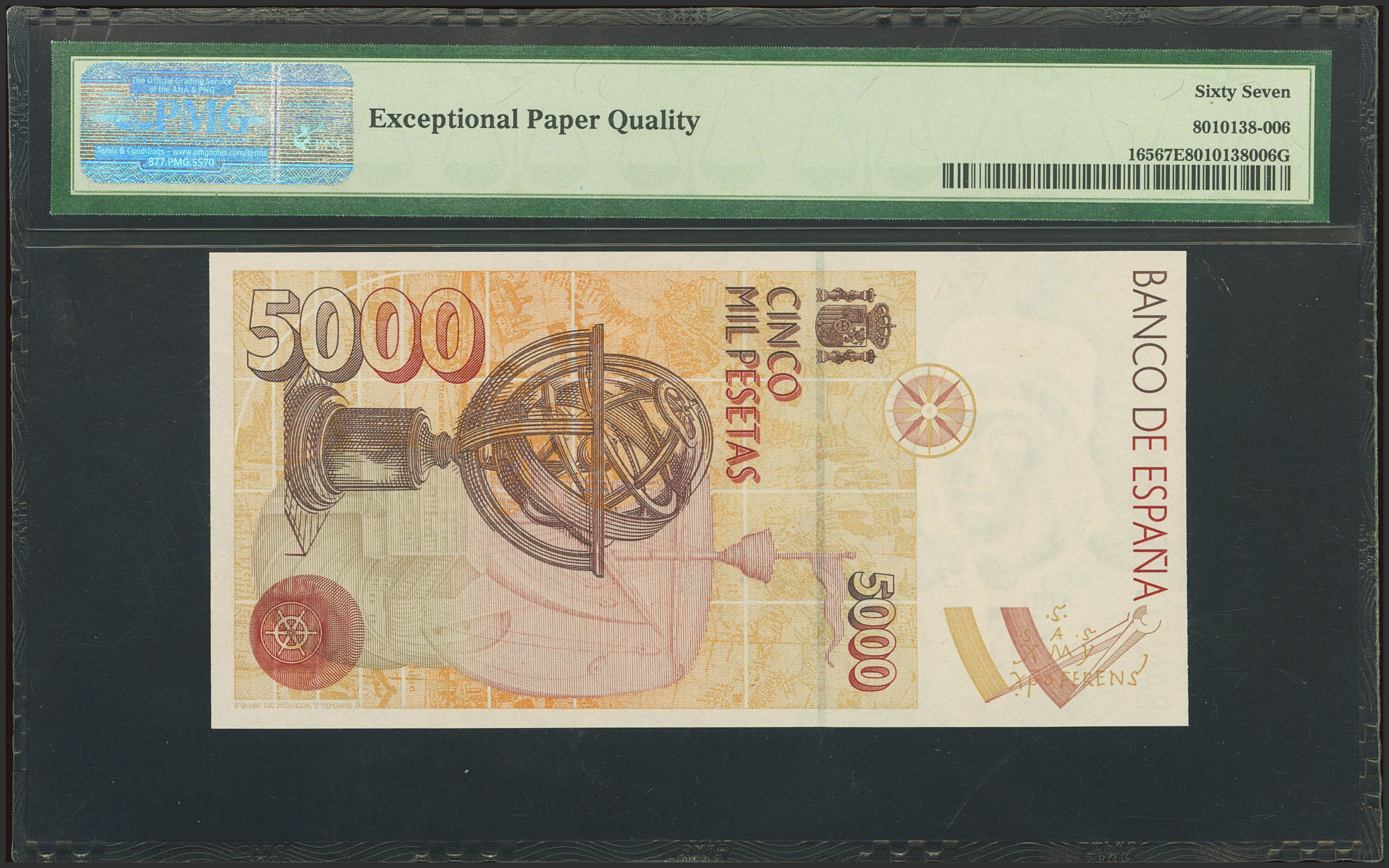 5000 Pesetas. 12 de Octubre de 1992. Serie A. (Edifil 2023: 484a, Pick: 165). SC. Encapsulado PMG67EPQ.