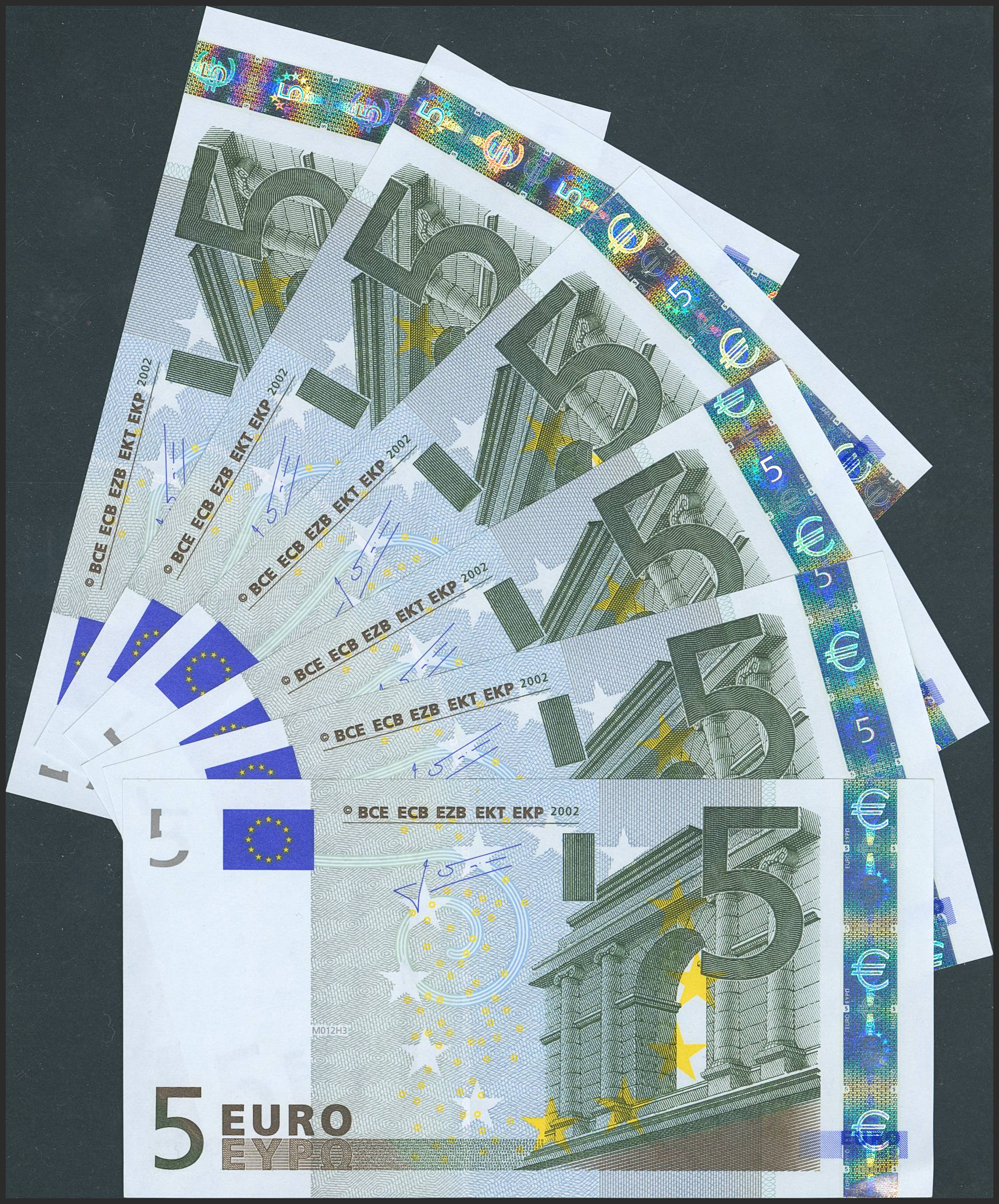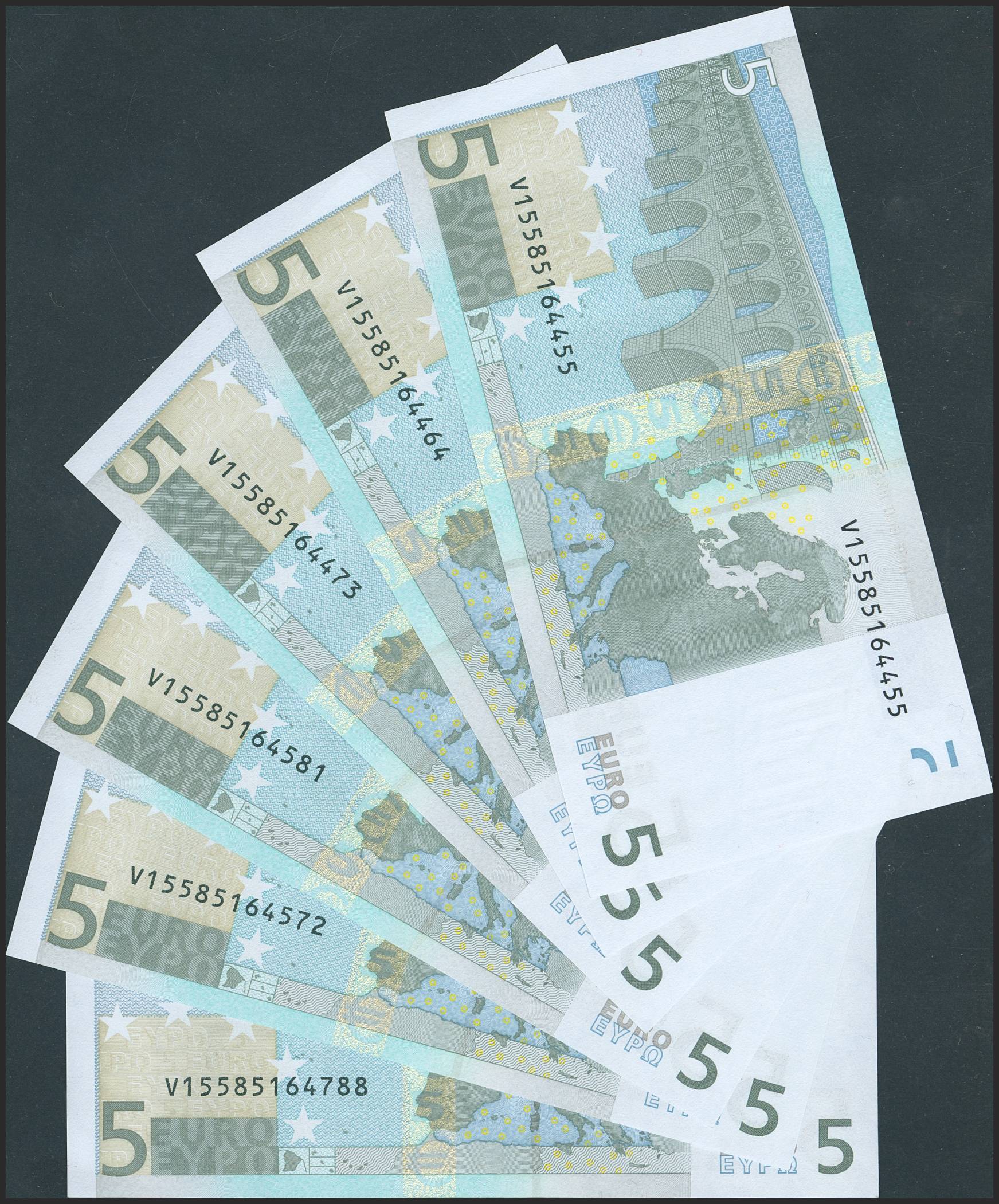 Conjunto de 6 billetes de 5 Euros, algunos correlativos entre sí, emitidos el 1 de Enero de 2002, con la firma Trichet y la Serie V (España), (Edifil 2023: 486A). SC/SC-.